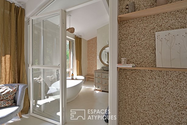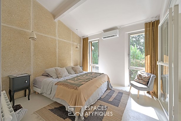The second house, a former painter's studio with a distinct loft feel, is divided into tiers over just under 100 sqm: a sublime suite with its own transparent shower room, then two high-ceilinged living spaces lit by large openings onto the garden.