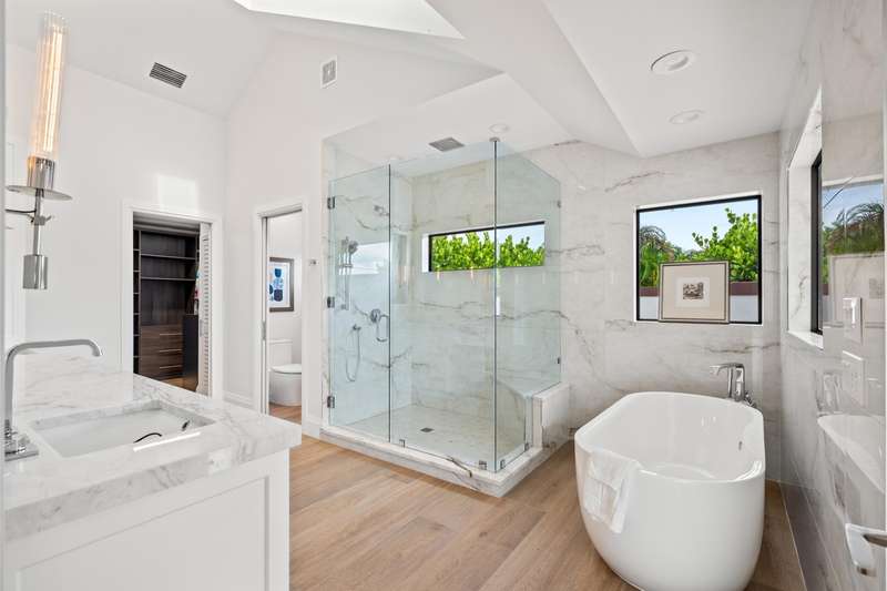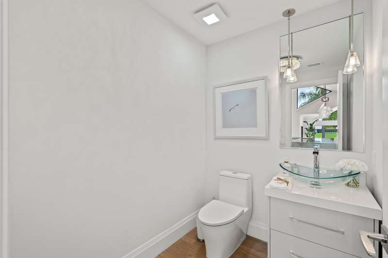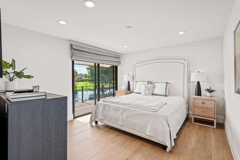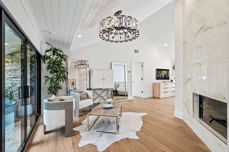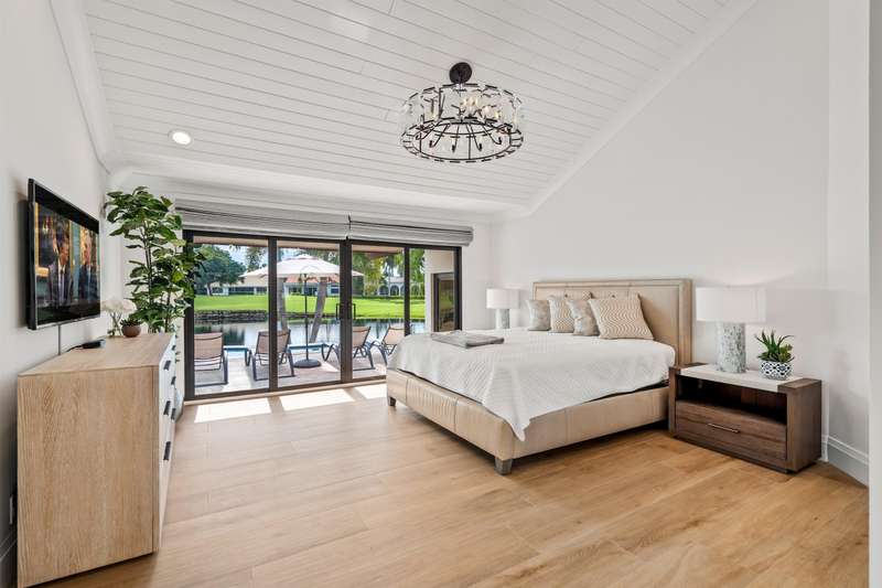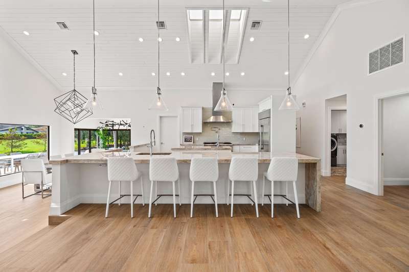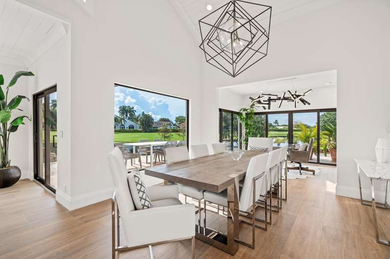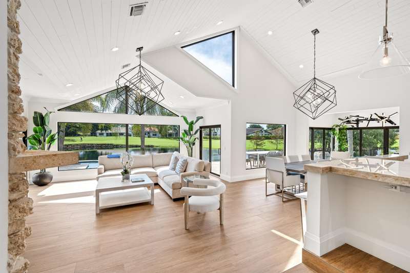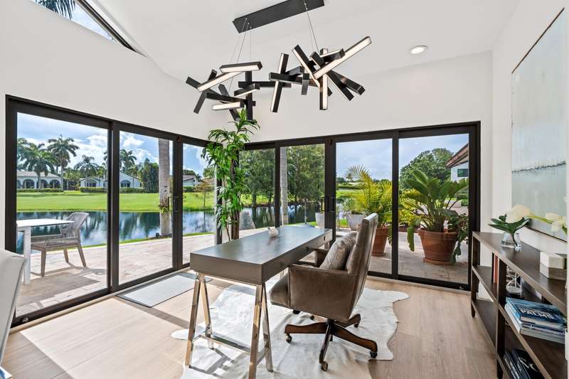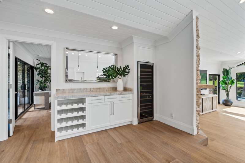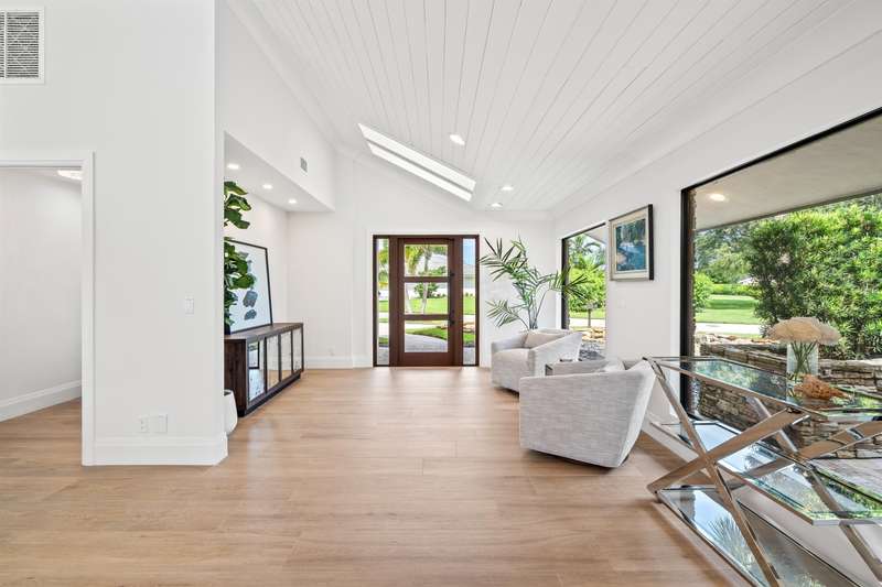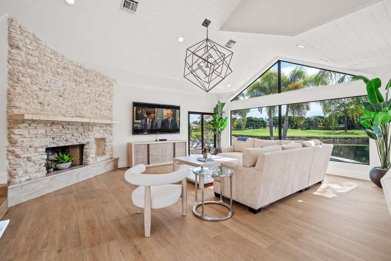 Enveloped within the beauty of its natural setting and defined by luxury, this completely remodeled East Coast style residence captures tranquil panoramic lake and fairway views as well as beautifully manicured fairway vistas from every room. With four bedrooms and spanning 4,714+/- total square feet, details throughout include dramatic tongue-and-groove vaulted ceilings punctuated by skylights, wide-plank washed-oak imported porcelain flooring, and window-walls of impact glass throughout. From the double-door entry, an inviting lounge, with a built-in bar topped by quartzite and featuring a refrigerated wine tower, introduces the dramatic open-floorplan living area of this spectacular residence. The chic great room features tongue and grooved wood vaulted ceiling, a wood-burning