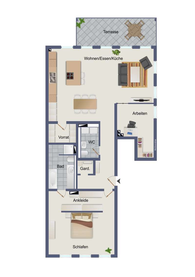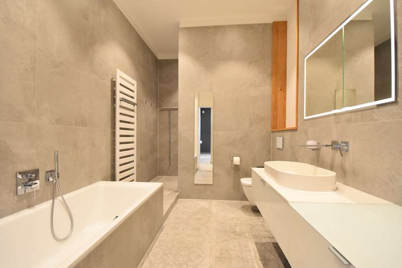 The Marienheim was built in the heart of Speyer in 2015: just a few minutes' walk from the pedestrian zone and the beautiful old town, a construction project was implemented here using state-of-the-art construction methods. The first floor apartment for rent offers you three rooms spread over approx. 162 m² of living space, an elevator provides barrier-free access to all floors of the well-kept apartment building. You enter your new home via a long hallway with a separate checkroom area, which leads you directly into the spacious, open-plan living and dining area with kitchen. The aesthetically pleasing fitted kitchen was handcrafted from oak wood by a carpenter and is equipped with high-quality built-in appliances from Gaggenau and a wine cabinet. Black surfaces create a sophisticated look, the hob on the island is a custom-made product by Bora and has only been sold a few times. An adjoining utility room provides additional space for storage and household appliances. Floor-to-ceiling windows bring plenty of light into the whole area and provide access to the terrace and garden, where you can relax after a long day. The large bedroom with dressing area and en-suite bathroom was created by adapting the space during the construction phase. A bathtub, a wide washbasin and a spacious shower are available to you in your private wellness oasis. A guest WC with connection for washing machine and dryer - also framed in handmade built-in furniture - completes the floor plan. Stylish oak parquet flooring throughout the living area and underfloor heating create a warm and cozy atmosphere. Electric shutters, a ventilation system and air conditioning units ensure comfort and a pleasant indoor climate. You can park your car in the building's own underground garage and your bicycles can be stored in the bicycle cellar.