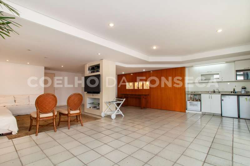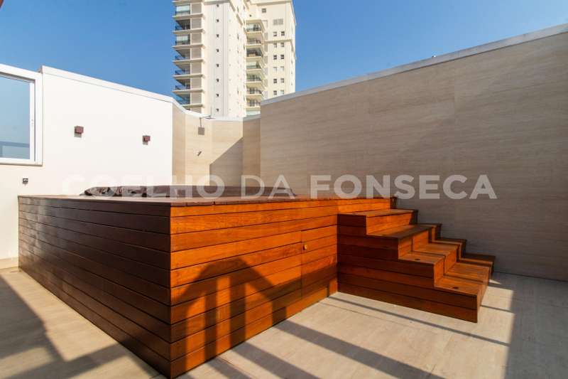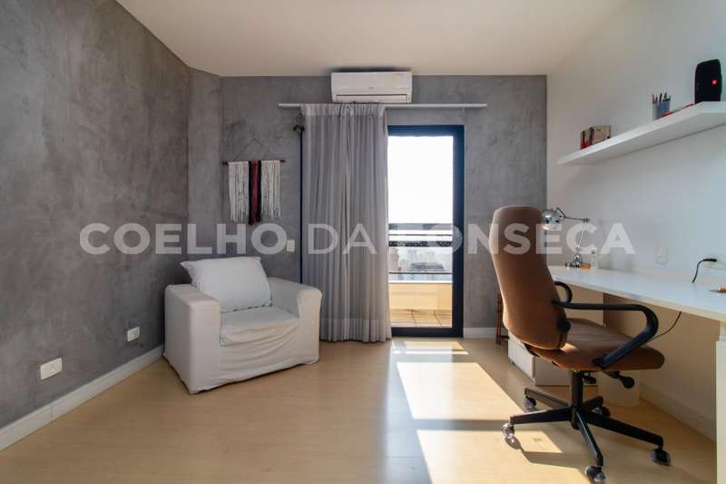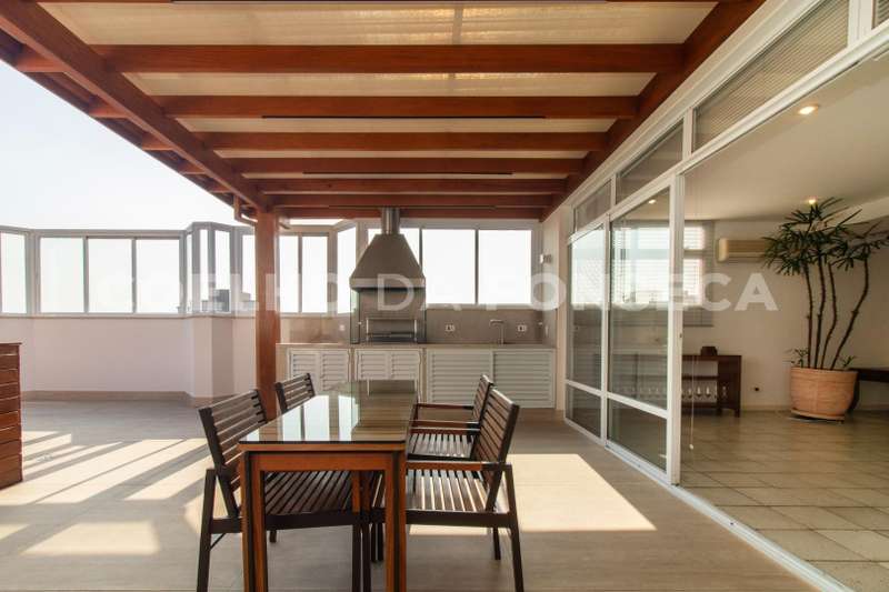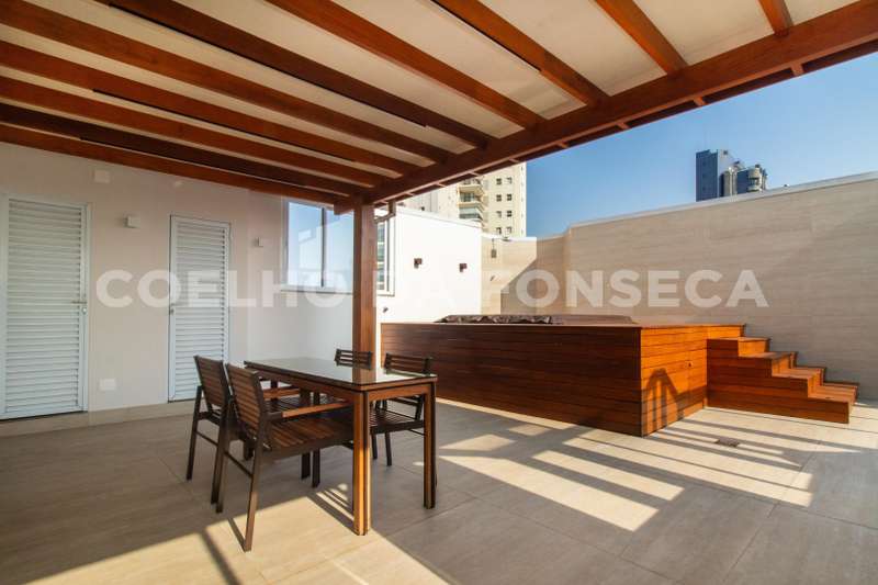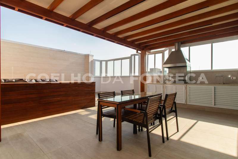 Cobertura duplex com 4 suítes, sendo a principal com 2 closets, escritório, 5 salas. Parte superior possui terraço gourmet, pergolado e deck com spa. Ar condicionado em todos os ambientes. Cozinha com ampla bancada em mármore e 2 pias.
