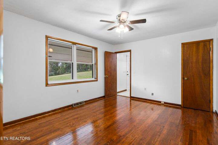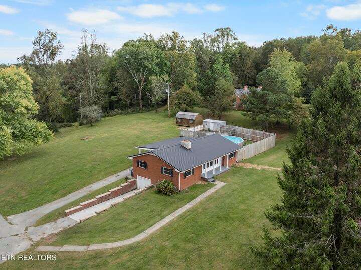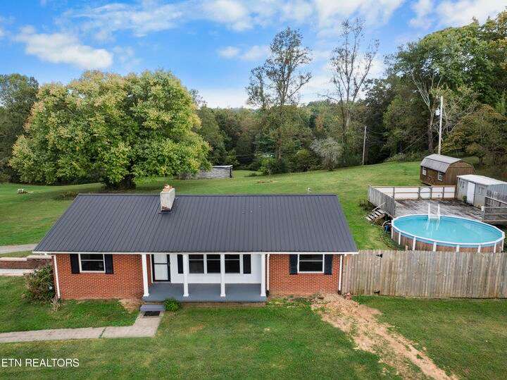 Check out this brick basement rancher sitting on nearly 3 acres of level land! This 3-bedroom, 1.5-bath home features original hardwood flooring and a spacious living room with a wood-burning fireplace, where the large windows frame beautiful views of the Cumberland Mountains. A formal dining area adds to the charm, while a full unfinished basement provides plenty of room for future expansion. The exterior is designed for low maintenance with its durable brick construction and metal roof. Step out back to enjoy the covered porch overlooking the pool - perfect for relaxing or entertaining. This home is ready for your vision - add your updates and style to make it uniquely yours. Located just minutes from ATV trails and Norris Lake, this property offers both convenience and potential. Call today for your private tour!