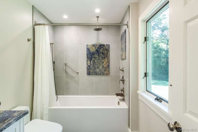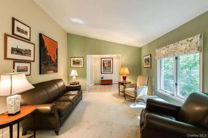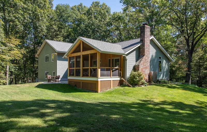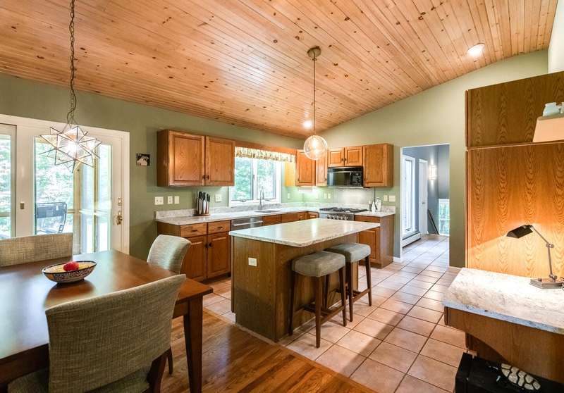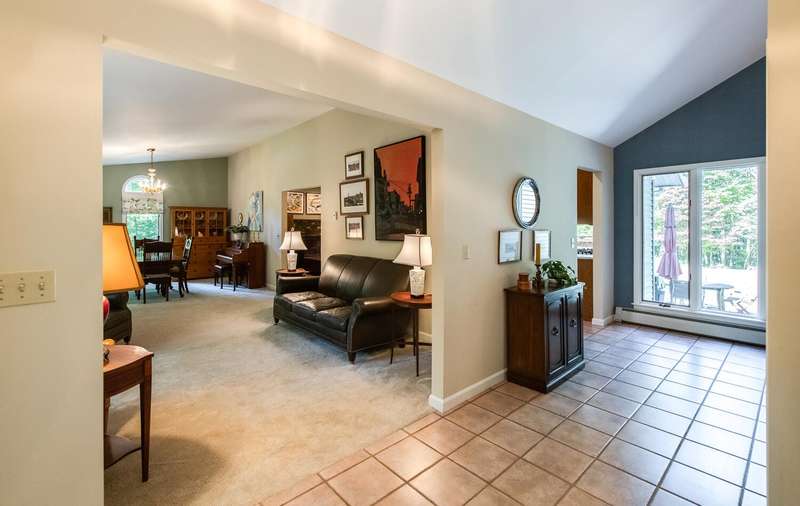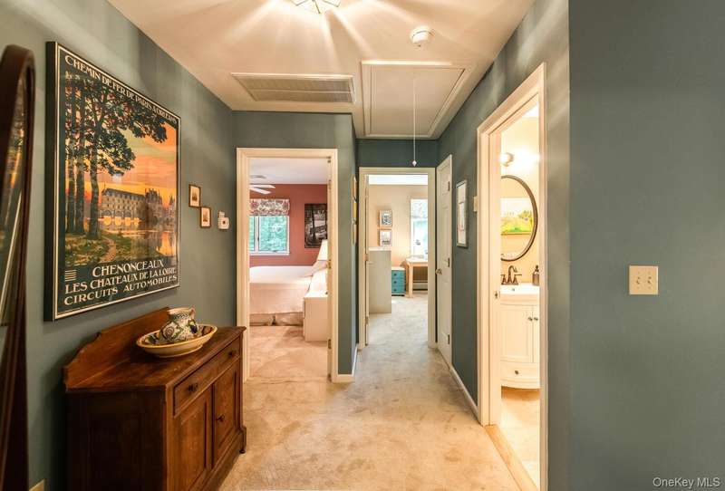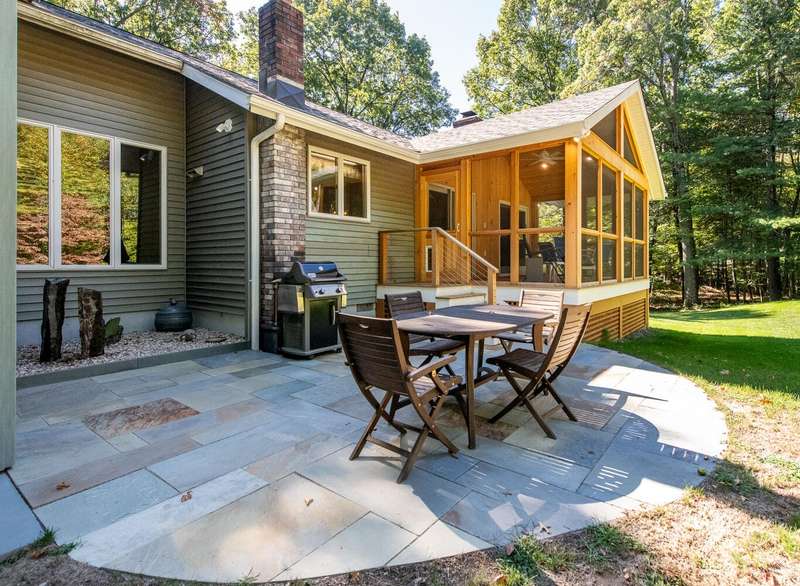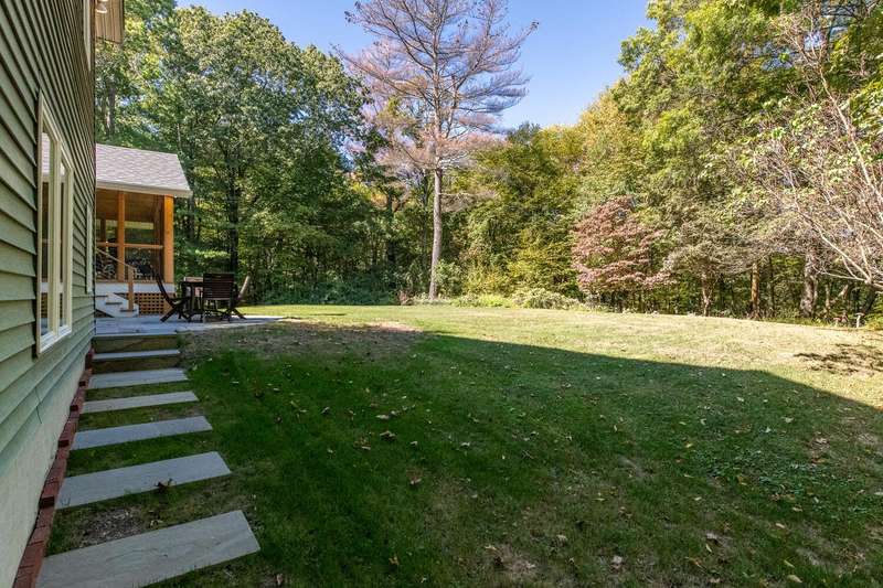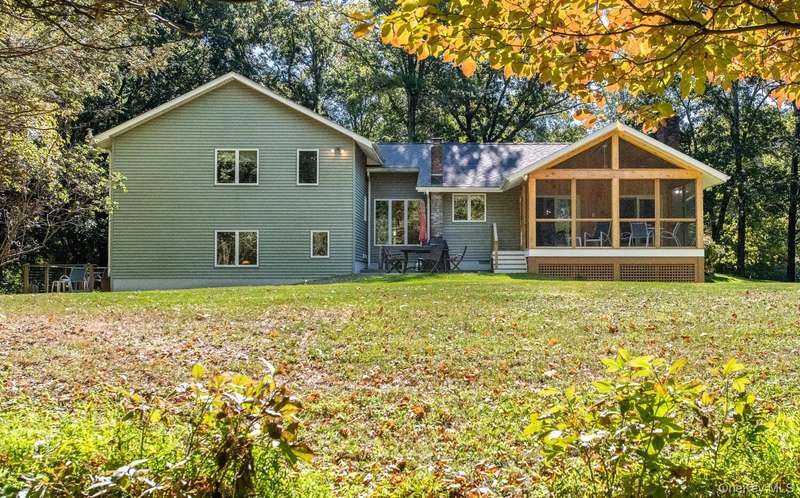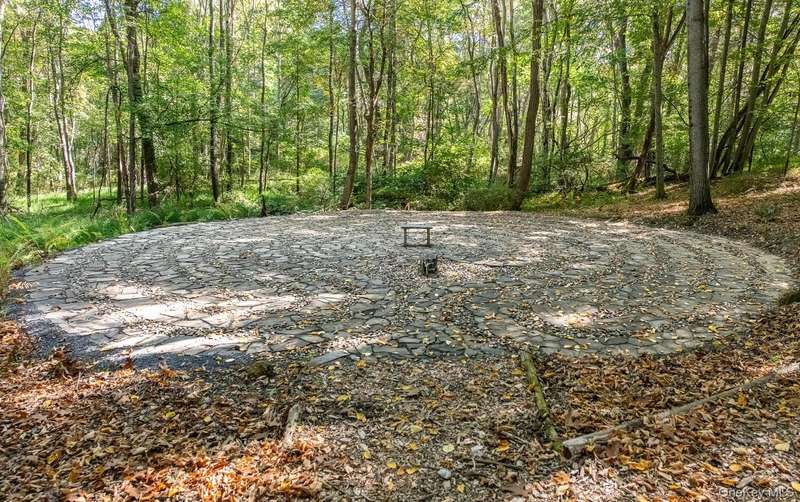 Tucked away at the end of a quiet cul-de-sac and abutting forever-protected land, this inviting home provides rare privacy just minutes from the vibrant villages of Red Hook and Rhinebeck. Resting on 2.33 serene acres with partially landscaped grounds, the house was chosen for its potential as a peaceful retreat. All enhancements to the land and house were done to create the feeling of healing sanctuary. A glorious Japanese maple graces the entrance to the property, and the open lawn invites further landscaping possibilities. Inside, thoughtful updates blend comfort and functionality. The primary suite is a personal haven, featuring a spa-like bath with a clear blue glass vessel sink, vanity and murals of blue mineral, soaking tub, rain and handheld showers, safety bar, ceramic tile flooring, and a bidet toilet. The suite also includes a large walk-in closet with double bars, ten shelves, and natural light from its own window, plus a generous linen closet with suitcase storage. The second full bath offers a beautifully tiled shower with rain and handheld fixtures, bronze accents, and glass door. A stylish powder room features a marble vanity and tiled floor.The homes layout offers versatility with three spacious bedroomsone currently set up as a studio/sewing room/officeand an airy living/dining area with cathedral ceilings. The family room is warmed by a brick fireplace with heat vents, hardwood floors, and a charming pine ceiling, with sliders opening to the brand-new screened porch (2024). A modern deck with cable railing, also added in 2024, extends outdoor living and overlooks a 40-foot bluestone labyrinth in the woods. The deck and porch have mahogany floors, cedar posts and pine ceilings. A new roof was added in 2022. The kitchen is designed for both cooking and gathering, featuring granite counters with a leather finish, a large center island, a built-in desk area, stainless Fisher & Paykel appliances (propane oven/range, refrigerator and dishwasher, new 2018/19), and microwave. A tiled foyer, powder room, and laundry room with washer, dryer, scrub sink, and tile flooring add convenience.The centerpiece of this retreat is the labyrinth, equipped with safe pathways and outdoor lighting to facilitate night-time walks. Crystals are embedded in the four directions corresponding to the elements (north/earth, west/water, south/fire, and east/air) to support the guardianship of the labyrinth and enhance its power as a contemplative tool. The land on this beautiful property has more to give and awaits further discovery.