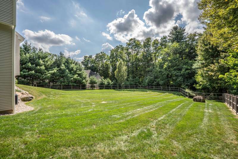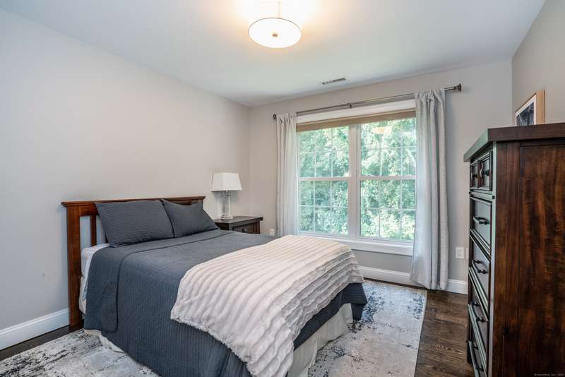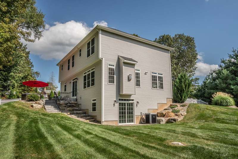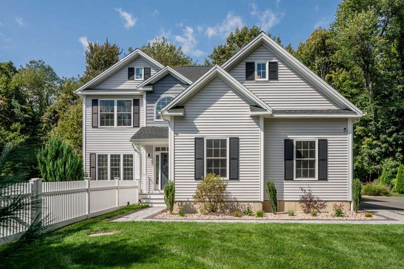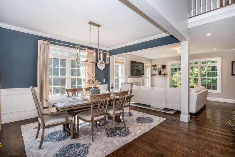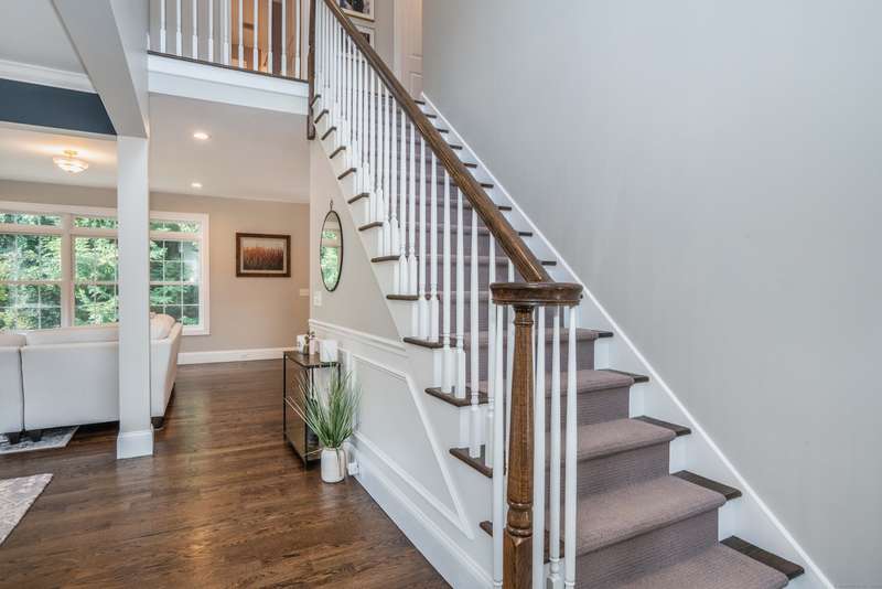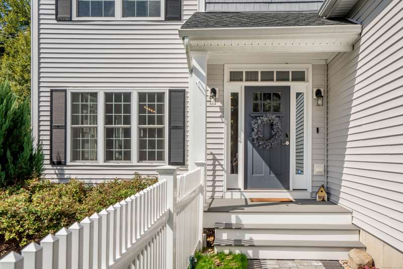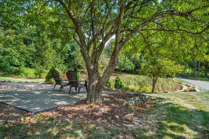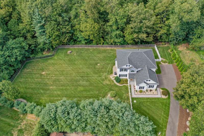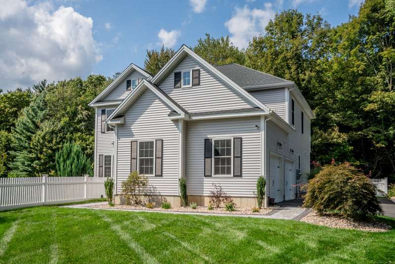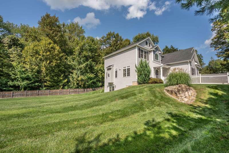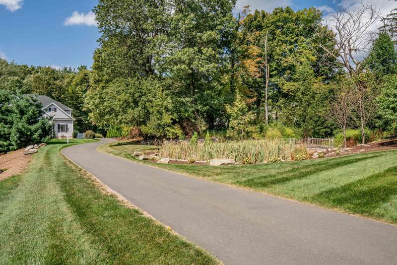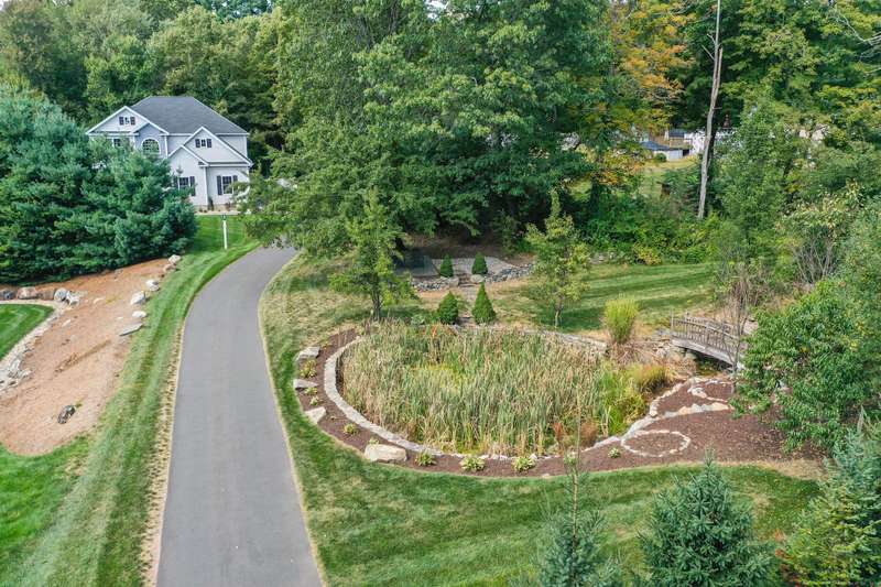 Beautiful custom-built Colonial, nestled on a private rear lot, minutes from wonderful treasures such as the Farmington River Trail and Historic Collinsville. The approach is captivating, highlighted by a water feature, graceful wooden bridge, and seating spot to relax. Professionally designed landscaping and hardscaping surround the home. The extended patio overlooks the large manicured yard, fully enclosed with wood and composite fencing. Inside, every detail was thoughtfully designed. Upgraded lighting and plumbing fixtures, extensive trim work, and rich dark-stained hardwood floors throughout. The open floor plan, enhanced by 9-foot ceilings, creates an airy feel with 180-degree sightlines across the main living spaces. A gas fireplace adds warmth and character to the living room. The stunning kitchen is the centerpiece-featuring custom cabinetry, chef-grade appliances, spacious pantry, abundant counter space, and sliding doors to the expansive patio. A well-appointed mudroom with