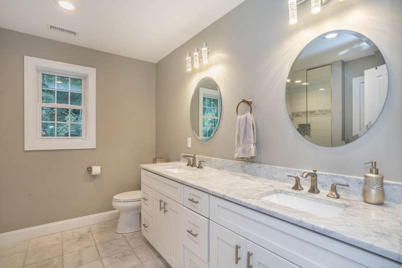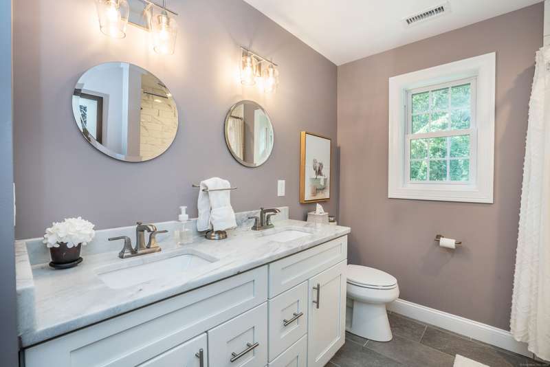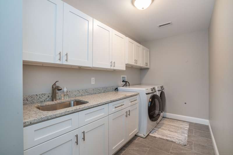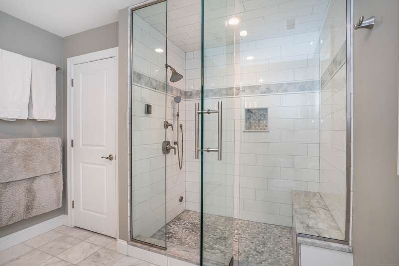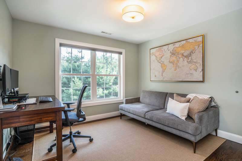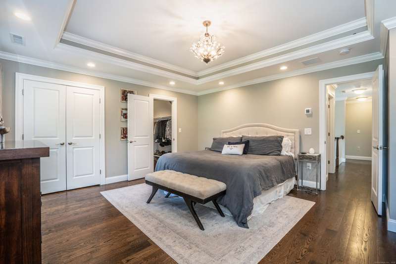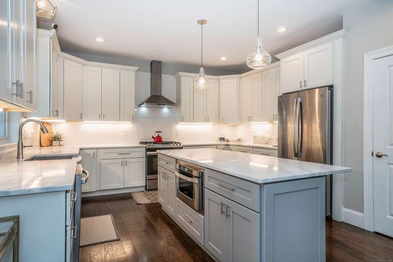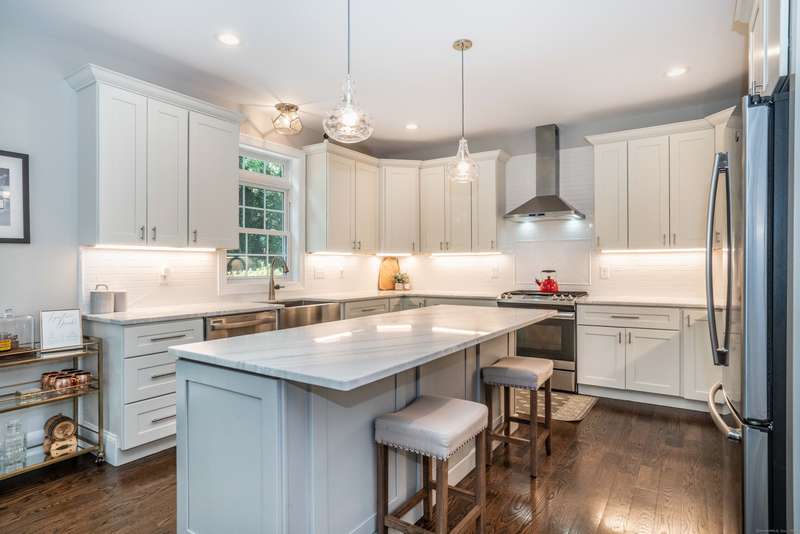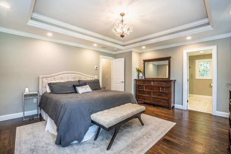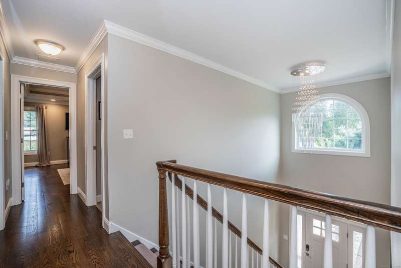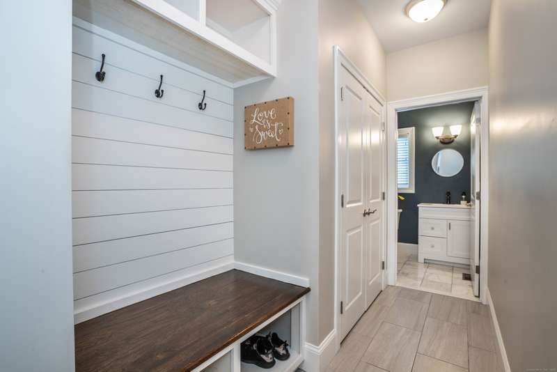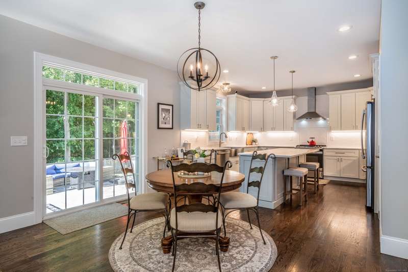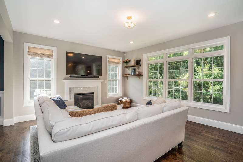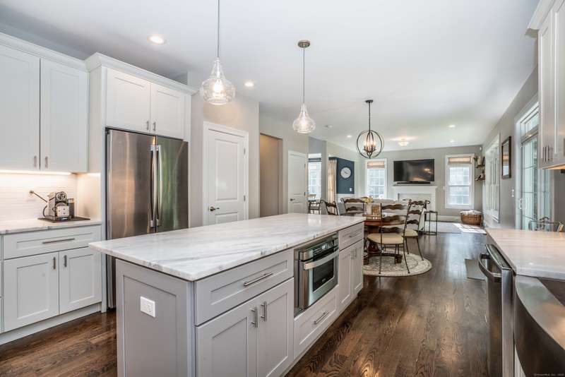 Beautiful custom-built Colonial, nestled on a private rear lot, minutes from wonderful treasures such as the Farmington River Trail and Historic Collinsville. The approach is captivating, highlighted by a water feature, graceful wooden bridge, and seating spot to relax. Professionally designed landscaping and hardscaping surround the home. The extended patio overlooks the large manicured yard, fully enclosed with wood and composite fencing. Inside, every detail was thoughtfully designed. Upgraded lighting and plumbing fixtures, extensive trim work, and rich dark-stained hardwood floors throughout. The open floor plan, enhanced by 9-foot ceilings, creates an airy feel with 180-degree sightlines across the main living spaces. A gas fireplace adds warmth and character to the living room. The stunning kitchen is the centerpiece-featuring custom cabinetry, chef-grade appliances, spacious pantry, abundant counter space, and sliding doors to the expansive patio. A well-appointed mudroom with