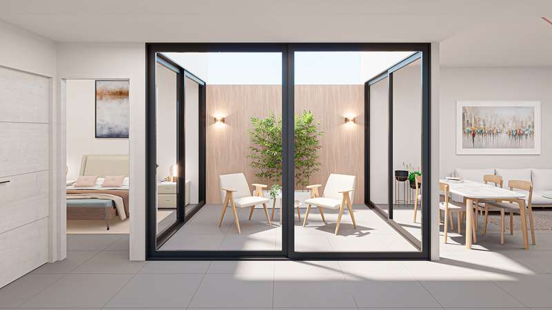 Located within minutes of several golf courses, and a wide range of local amenities, these townhouses in San Pedro del Pinatar are ideal for both permanent living and holiday getaways. Situated just 3.5 km from the sandy shores and the lively Dos Mares shopping center, 5.5 km from the picturesque marina of San Pedro, 8 km from the tranquil San Javier campsite, 14 km from the vibrant La Zenia Boulevard open-air mall, and only 40 km from Murcia’s international airport, these villas perfectly combine coastal elegance with unmatched convenience.