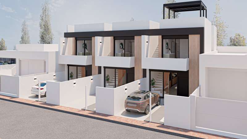 Welcome to a new residential development of three luxurious townhouses in the sought-after area of San Pedro del Pinatar, Murcia. These properties are thoughtfully designed with a modern aesthetic and functional layout.