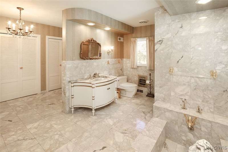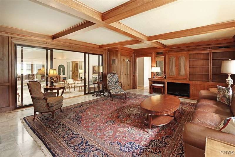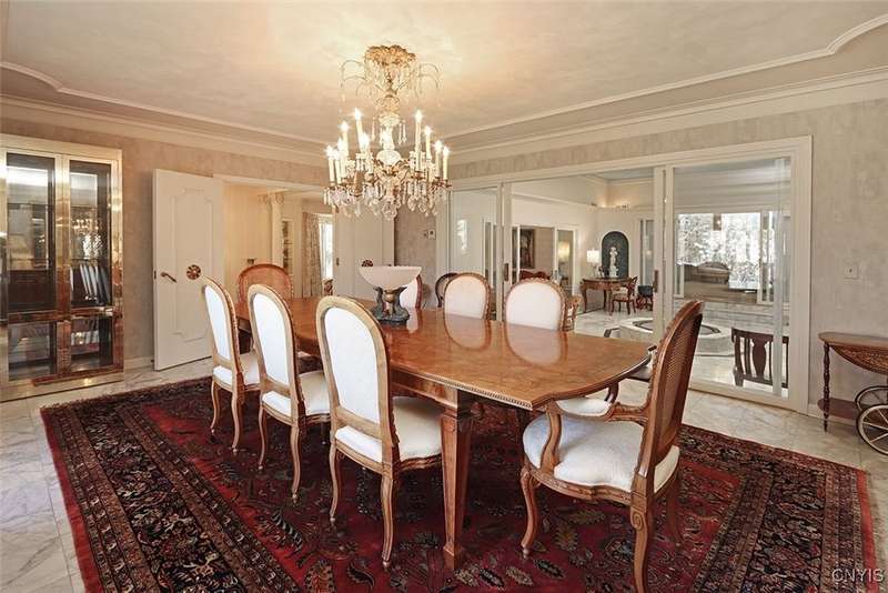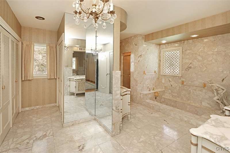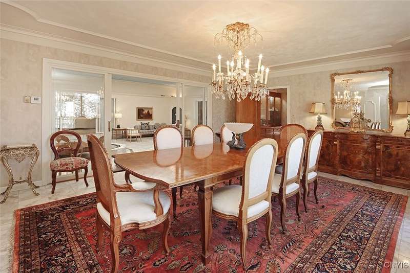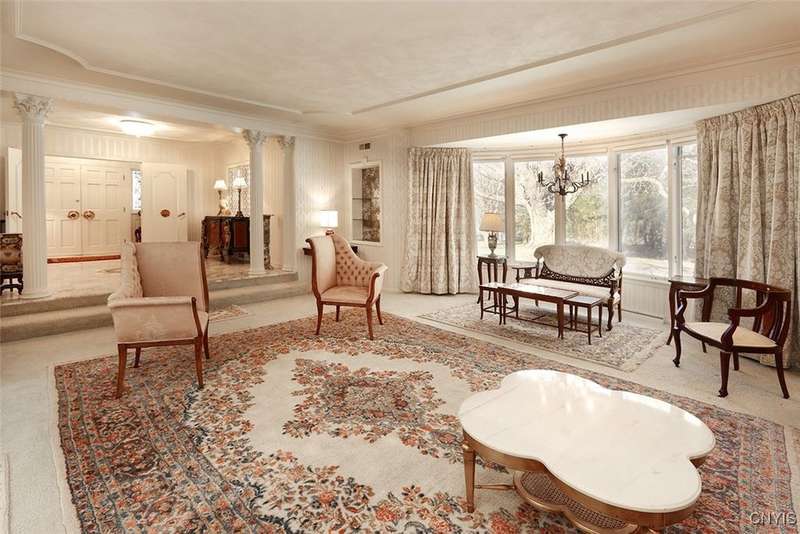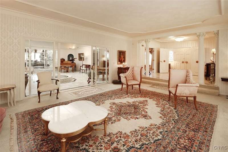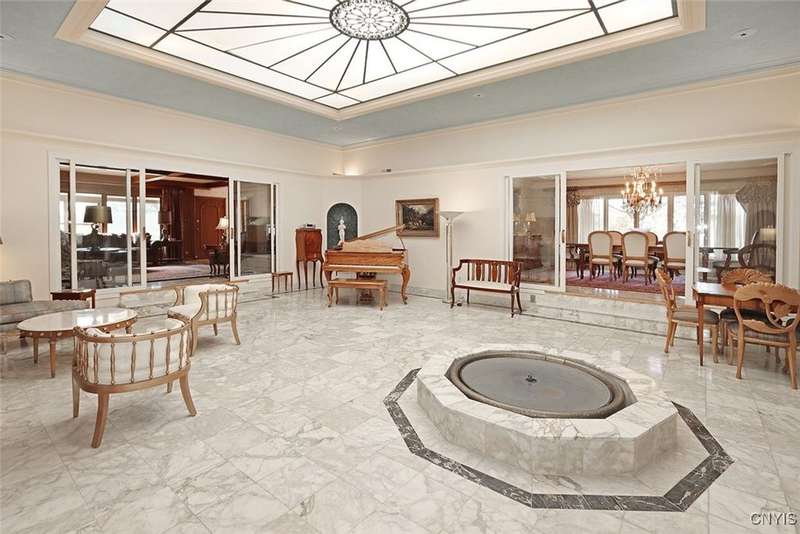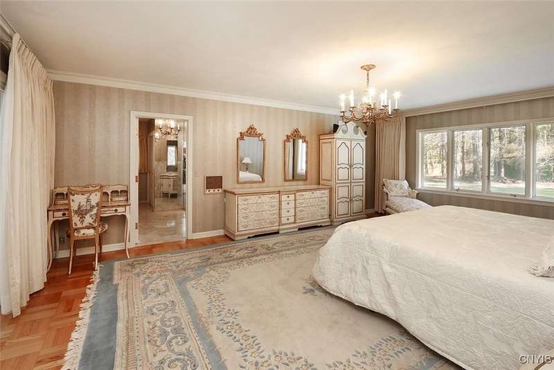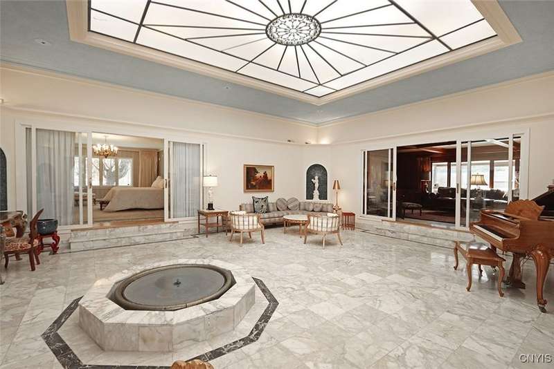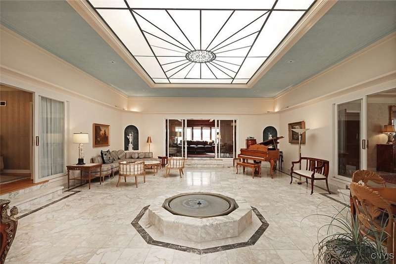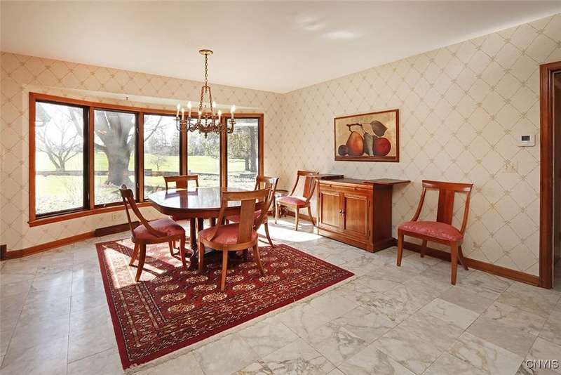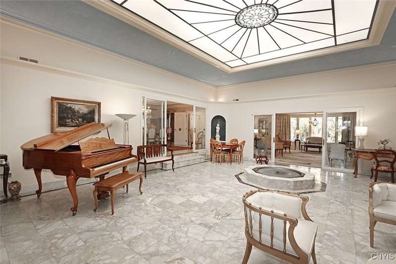 Privately set back from the road on over 7 acres of beautifully landscaped grounds, this stately brick ranch offers space, seclusion and timeless style. A tree-lined approach leads to a pillared front entry and portico, where double doors open to a grand marble foyer with stained glass sidelights and a striking inlaid medallion. Designed for gracious living and entertaining, the open floor plan blends European style with refined details?tray ceilings, bespoke millwork, crown molding and rich marble flooring throughout. Columns frame the sunken formal living room?ideal for relaxing or entertaining guests. While adjacent, the elegant chandelier-lit formal dining room is perfect for gatherings. The well-appointed kitchen boasts granite counters, abundant cabinetry, pantry, breakfast bar and a sun-filled morning room for casual dining. A pass-through wet bar connects the kitchen to the inviting family room, where wood beam ceilings, built-in shelving and a floor-to-ceiling brick fireplace create warmth and charm. Relax in the sun-drenched all-season sunroom with walls of windows and a skylight offering peaceful backyard views. At the heart of the home, a luminous atrium provides a tranquil retreat, featuring a marble fountain and a decorative skylight filtering natural light through a geometric grid, while sliding glass doors connect seamlessly to the surrounding rooms. The spacious primary suite serves as a serene sanctuary, complete with chandelier lighting, multiple closets, dressing area and a spa-like ensuite with floor-to-ceiling tile, a sunken tub and walk-in shower. Three additional bedrooms, two full baths, two powder rooms and a convenient laundry area complete the main level. The lower level adds 2,031 sq ft of versatile living space, including a recreation room, wet bar, family room with fireplace, kitchen area with island and a half bath?ideal for entertaining or extended stays. Outdoors, enjoy the serenity of the expansive, flat yard from the patio?perfect for outdoor gatherings and recreation. A two-car garage provides added convenience, all within minutes of village amenities, major highways and schools. Award-winning FM Schools!