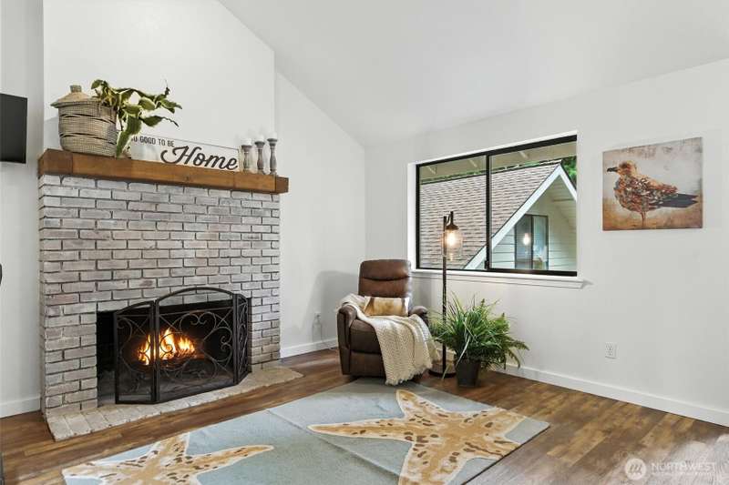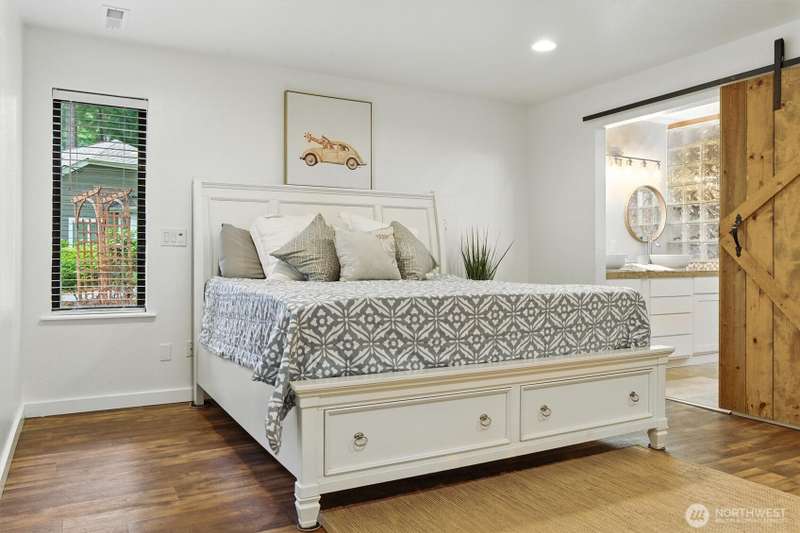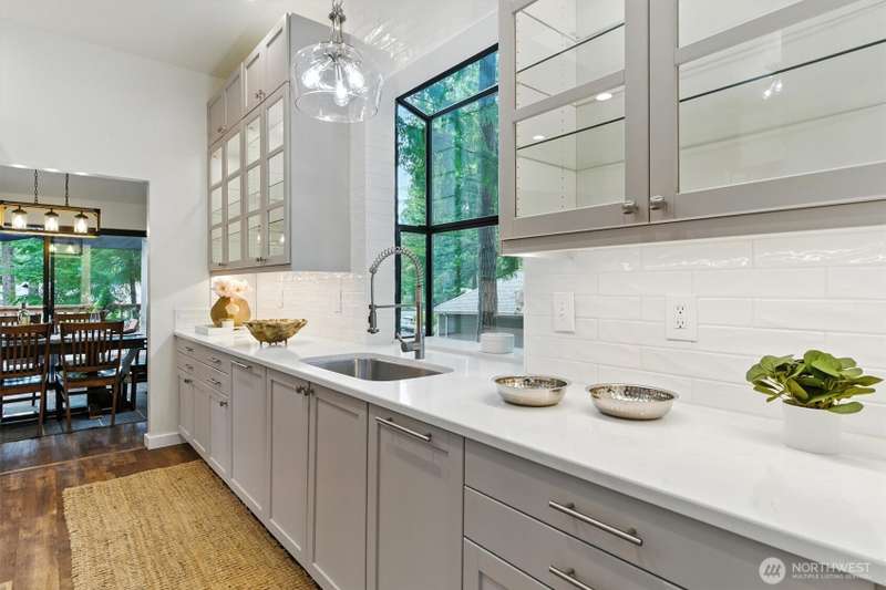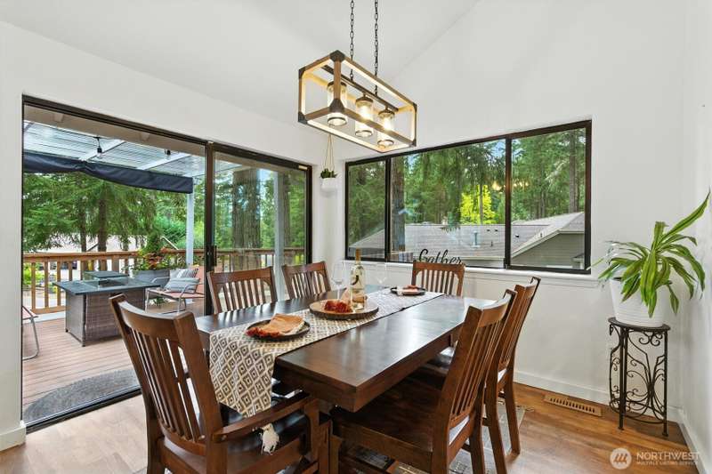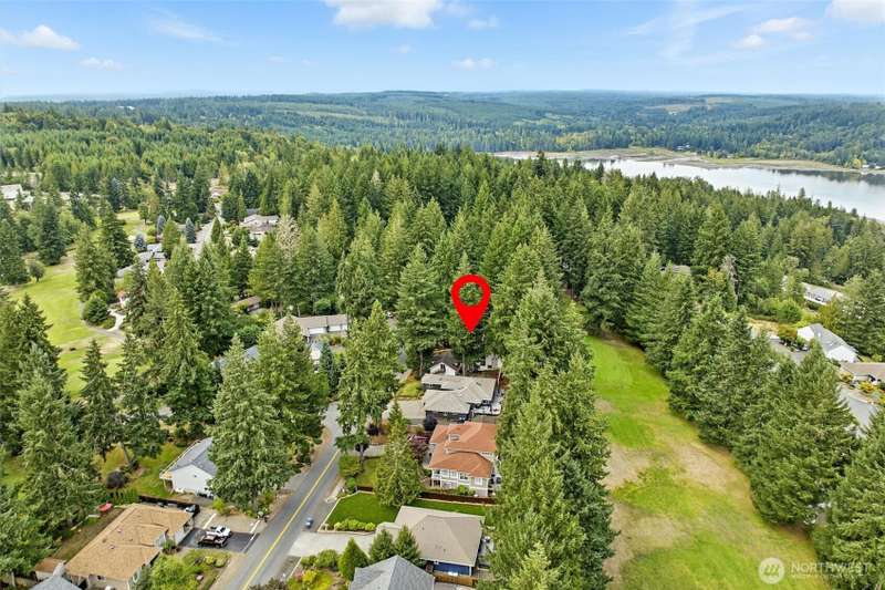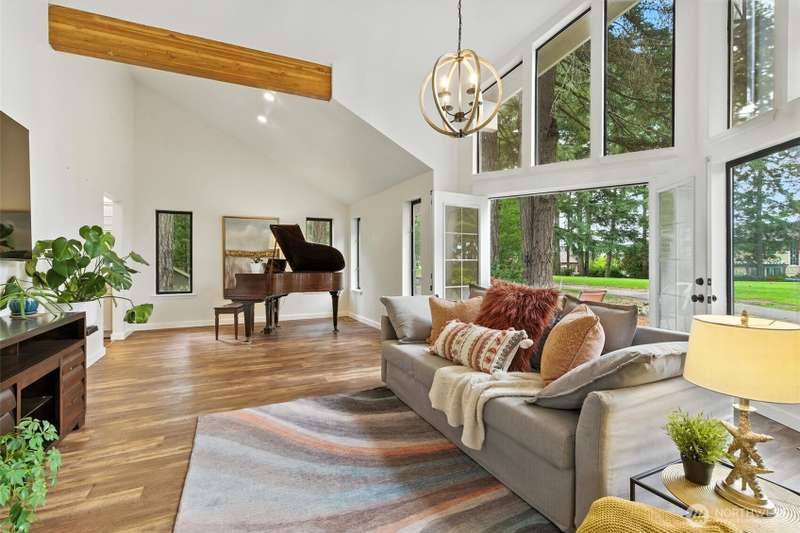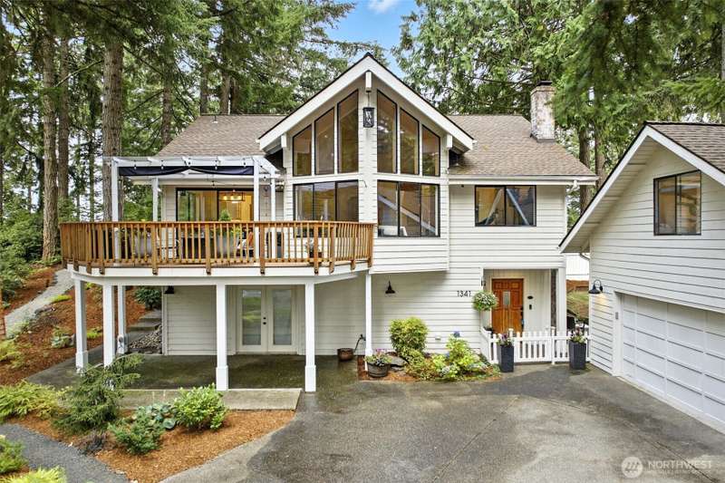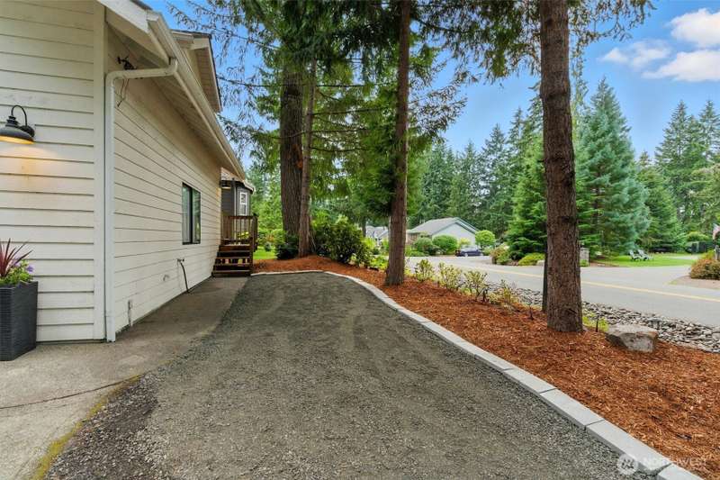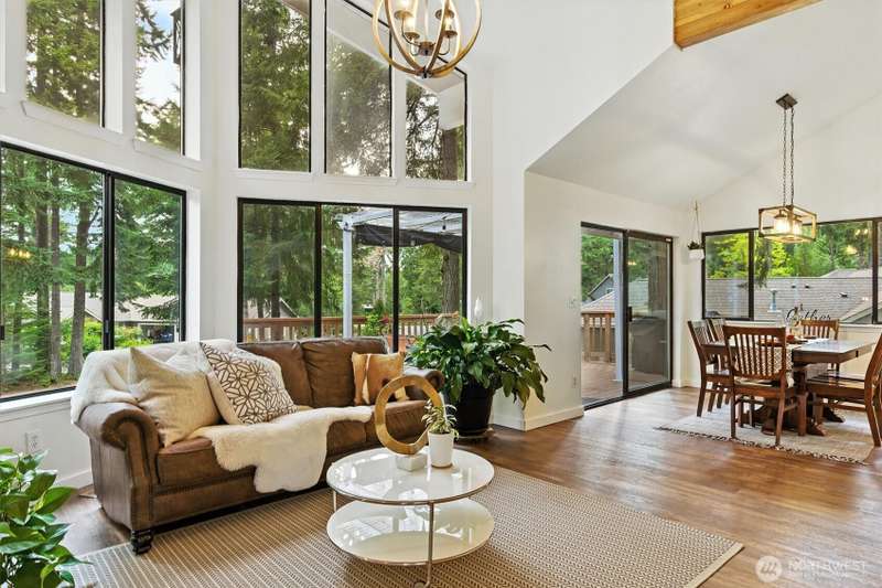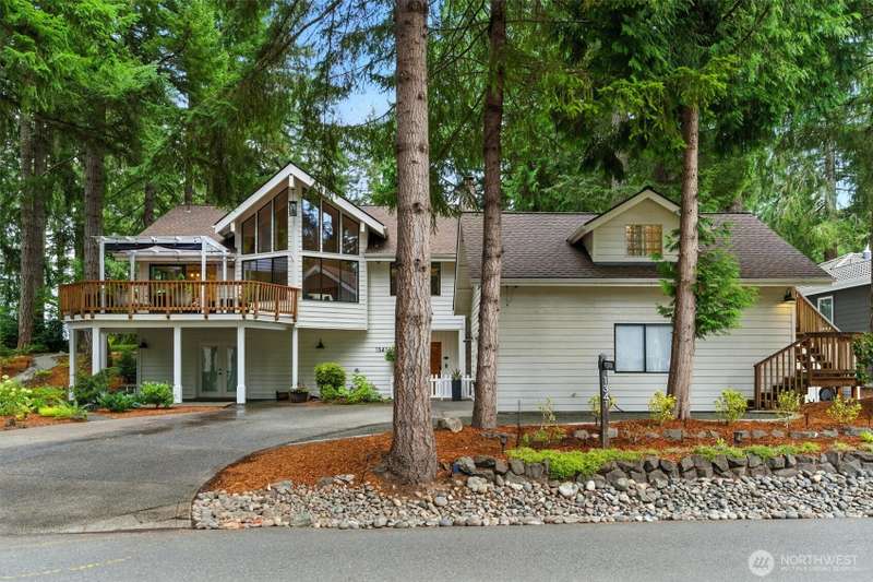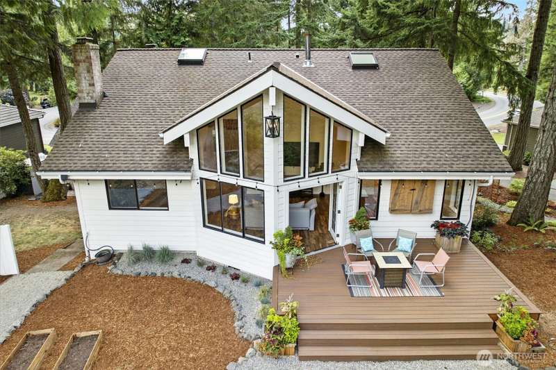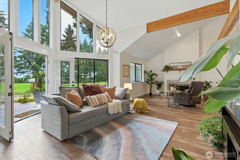 Lakeland Village Stunner! Sophisticated NW contemporary masterpiece on the golf course with a private studio retreat above the garage featuring a kitchenette. Dramatic vaulted ceilings, walls of natural light, & two wood-burning fireplaces complement exquisite LVP hardwoods throughout. The brand-new chef’s kitchen is a culinary showstopper, ideal for gatherings, with expansive quartz countertops & dry bar area. Entertain in style on the brand new back deck with fairway views, or enjoy al fresco dining on the elevated front BBQ deck. Lush, manicured landscaping surrounds a home that offers both elegance and function, with detached two-car garage, extended drive & RV parking. A rare blend of modern style, functionality, & golf course views!