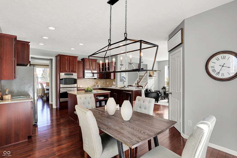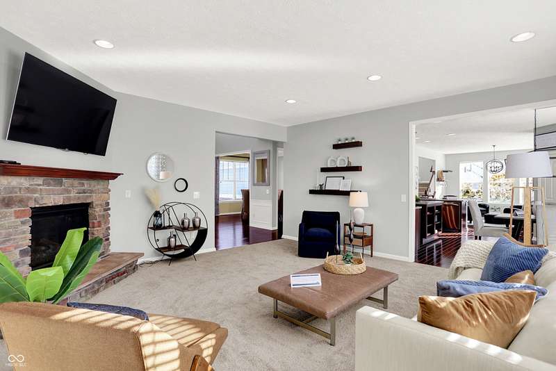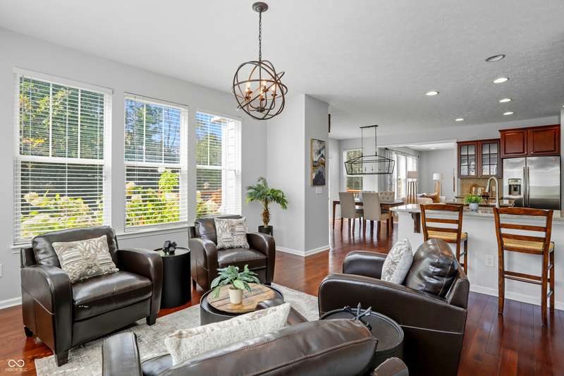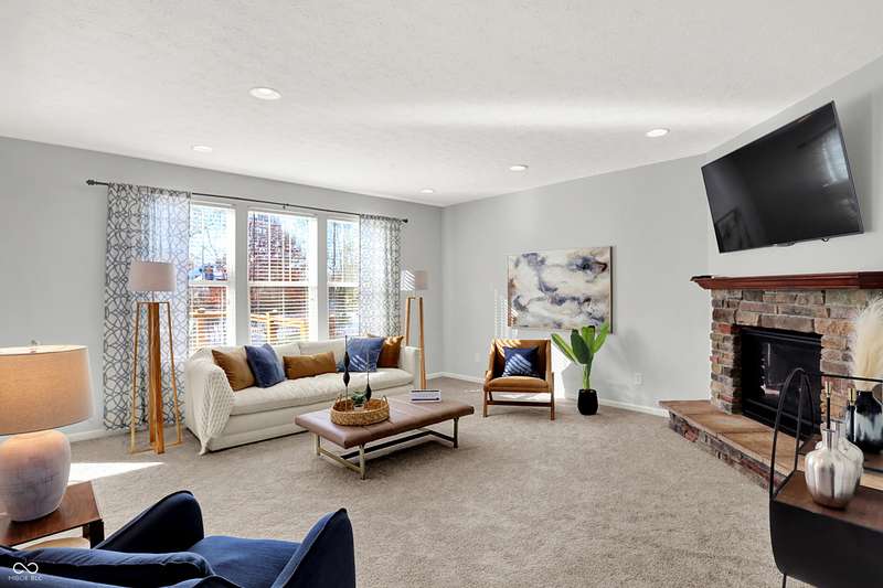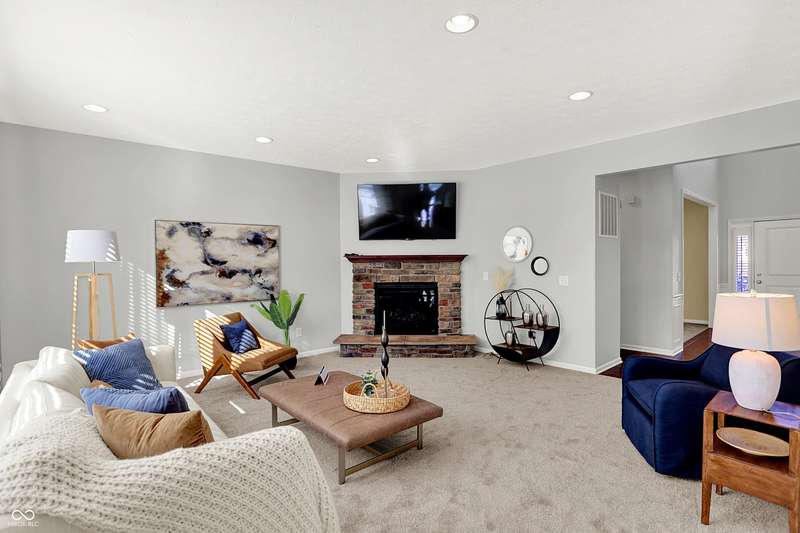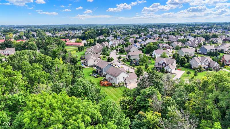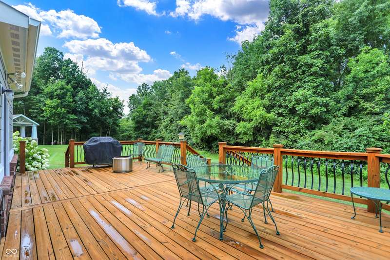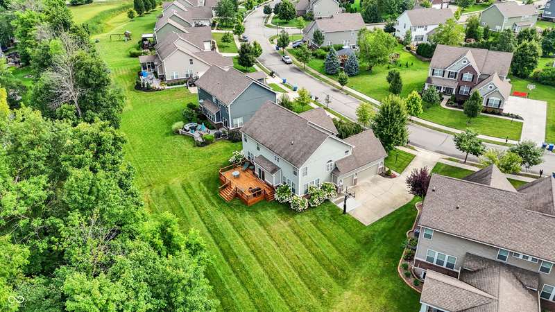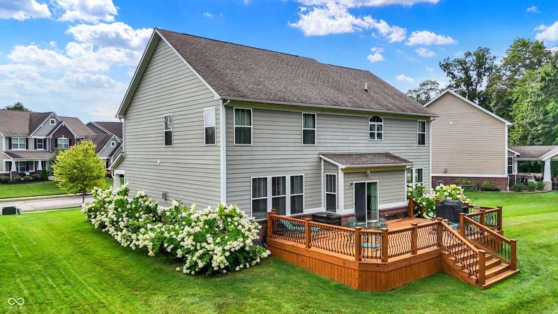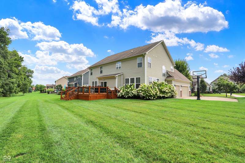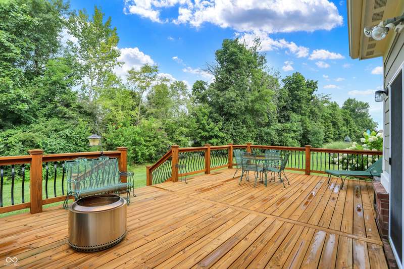Offered by its original owner in highly coveted Strongbow Gate. This stunning home is set on one of the largest, most private lots in the neighborhood, backed by a mature, non-buildable tree line. Unparalleled privacy and prime location. Immediately greeted with a brick-wrapped covered porch, lush landscaping, and a dramatic two-story foyer. Inside, natural light highlights hardwood floors, a custom (board and batten) accent wall, and designer finishes. Brand New Plush Carpets Installed throughout the whole house giving a fresh, clean, and sophisticated look. The gourmet kitchen is an entertainer's dream: expansive eat-in breakfast bar, large center island, high-end SS appliances, and abundant cabinetry. Seamless flow connects the kitchen to main living spaces and the expansive, refinished deck - which has the perfect backdrop for peaceful evenings or enjoying your morning coffee. The newly finished basement is equally impressive, featuring a wet bar, dedicated storage, and vast open space ready for recreation, fitness, or movie marathons. Retreat upstairs to the massive primary ensuite boasting his and hers walk-in closets and a spa-inspired bathroom. The convenient upper-level laundry room makes daily life so much easier. Key Amenities: EV charger, gas fireplace, well-designed layout, ample storage, and regularly serviced H.E. HVAC. Minutes from Geist Reservoir, Geist Water Park, Downtown Fortville, and easy access to Fishers Yard dining and shopping. This is a rare combination of location, function, and designed for those who value both flow and function! Ask your agent about the Bee Camp Creek Trail!
