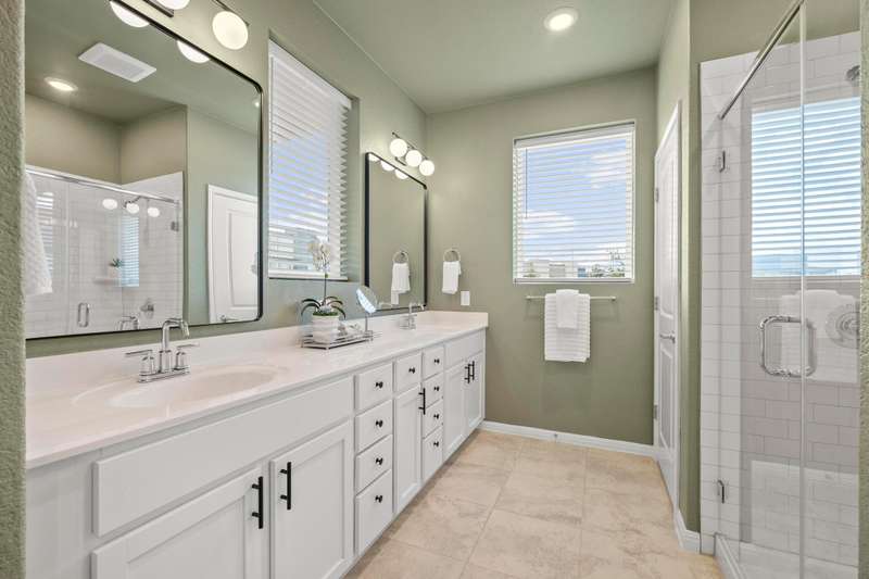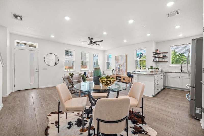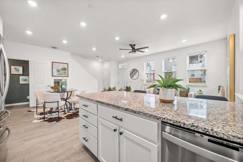 The open-concept main living area features abundant natural light, a stylish kitchen with granite countertops, stainless steel appliances, and custom open shelving, plus a spacious dining area perfect for entertaining. Upstairs, the primary suite offers a serene retreat with a generous walk-in closet and a spa-inspired bathroom featuring dual vanities and a glass-enclosed shower.