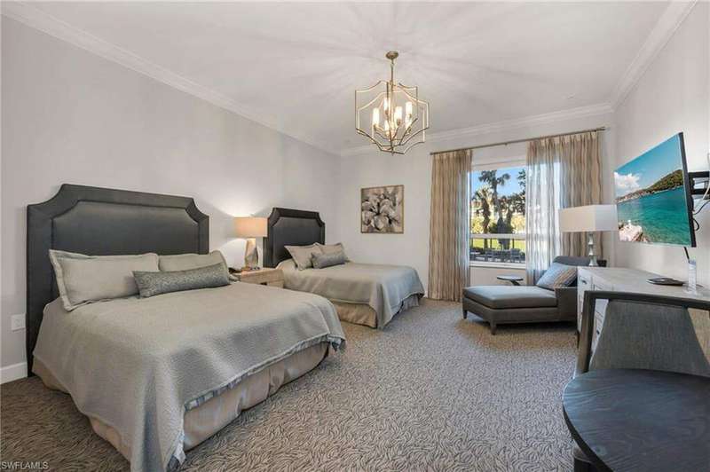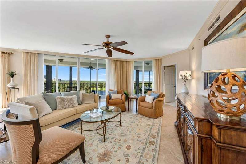 This exquisite residence boasts breathtaking views of the golf course, lake, Estero Bay, and distant silhouettes of New Pass leading to the Gulf of Mexico. Blending indoor sophistication with the serenity of lush greenery, soft natural light, and the gentle gulf breeze, this tranquil property offers an elegant, yet relaxed, atmosphere. The open kitchen features luxurious wood cabinets, breakfast bar, and like-new premium appliances. Ideal for entertaining or just relaxing with family, the inviting living and dining areas open to the spacious wrap around lanai with floor to ceiling glass doors and electric hurricane shutters. A restful primary suite offers a spa-like bath, custom closets, and luxurious marble finishes. Located away from the main living area are private guest rooms with ensuite baths and a balcony. You can take advantage of Navona's elegant amenities, including a sophisticated lobby overlooking the pool, a state-of-the-art fitness center, a welcoming social room, elegant guest suites, and a private theater. You will also have access to unparalleled community amenities including a private beach pavilion, bocce, private restaurant, tennis, fitness center, and concierge service. Residents enjoy the privilege of a Private Beach Club, while a coveted private membership to the Bay Club promises mesmerizing sunsets over Estero Bay. Situated just moments from Coconut Mall and the highly regarded Lee Memorial Health System, this property effortlessly blends tranquility with urban convenience, making it the perfect sanctuary for the discerning homeowner.