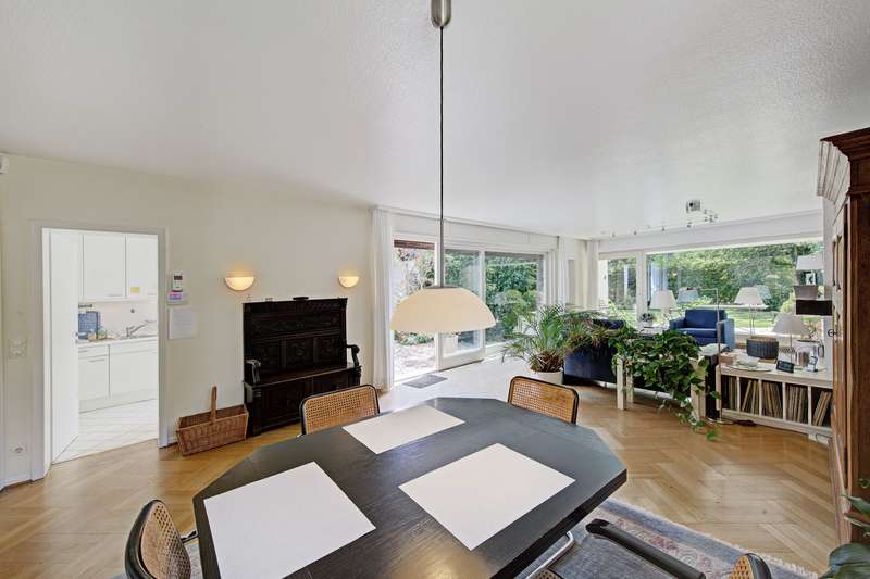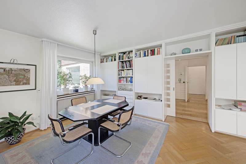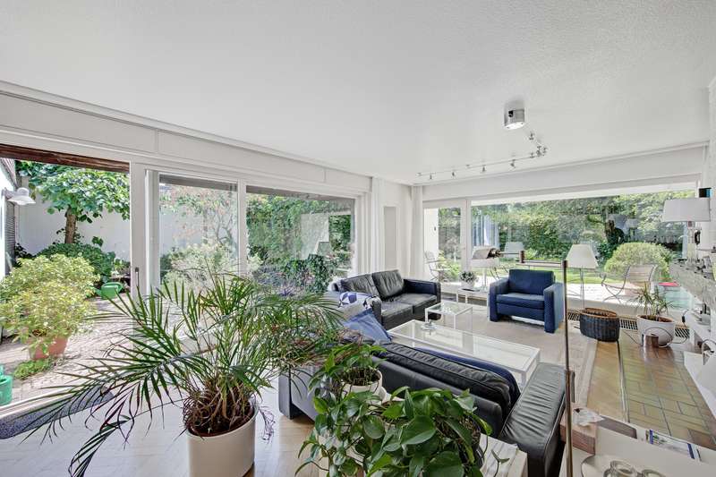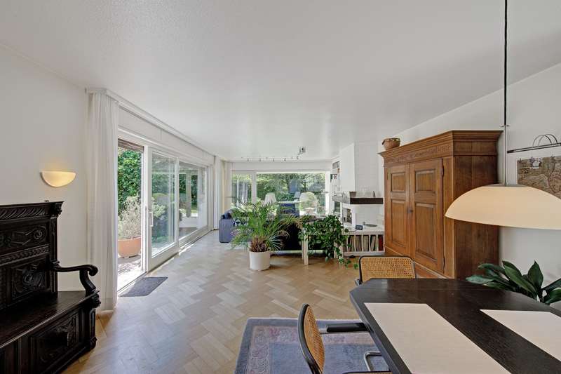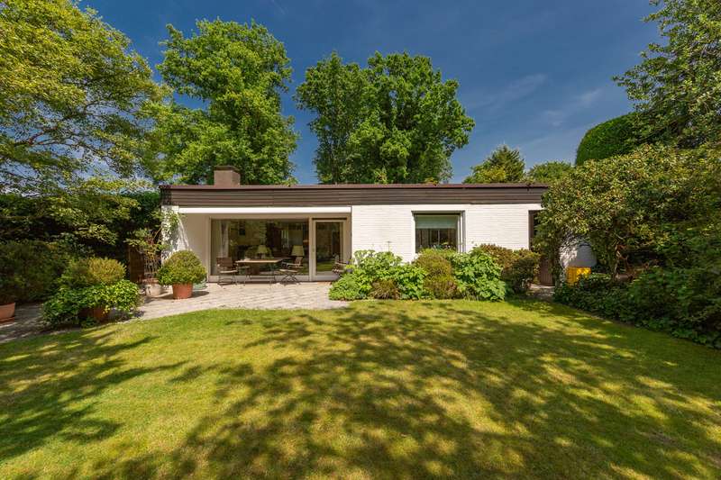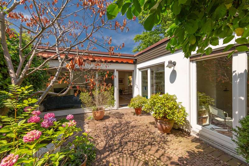 This well-kept bungalow, built in 1966, presents itself in a quiet residential area with a generous living and usable area of approx. 155 m² on a plot of approx. 709 m². The extension from approx. 1995 allows for a well thought-out space and individual development possibilities. As you enter the property, you are greeted by an inviting entrance hall with ample space for a checkroom and reception area. The open floor plan creates a harmonious connection between the individual living areas and underlines the generous feeling of space. The atrium in the center of the house acts as a naturally lit focal point around which the most important areas are grouped. The living room is characterized by direct access to the atrium. This offers a retreat that allows for undisturbed moments of relaxation in everyday life. The adjoining kitchen offers ample workspace and storage space and is well integrated into the living area. The bright rooms can be individually designed and have a pleasant layout. The bathroom is functionally furnished and provides a friendly ambience with natural light. The total of five well-designed rooms allow for flexible use: in addition to three spacious bedrooms, there is a separate study. This offers ideal conditions for a home office, creative hobbies or as a quiet retreat for concentrated work. The entire property is equipped with electric shutters, offering contemporary comfort and a high degree of privacy. The spacious plot allows for numerous design options in the outdoor area. Here you can enjoy a private garden that invites you to linger and can be used individually. Whether you want to sit and relax on the terrace or realize your gardening ambitions - the space gives you enough freedom to implement your personal ideas. The attractive room layout and generous amount of space make this house suitable as a retreat for couples as well as for discerning individuals who value privacy and a quiet living environment. The atrium gives the residential ensemble a special touch and unique lighting conditions. A garage with a basement completes the offer. Have we piqued your interest? For reasons of discretion, we will be happy to provide you with further information on this property on request. We look forward to a personal meeting.