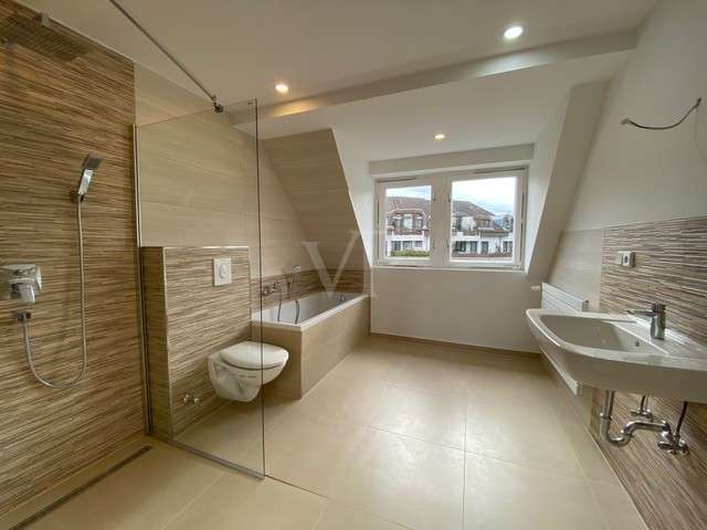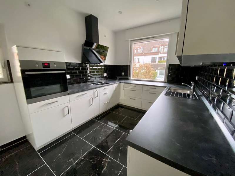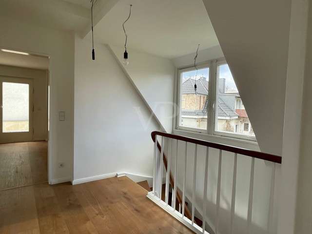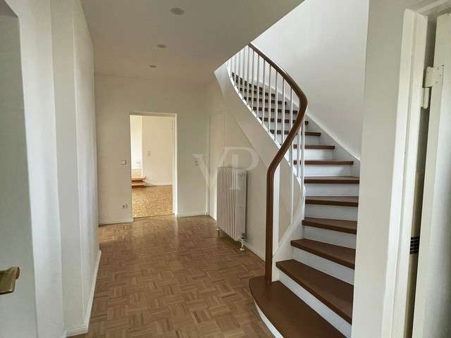 Looking for family - first time occupancy after refurbishment This 2021 renovated, full basement single-family house with garden and parking space is offered for rent. As soon as you enter the newly renovated house, the classic glass blocks in the entrance area and the large windows in the hallway create a bright and inviting ambience. The hallway leads to the high-quality, modern fitted kitchen in black marble optics and opposite to the small guest toilet with daylight. The room next to the kitchen offers space for your own ideas and can be used according to your own ideas. Many beautiful details, such as the revised parquet floor, original real wood doors and the open room concept in the light-flooded living and dining area, ensure an extremely high level of living comfort. From here the south-facing terrace can be reached, where you can enjoy the sun. The old, refurbished wooden staircase leads to the ideally divided attic, which serves as an excellent sleeping area with two bedrooms and a spacious bathroom. The modern master bathroom with shower and bathtub offers enough space for the whole family. The balcony is accessible from the larger bedroom and offers a view of the green garden, which invites you to relax and have fun with the family. In the basement, in addition to the utility room, you will find a bathroom and two rooms that are not developed, but still have daylight and can be easily converted into an office or a fitness or hobby room. A parking space completes the offer.