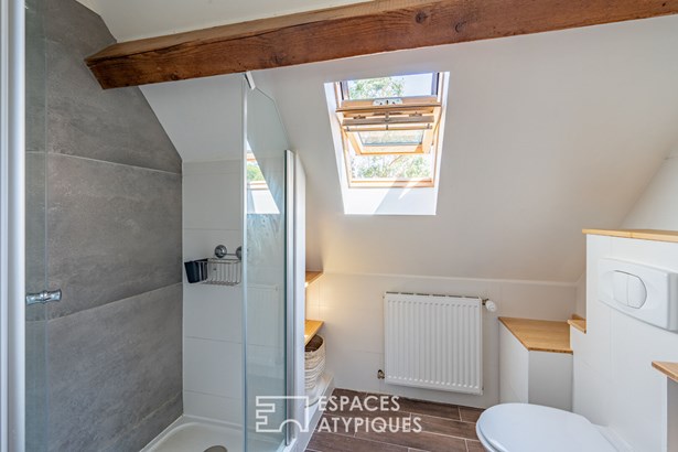 The second level is entirely dedicated to a large attic bedroom with plenty of storage and a walk-in shower room. The courtyard can park three vehicles and has a garden.