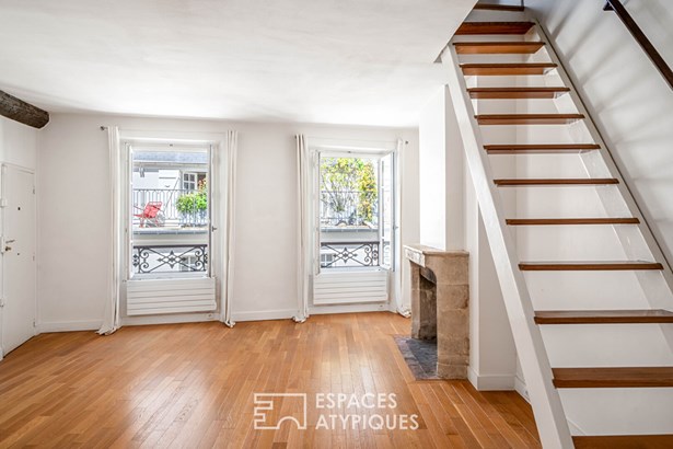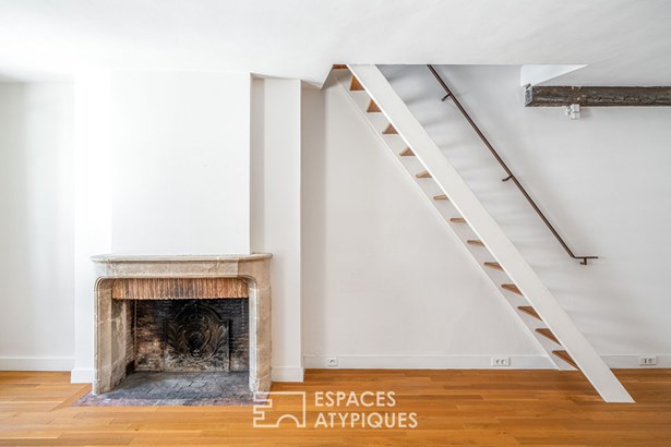 The entrance opens onto a generous space showcasing a refined interplay between an original stone fireplace and a contemporary staircase leading to the upper level. Bathed in natural light thanks to dual-aspect windows, the apartment offers a bright and airy atmosphere.