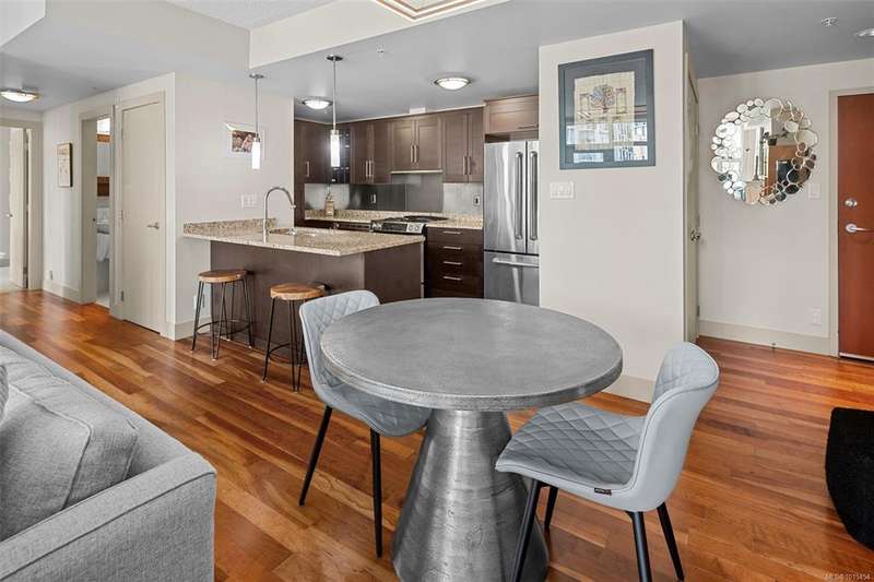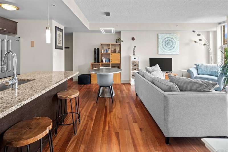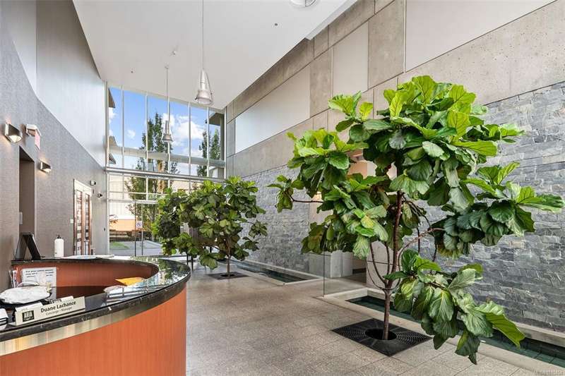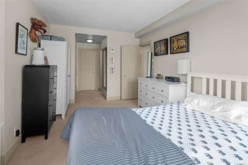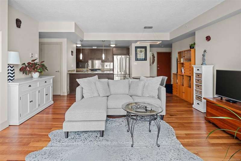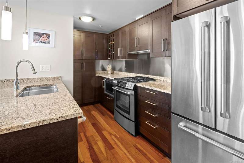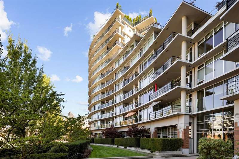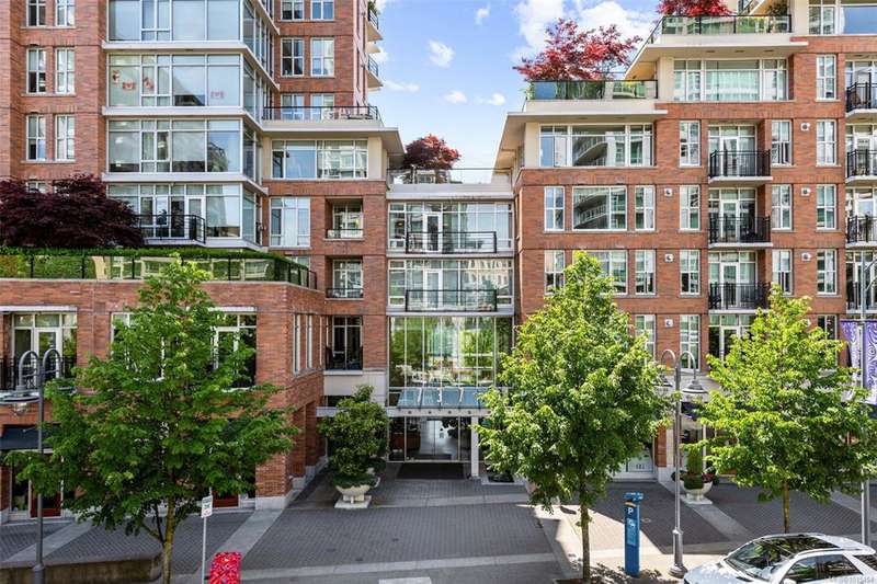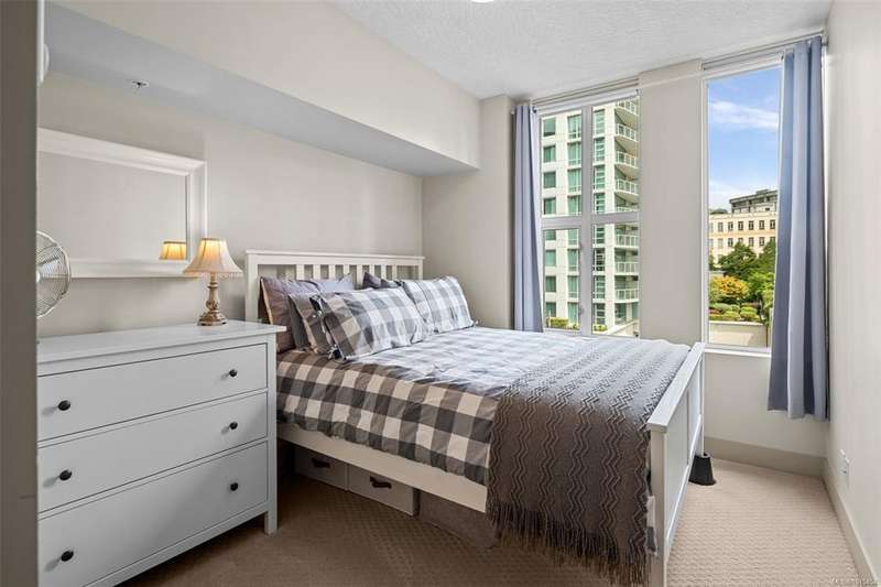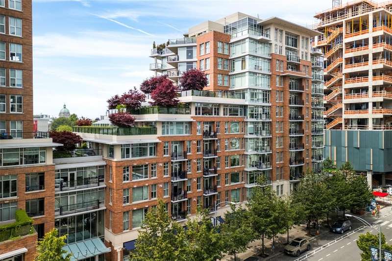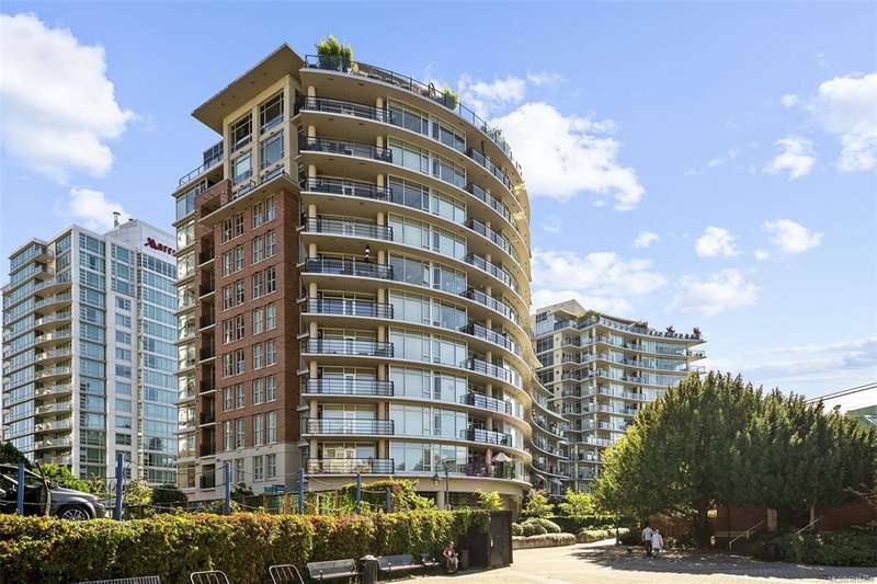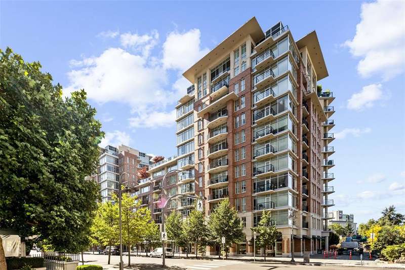 Prepare to be impressed with this meticulous luxury condo in the prestigious ARIA building. Step into a bright open floor plan showcasing gleaming engineered wood flooring, cozy gas fireplace, floor to ceiling windows framing picturesque corridor views of blue skies and elevated garden greenery. A Chef’s kitchen finished with granite countertops, richly toned cabinets, wine storage and stainless appliances including gas range. Spacious primary bedroom with accommodation space for furnishings and 4pc ensuite. Spa-inspired bathroom for guests and second bedroom. Complex amenities feature a residents lounge, fitness facility and sauna, bike storage room workshop, and underground parking. City living at its finest in the heart of the Humboldt Valley, a neighbourhood encompassing famous landmark destinations. Steps to the Inner Harbour, Beacon Hill Park, IMAX theatre, Royal BC Museum, Parliament Buildings, Restaurants, Entertainment and Shopping.