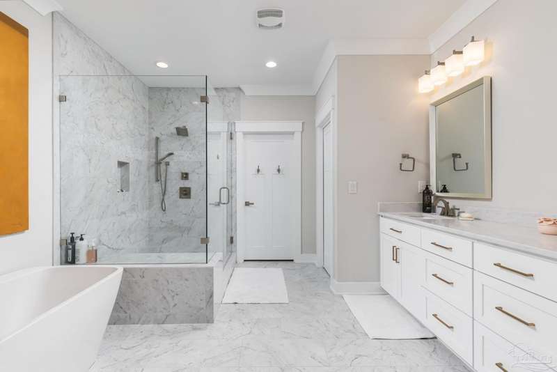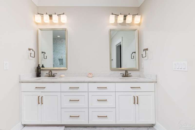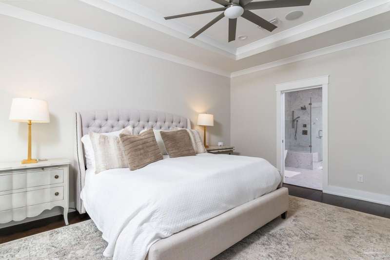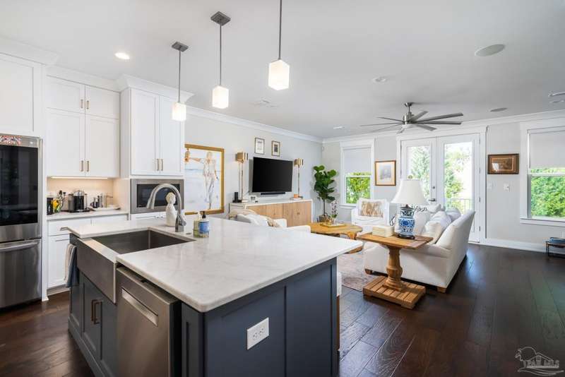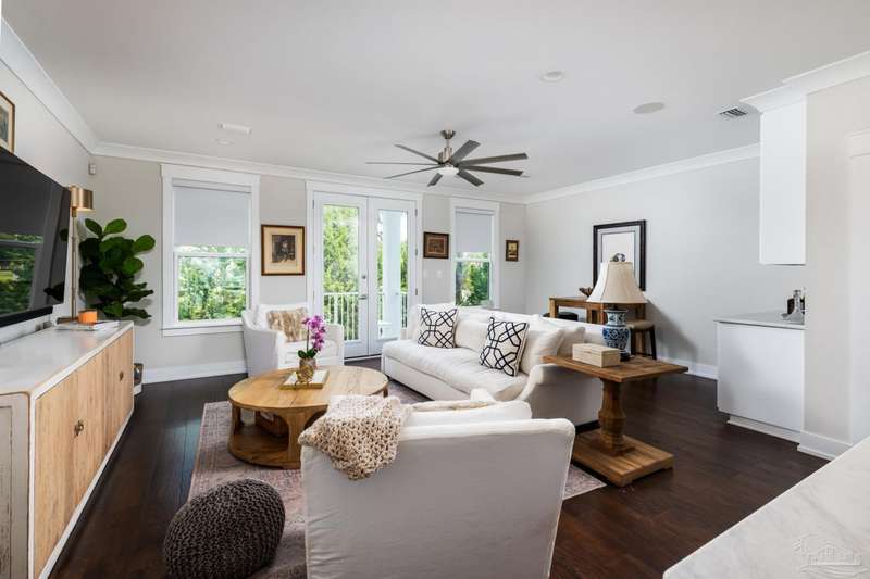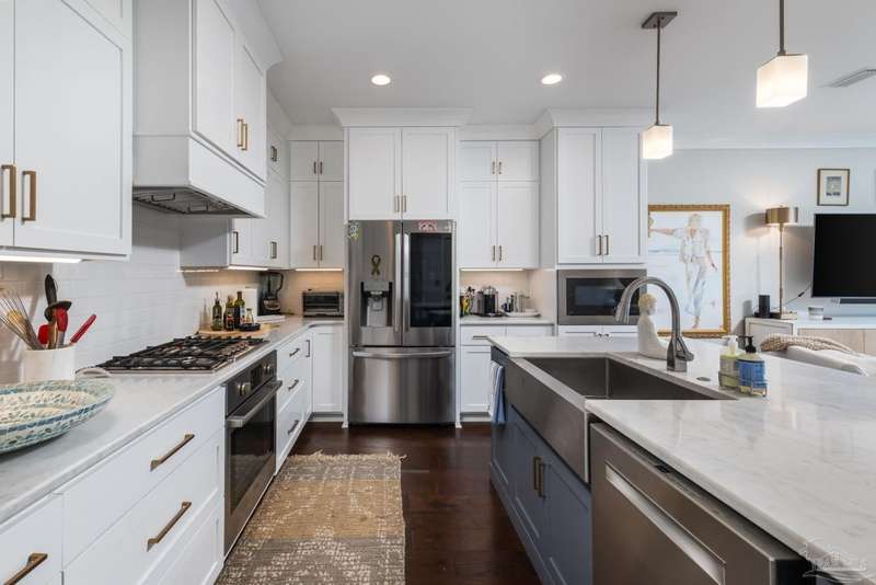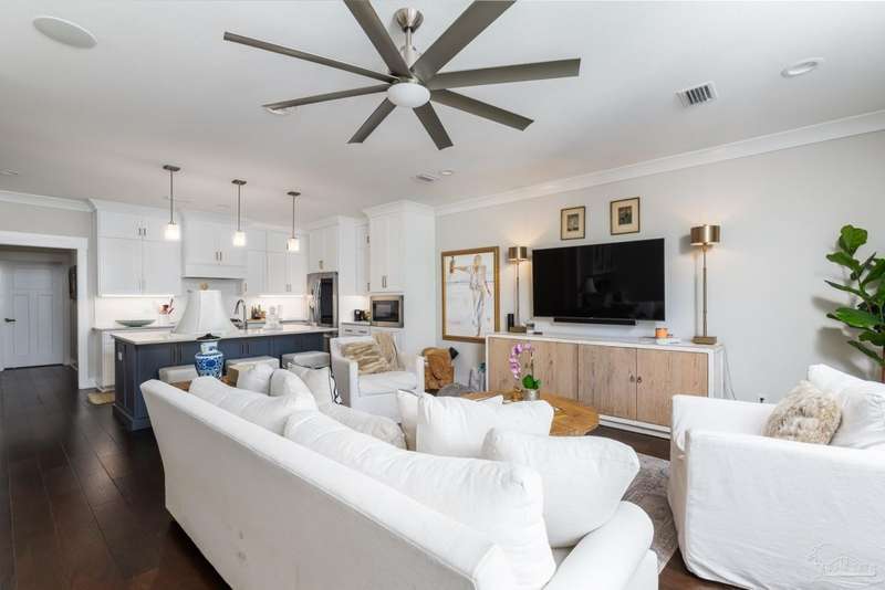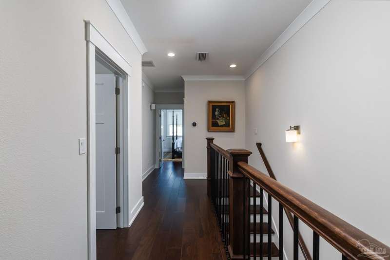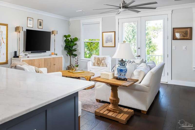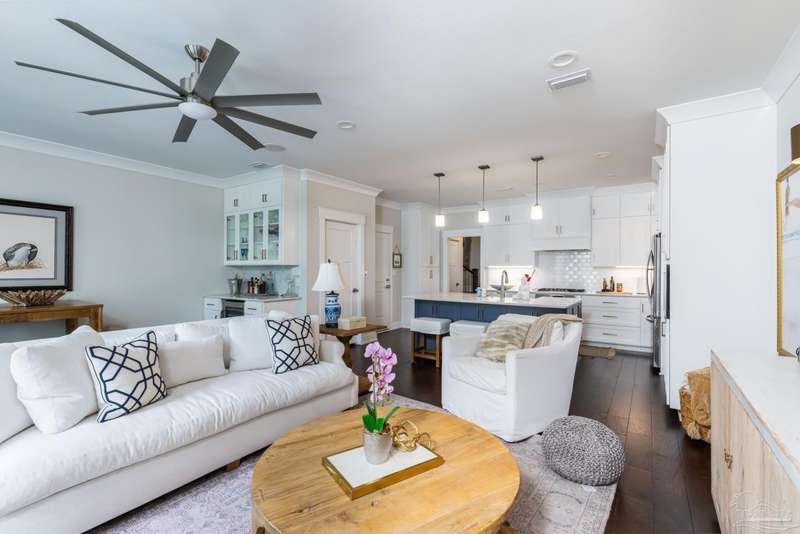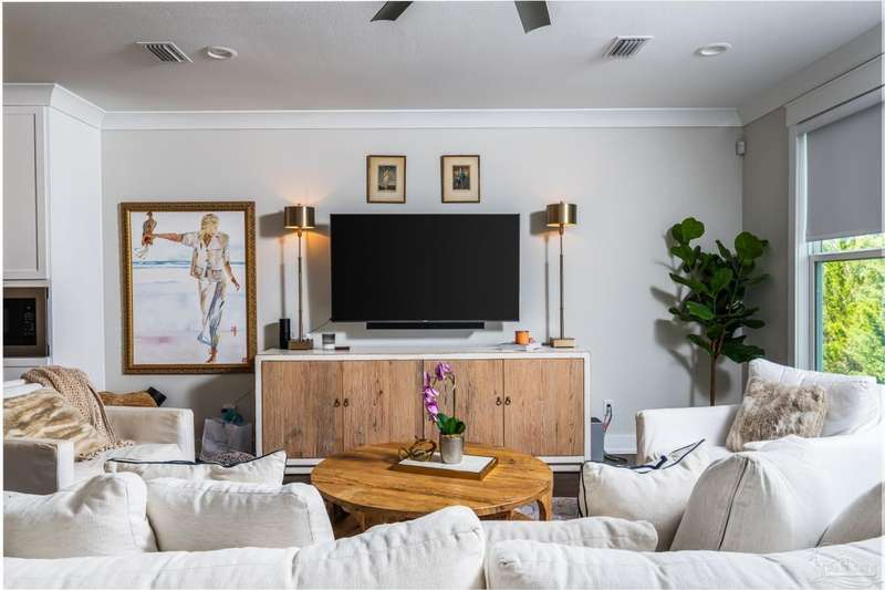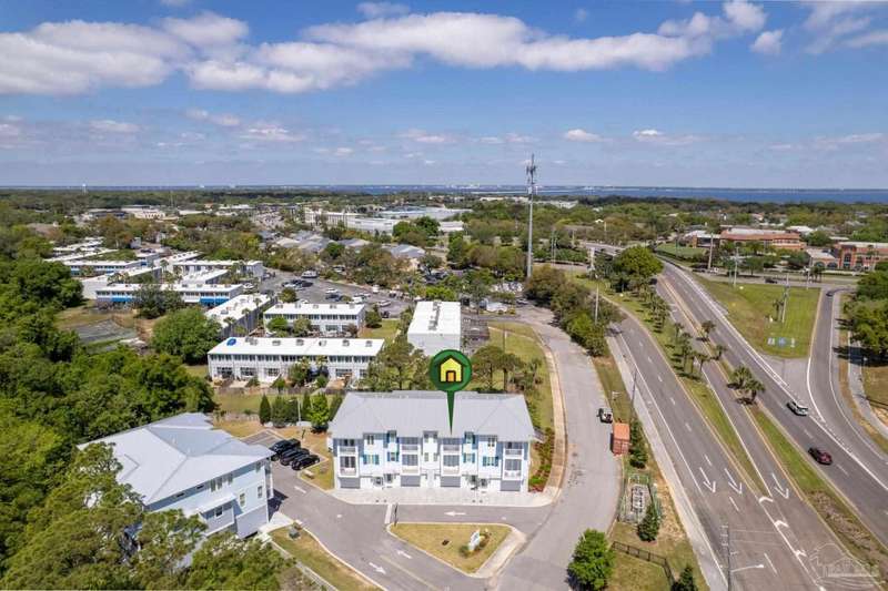 Prime Gulf Breeze Proper, fully furnished!!!!! This Stunning Townhouse is under 4 years old. Talk about move in ready, the furnishings are both comfortable and beautiful. Within minutes to shopping. restaurants, grocery stores , hospital/medical centers, all three blue-ribbon schools, recreation center, and Shoreline Park. Located just between Pensacola and Pensacola Beach. This open concept 3-story floor plan is complete with an elevator. The modern design has exceptional finishes. 9' ceilings, luxury Vinyl Plank flooring, a fireplace with linear mosaic surround, neutral color palette, beautiful crown moldings and recessed lighting make for an entertaining delight. The kitchen is just perfect with white shaker style cabinets, soft closing. Pull out organizers, Quartz countertops, Whirlpool stainless appliances. A dry bar with wine cooler, glass mosaic backsplash & glass front upper cabinets create an additional space for entertaining. The Master bedroom is a retreat. The en-suite bathroom has an oversized shower and a freestanding soaking tub as well as a large walk-in closet. Each additional bedroom has the same finishes and private bath areas. The laundry is located upstairs. The first floor bedroom located behind the garage has access to a private deck. This room can be used as a media room, home office, workout area, artist space or 4th bedroom. The oversized 2 car garage has plenty of storage space for all your toys!!