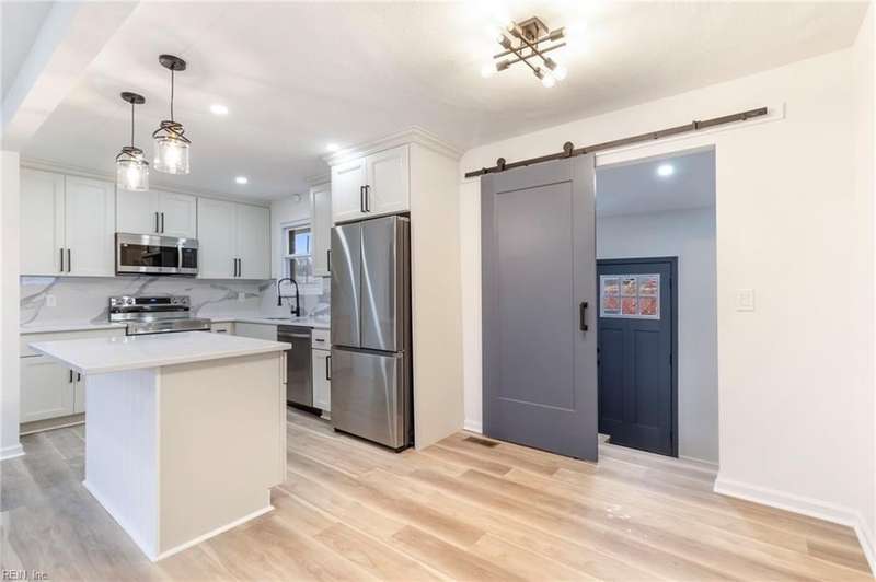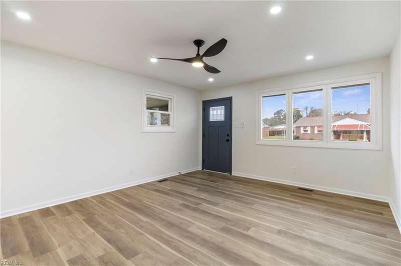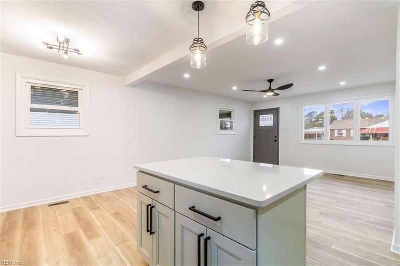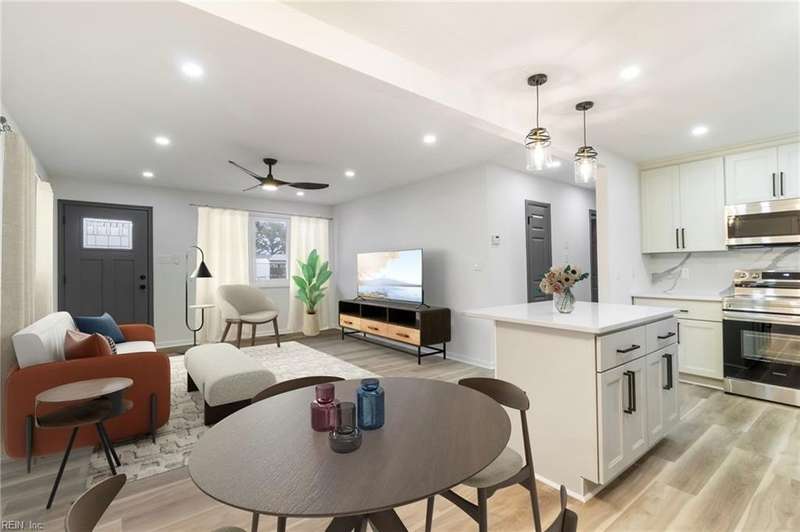 Welcome to this fully remodeled 4BR, 2 BA Ranch in the sought-after Cavalier Manor area of Portsmouth! This home offers a bright open layout connecting the living room and kitchen, featuring quartz countertops, a porcelain backsplash, and a brand-new stainless-steel appliances. Enjoy new LVP flooring in the main areas and new carpet in the bedrooms for comfort and style. Both bathrooms are completely updated with modern vanities vanities and beautiful Italian porcelain shower walls. The home is energy-efficient, with new insulation, recessed LED lighting, a new HVAC system, new water heater, and a brand-new roof. Outside, you'll find two separate driveways, a covered carport, and a detached garage great for a workshop or extra storage. Move-in ready and beautifully finished- this cavalier Manor gem has everything you've been looking for!