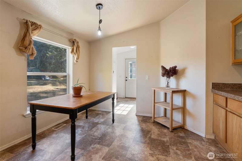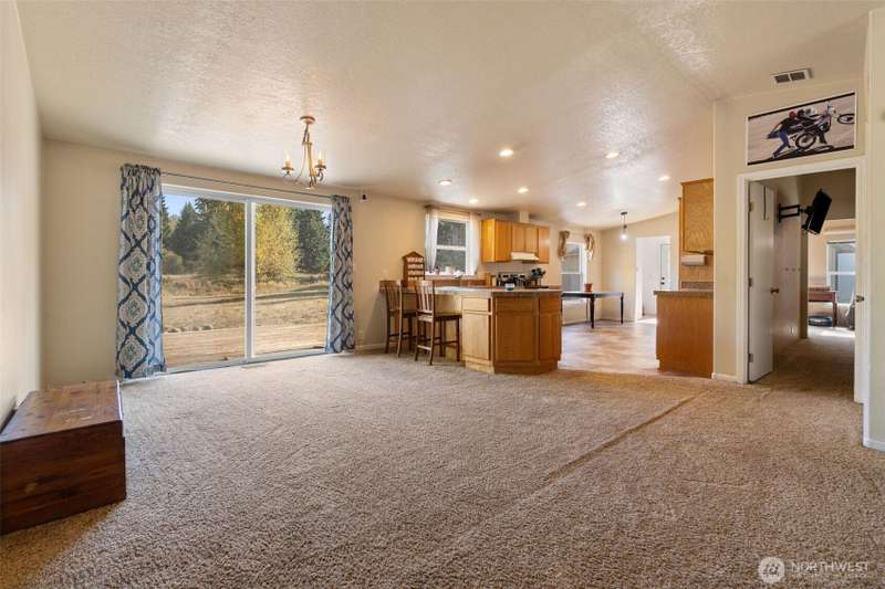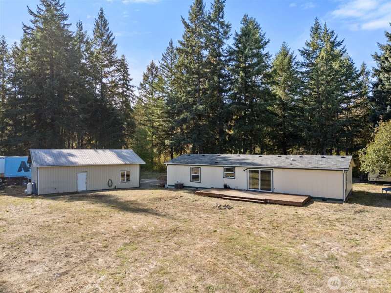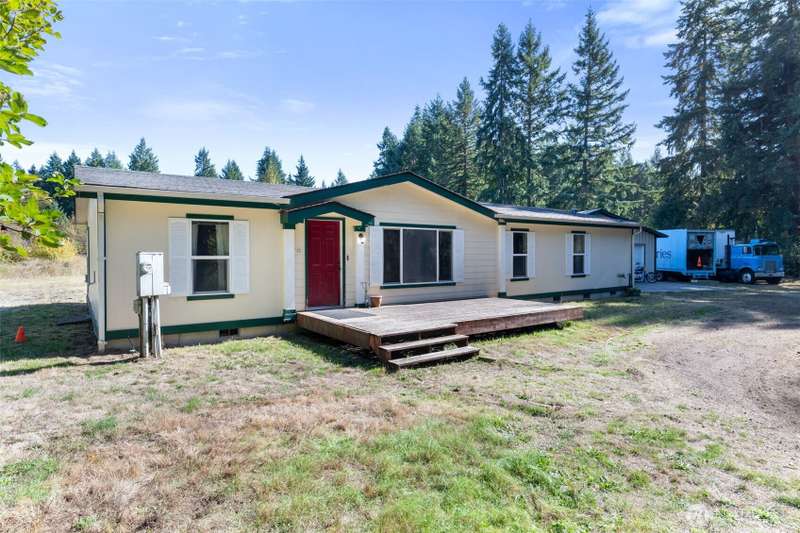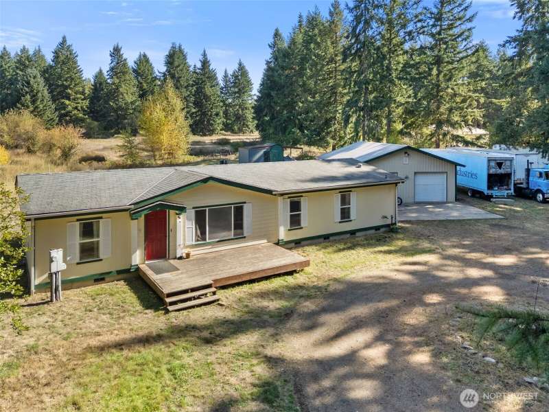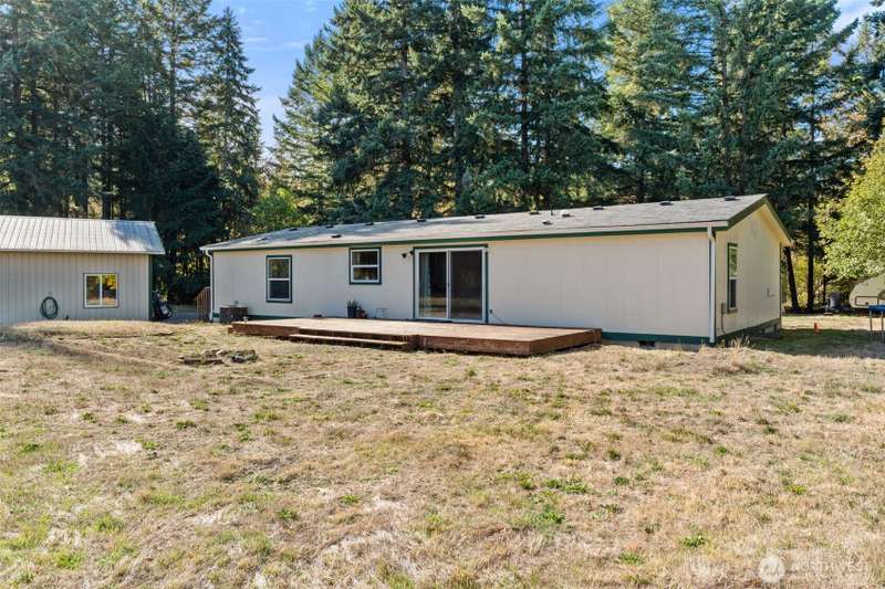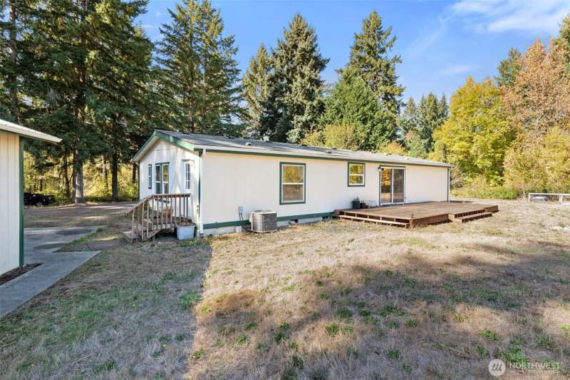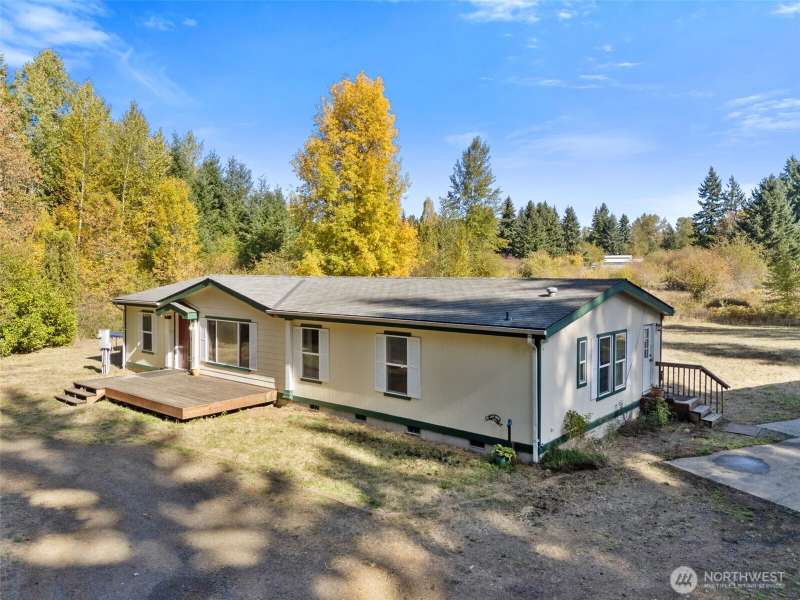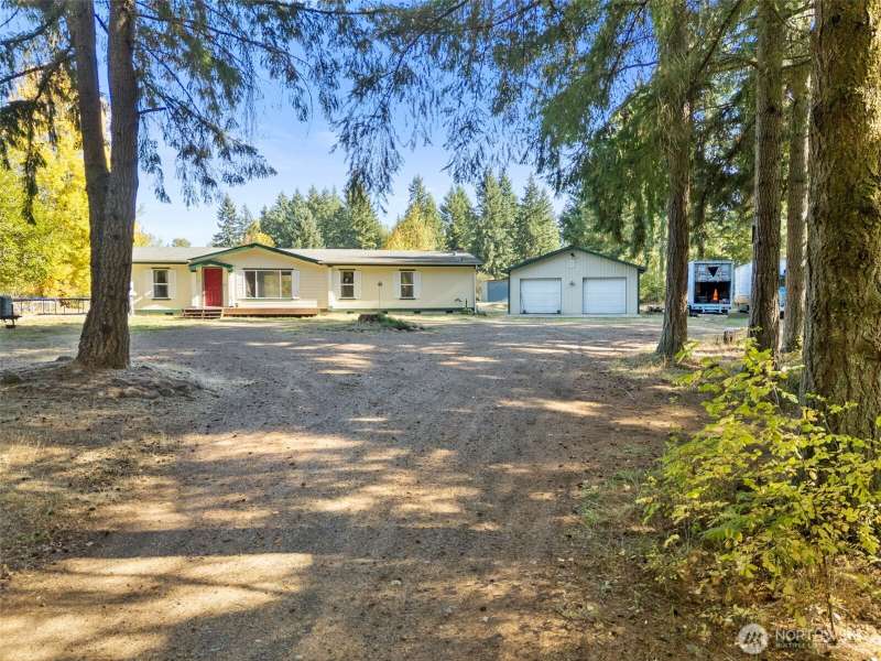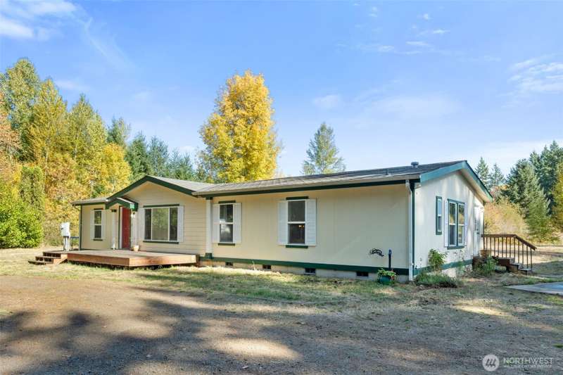 Country Comfort on 3.36 acres in Yelm! Spacious 3-bedroom, 2-bath manufactured home, offering 1,620 sq. ft. with a split-bedroom floor plan, large kitchen with tons of storage, spacious living room and open concept dining area. Primary bedroom includes extra space for office or sitting area, plus a corner soaking tub in the primary bathroom. Enjoy year-round comfort with a heat pump and relax on the two large decks—front and back, perfect for soaking in the peaceful setting. The 28x36 propane-heated shop provides plenty of room for storage, hobbies, or projects. Lot includes RV parking with hook-ups. With room to set up for animals, this property offers space, functionality, and country charm, all ready for its new owner!