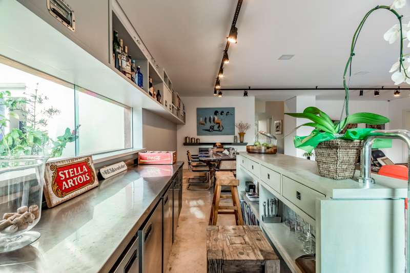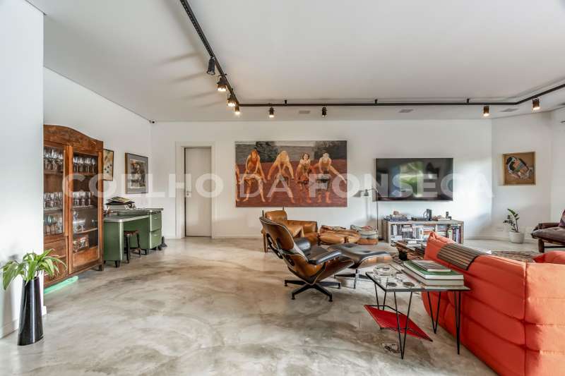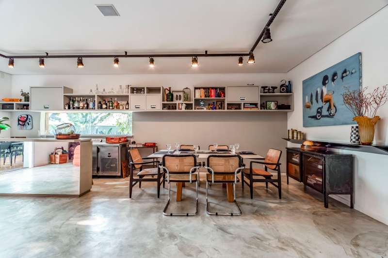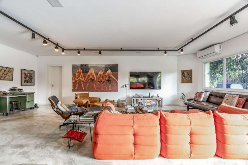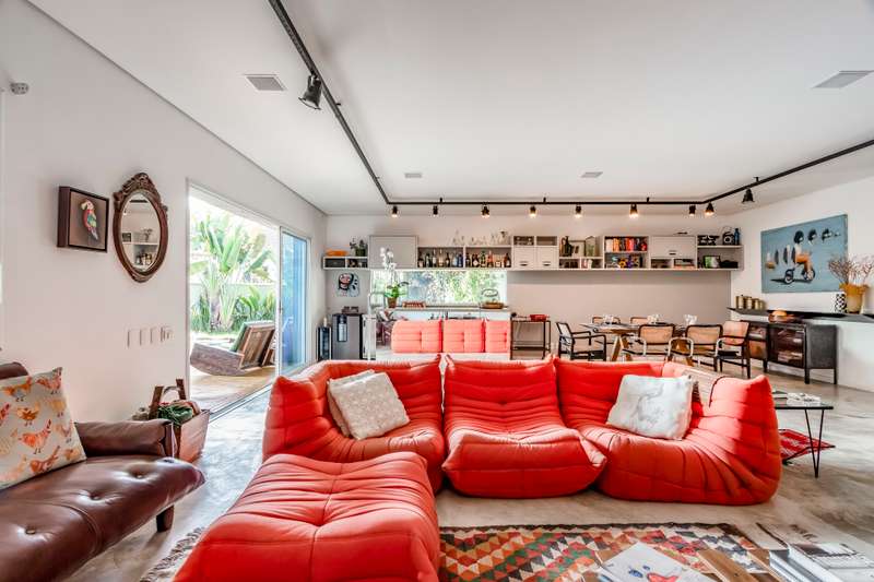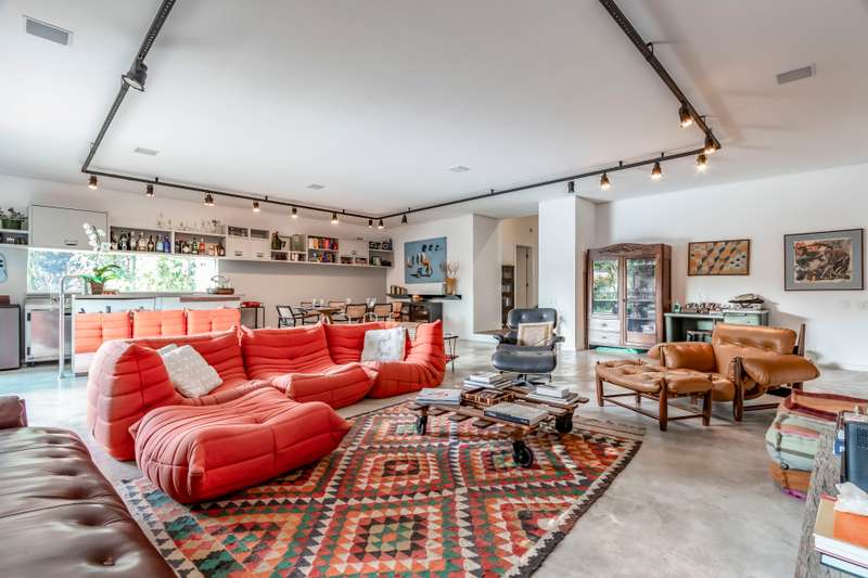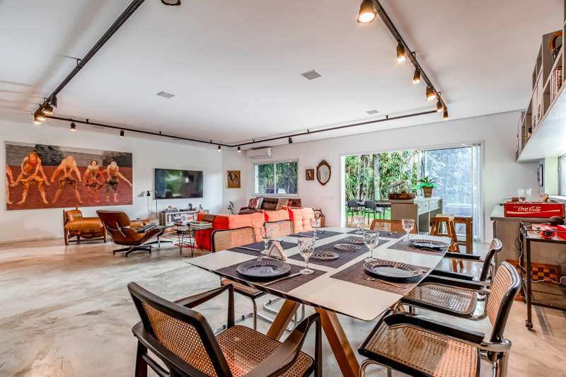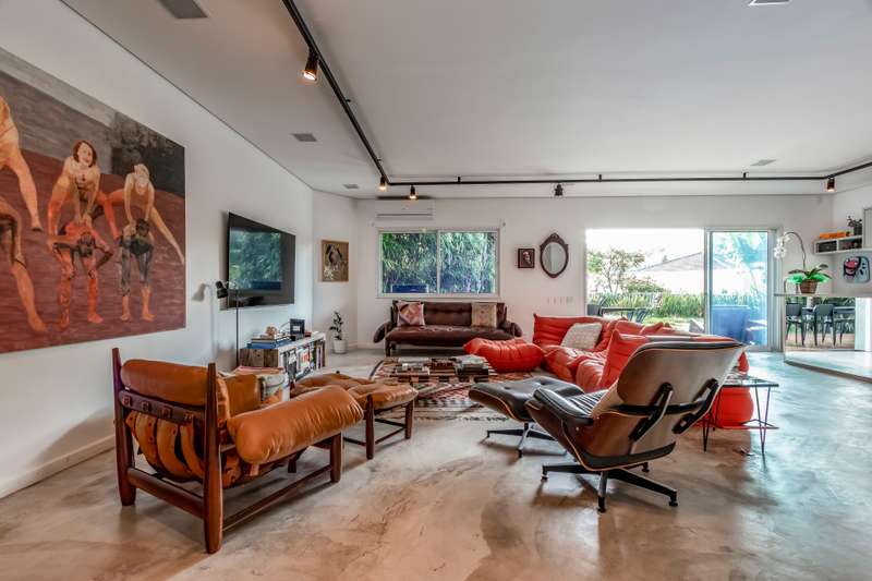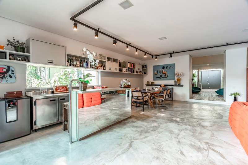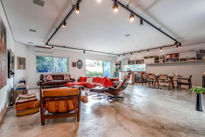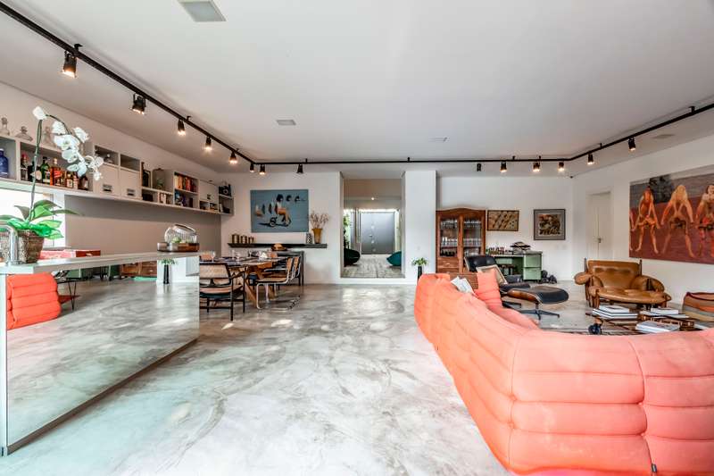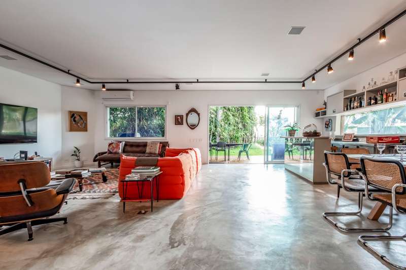 Amplo living em cimento queimado , com quatro ambientes ,todos voltados para o jardim com piscina.
