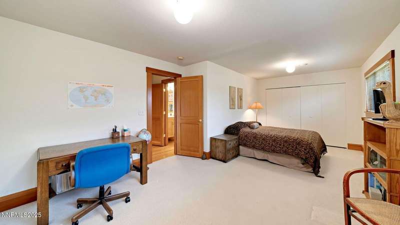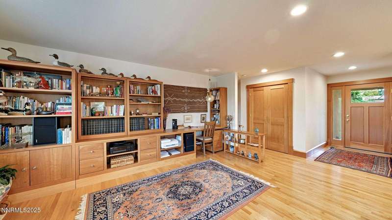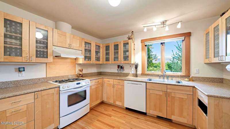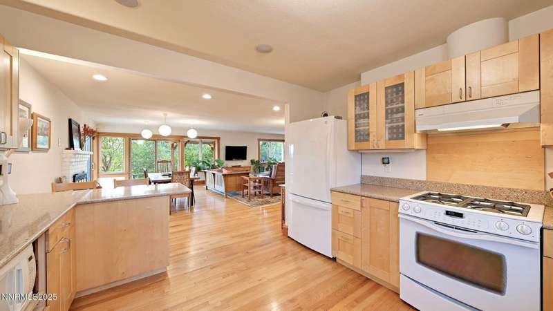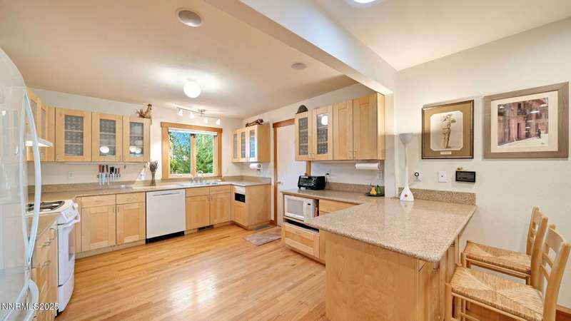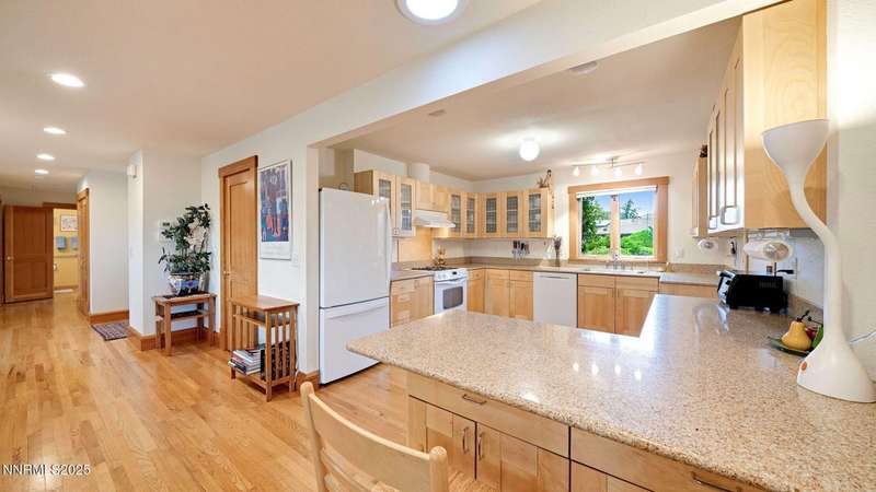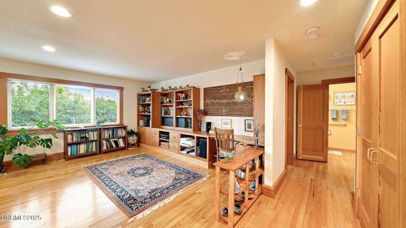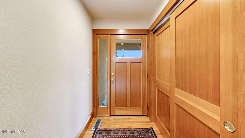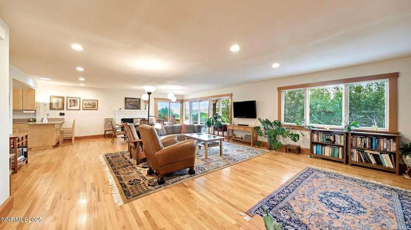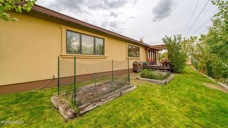 Discover the perfect blend of sustainability, comfort, and timeless design in this beautifully updated 2 bed, 2 bath single-story home, offering 1,810 sqft of light-filled living on a private, tree-lined 1-acre lot in desirable Southwest Reno. Thoughtfully upgraded with solar panels and an electric vehicle charging station, this home supports a low-impact lifestyle without compromising style or convenience. Step inside to find an inviting interior bathed in natural light from custom wood Pella windows. Warm solid oak wood flooring runs throughout the main living areas and kitchen, complemented by 5 solid hemlock fir wood trim and baseboards, solid hemlock fir wood doors, custom solid wood book cases, and custom quarter sawn white oak bathroom vanities-every detail speaks to quality craftsmanship. The updated kitchen with pantry and wine cellar and updated bathrooms offer modern style with timeless appeal, making this home truly move-in ready. Enjoy quiet mornings or evening gatherings on the expansive cedar deck with views of the city and mountains - no rear neighbors to disturb the serene setting. The home's orientation and thoughtful landscaping provide exceptional privacy with plenty of space for a potential ADU-perfect for a guest house, rental unit, or multigenerational living. Located in one of Southwest Reno's most sought-after neighborhoods, this rare gem is more than a home-it's a long-term investment in your lifestyle, your values, and your future.