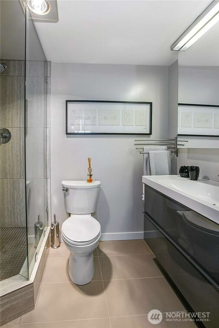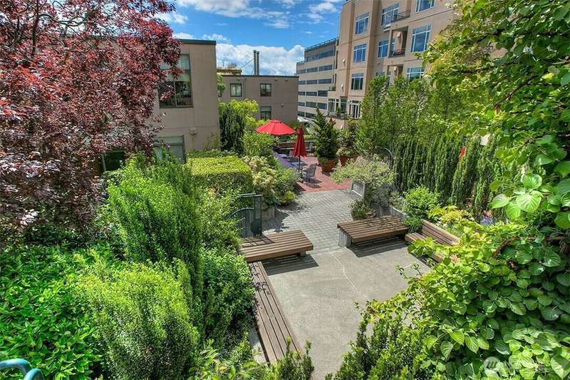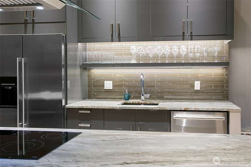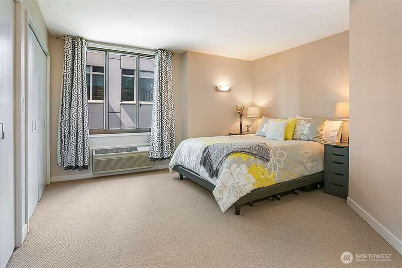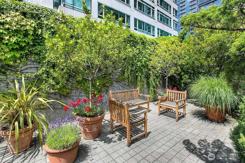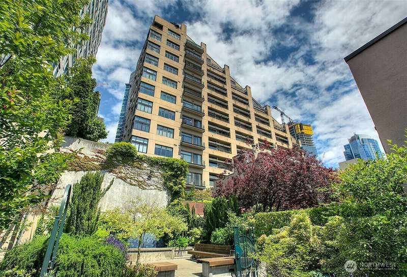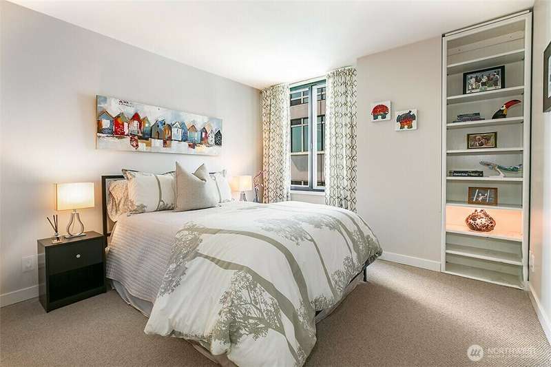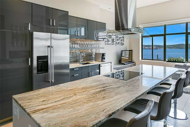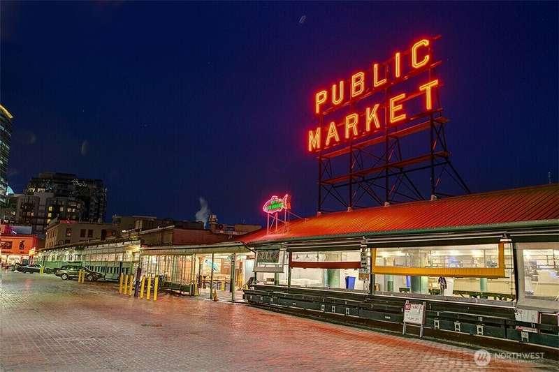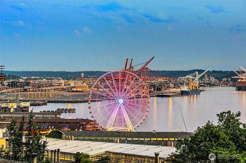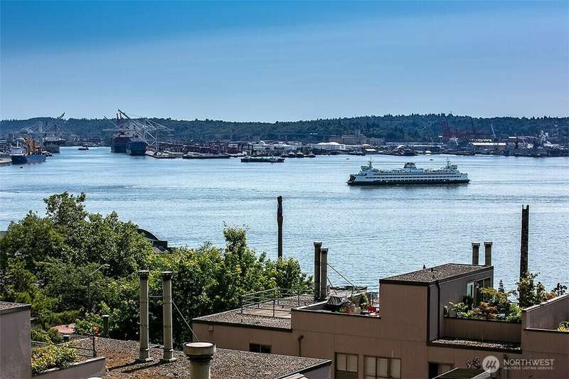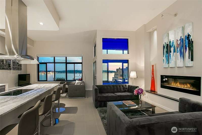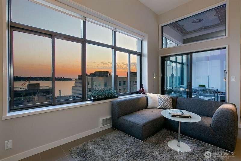 Modern luxury meets iconic Seattle views at Market Place North. This fully renovated, two-level residence offers sleek sophistication and thoughtful design throughout. Walls of windows frame unobstructed vistas of Elliott Bay, filling the open-concept living space with natural light. The dramatic great room features soaring ceilings and a showpiece kitchen with high-gloss cabinetry and slab granite counters. A sunroom invites quiet moments and waterfront views. Upstairs, two private bedroom suites with spa-like baths provide a peaceful retreat above the energy of the city and steps from the new Waterfront and Pike Place Market.
