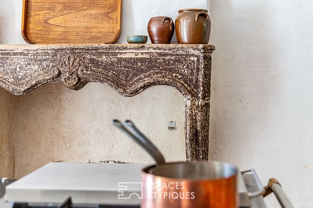 Following on, the kitchen, clad in Burgundy flagstones, also plays the card of the alliance between authenticity and design. Its fireplace, combining raw wood and antique elements, creates a warm atmosphere. A utility room completes this functional space, designed for everyday use as well as for large receptions.