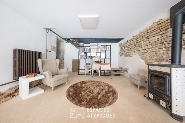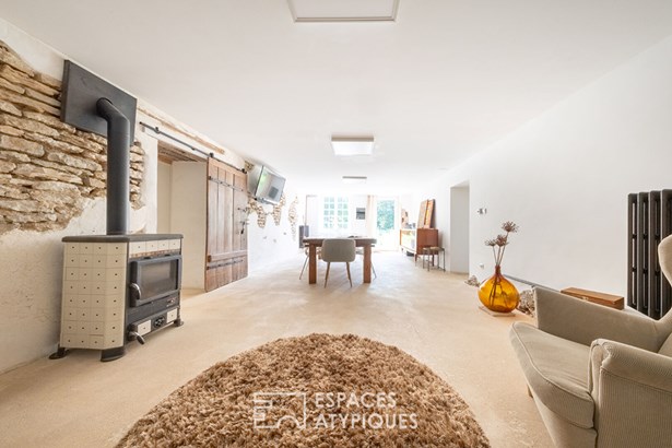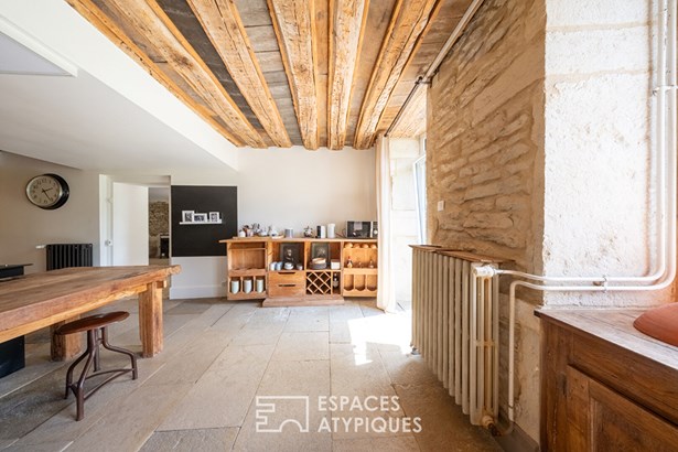 Past the coat of arms carved in Burgundy stone, the silent guardian of time, one discovers a unique universe where old and new harmoniously complement each other. The ground floor opens onto a vast living room, where the dining room and living room blend into a single volume. The raw concrete floor creates a subtle contrast with the thick walls and the nobility of the old materials, offering a quirky and refined feel.