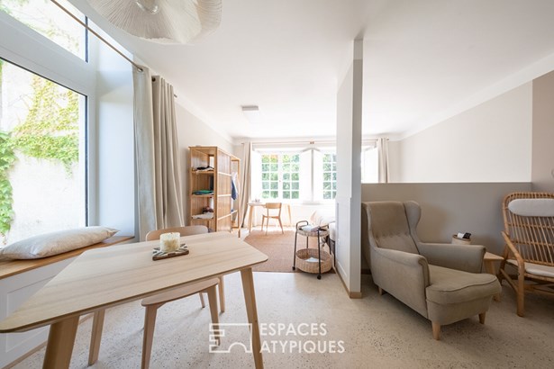 A contemporary staircase leads to the first floor, covering nearly 120 sqm. There, you'll find a refined master suite with a private bathroom and dressing room, a toilet, and a laundry room. A large, high-ceilinged, modular room can be converted into a relaxation area, bedroom, office, or games room. Further on, a separate, accessible apartment, fully equipped with a kitchen, bathroom, and reversible air conditioning, can accommodate family and friends, or, as is currently the case, generate income through seasonal rentals. This apartment also benefits from private access and a garden.