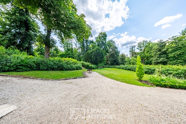 25 minutes from Dijon and 2 hours from Paris, on the edge of the national forest, lulled by the murmur of a river and protected by its century-old trees, lies an exceptional residence where five centuries of history interact with a bold contemporary renovation.