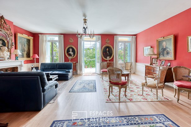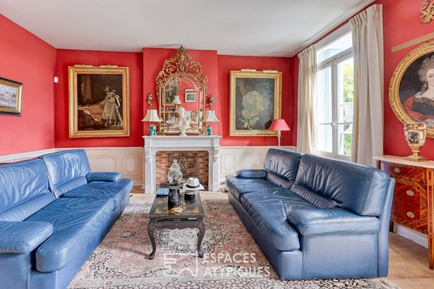 On the first floor, a characterful apartment features a spacious 40 sqm living room, high ceilings, and moldings on the walls. The fireplace, the room's central feature, brings charm and warmth to this bright living space.