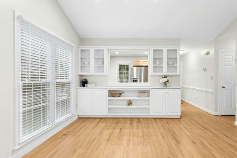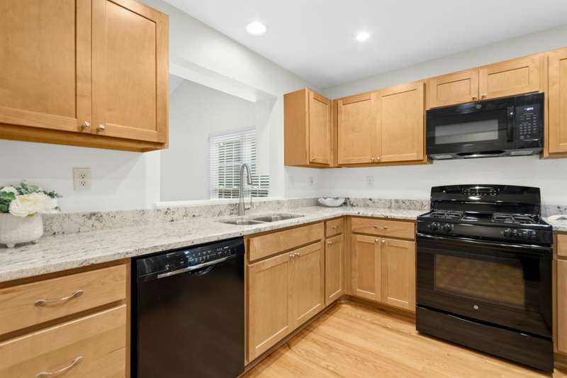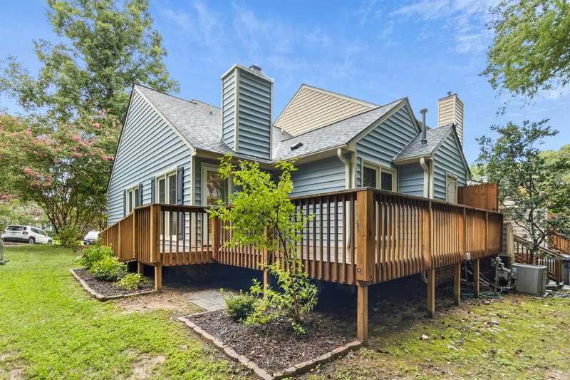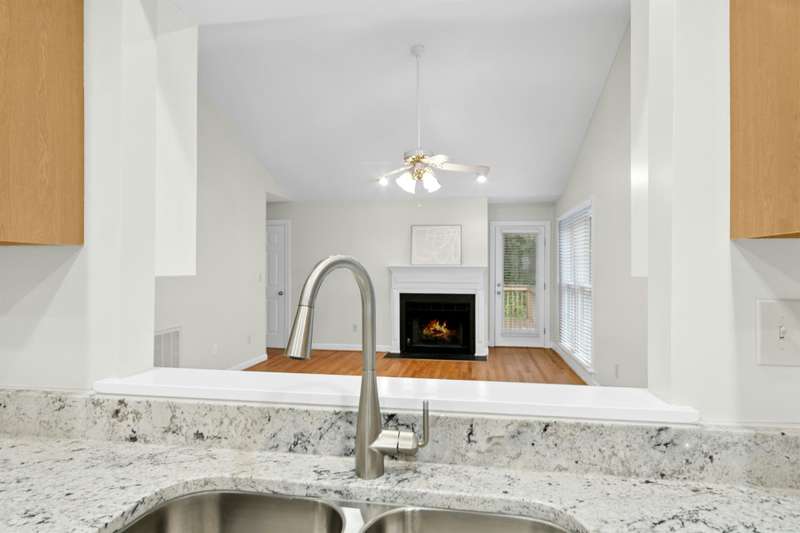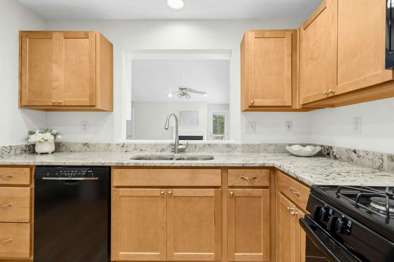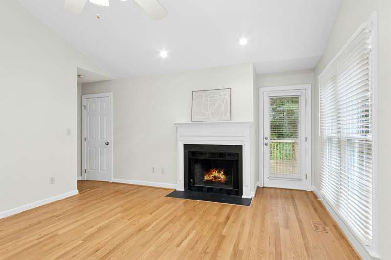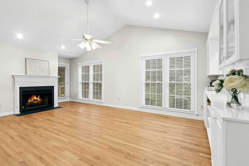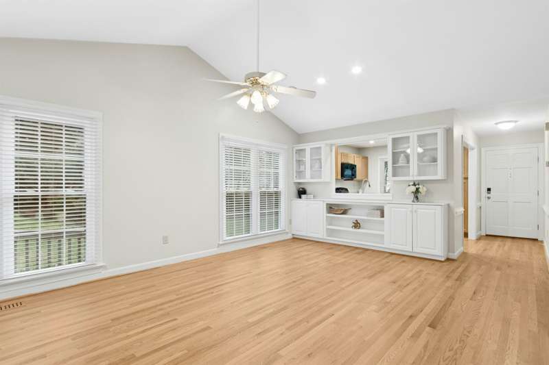 Enjoy easy living in this beautifully updated one level 2-bedroom, 2-bath end-unit townhouse. Sunlight fills the vaulted living and dining area, where freshly refinished hardwood floors, a cozy fireplace, and custom built-ins create a warm, inviting space. The kitchen's brand-new cabinets and countertops make cooking a pleasure. Your primary suite feels like a retreat with vaulted ceilings, plantation shutters, new carpet, a large walk-in closet, and a spa-inspired bath with a sleek tile shower and new vanity. The second bedroom also features new carpet and plantation shutters, along with an updated full bath. Step outside to a generous, wheelchair-accessible deck?perfect for morning coffee or evening gatherings. All of this, ready for you to move right in.