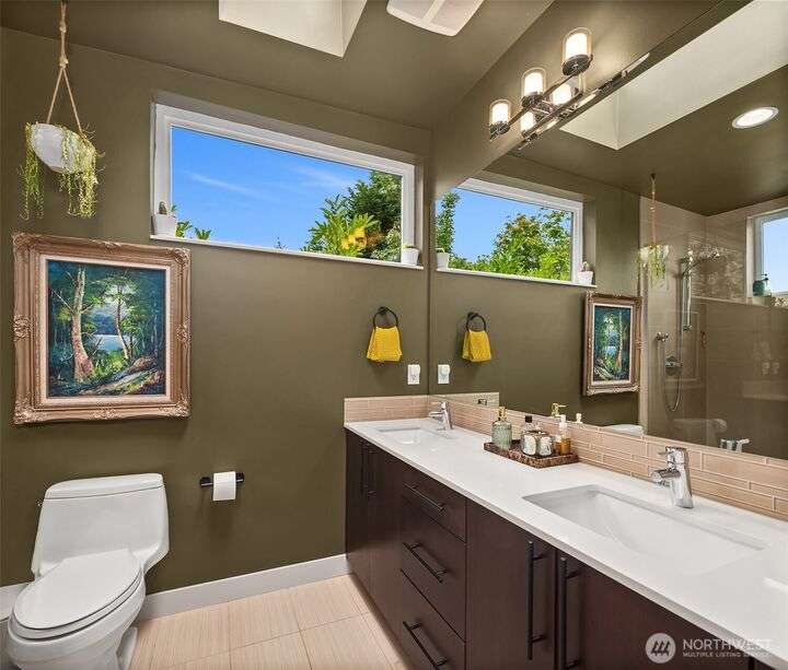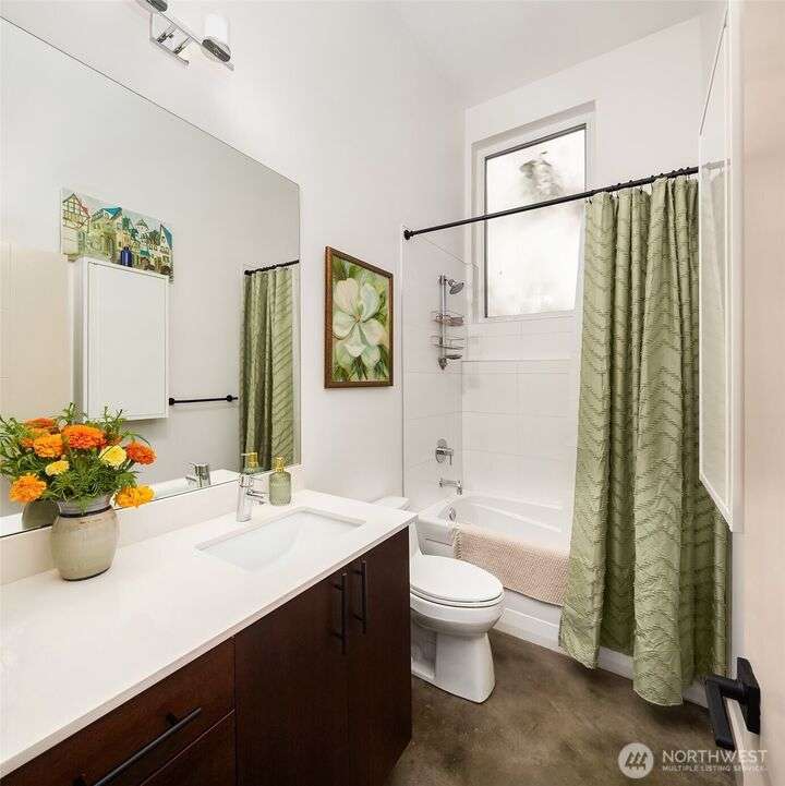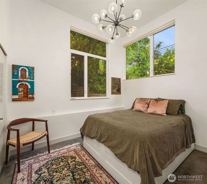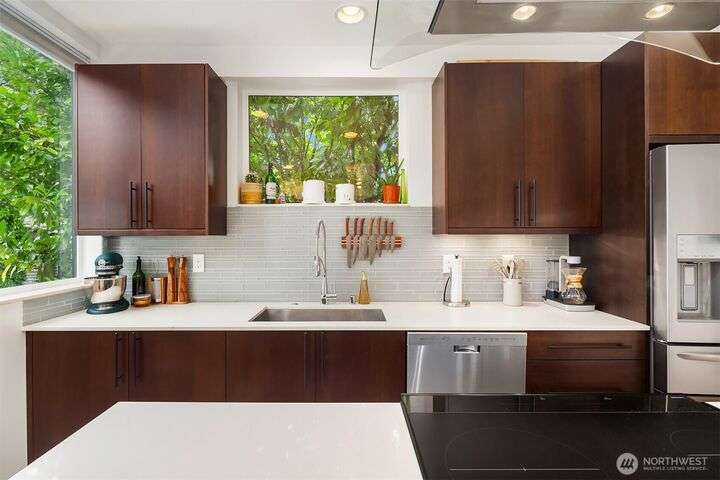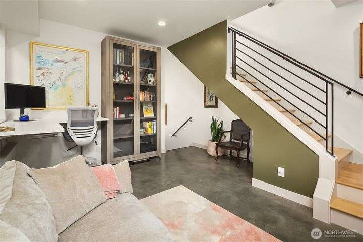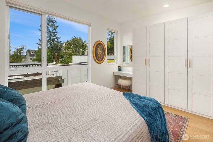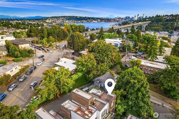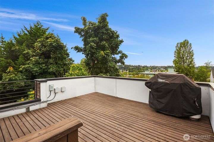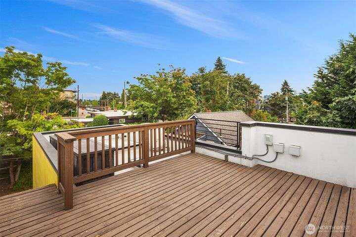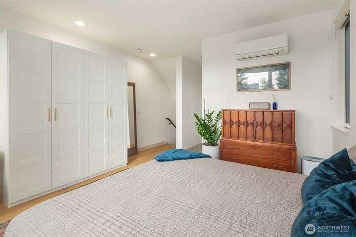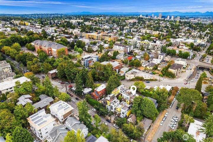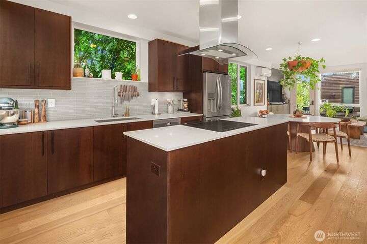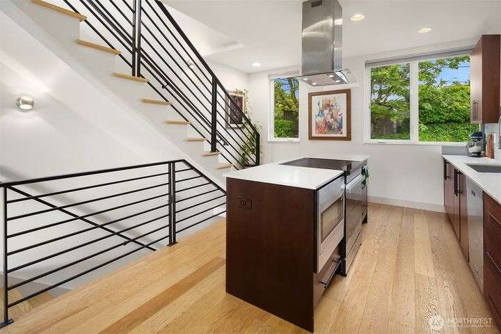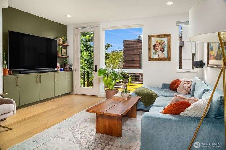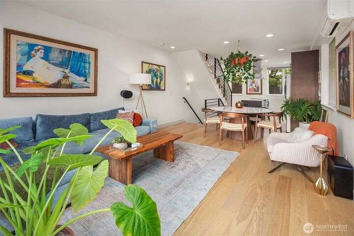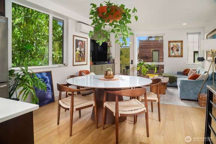 Modern 2-bed Fremont townhome w/ rooftop deck. Designed by award-winning B9 Architects it blends modern design w/ warm, inviting interiors. Light-filled open plan showcases wide-plank hardwoods, oversized windows, built-in media cabs & high-end finishes. Chef’s kitchen boasts quartz counters, new SS appl, sleek cabs & island. Primary Suite has expansive windows w/ treetop views & custom built-ins for addt’l storage. WIC & en-suite ¾ bath w/ skylights. Lower-level flex/rec rm w/ built-in desk for versatility. Entertain on a spacious rooftop deck w/ territorial & city views. Mini-split heat pumps for efficient heating & cooling. Blocks to Fremont dining, shops, parks & easy commute to DT, Ballard & Green Lake. In-city living at its finest.
