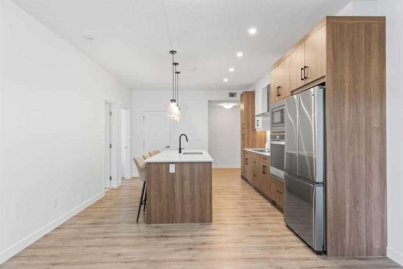 Looking for space + style? This 958 sq. ft. 2 bed/2 bath condo in Walden has tons of upgrades, 2 parking stalls, and a private deck with gate to green space. A true gem in the heart of the community! The unit can be accessed either through the main building entrance or via its own private ground-level entrance. The kitchen and bathrooms showcase custom tilework along with quartz island that comfortably seats four. A chimney-style range hood, counter-depth fridge, smooth cooktop, granite sink, pot lights, and under-cabinet lighting complete this stunning kitchen. The primary bedroom easily fits a king-sized bed and nightstands, and connects to a large walk-through closet leading to a beautiful ensuite with a frameless glass shower, quartz countertops, two sinks and built-in cabinetry. The second bedroom fits a kingsize bed too and offers direct access to the main 4-piece bath. The heated underground stall is conveniently located near the entrance and direct access to the assigned storage locker. With its rare floor plan, extensive upgrades, and unbeatable outdoor space, this condo is truly a gem in family friendly Walden.