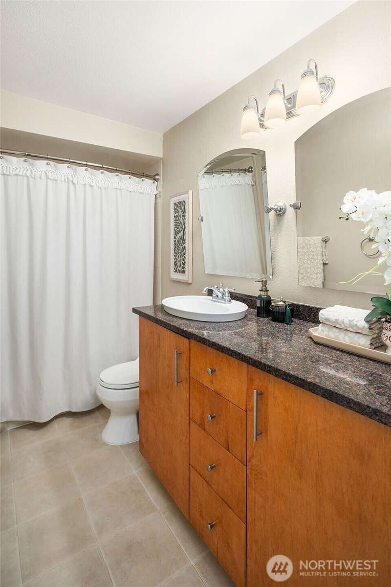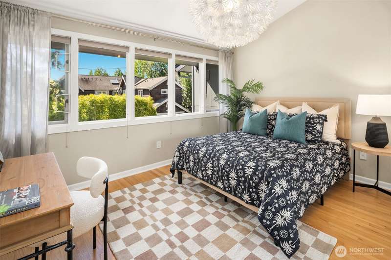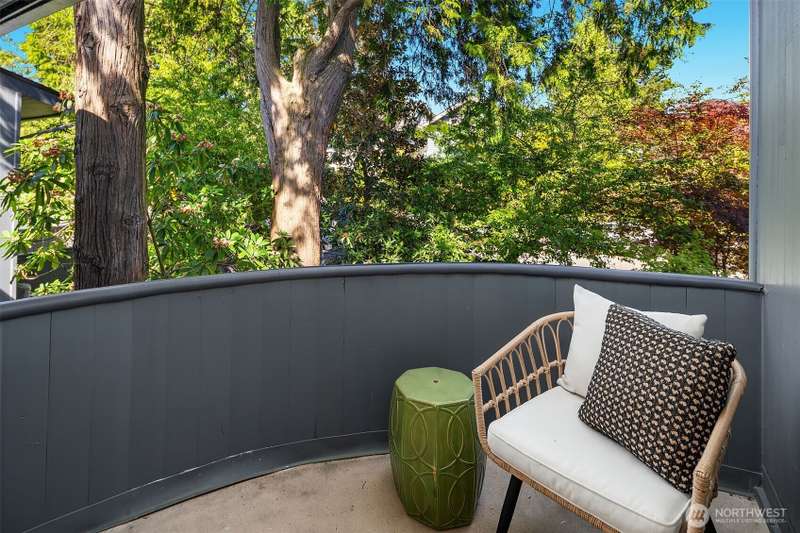 Welcome home to this spacious, quiet Madison Park townhouse, one block from Lake Washington. Enter through private gate to tranquil garden, mature trees, and large deck. Natural light pours through walls of windows. Kitchen with bar seating, dining area and double French doors to sunny back deck. Spacious primary bedroom features great storage with custom California Closet wall system, high ceilings with clerestory windows and treetop balcony overlooking courtyard below. Additional bedroom or office, full bath, and newer Samsung washer and dryer complete 2nd level. Designated parking space in back. Ideal location, just blocks to beach, shops, and dining. The best of Seattle living is waiting for you in Madison Park.