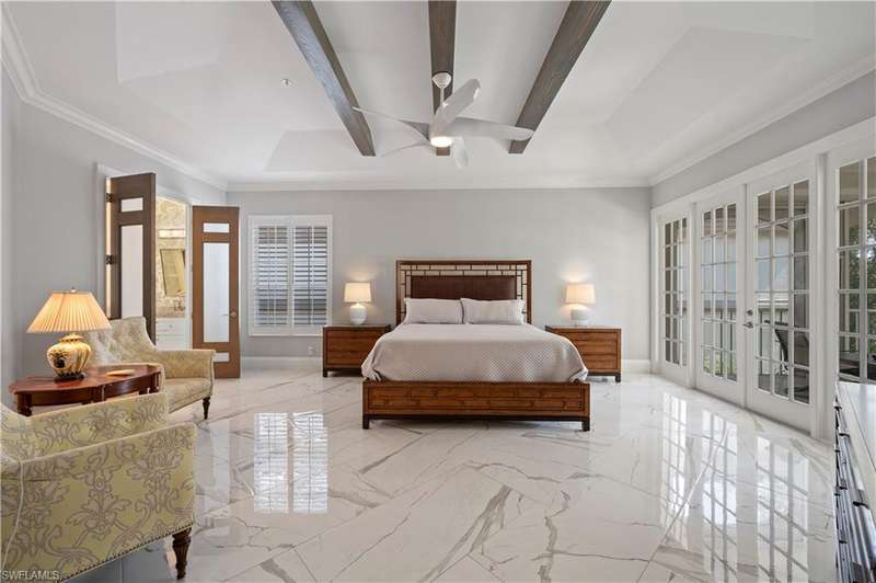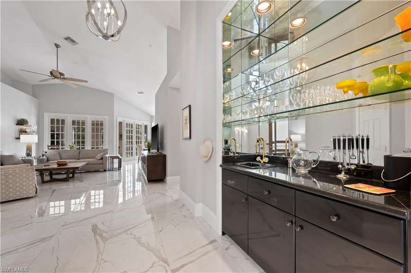 This impeccably modern second-floor retreat in the prestigious Colonnade of Park Shore redefines Naples luxury living. Spanning almost 2,500 square feet, this residence features a soaring double-height entry, a private elevator, a dedicated garage, and a generous screened lanai with automated storm shutters. Every inch exudes refined elegance and meticulous attention to detail. Inside, discover sophisticated touches, with built in bar, polished marble flooring throughout the living areas and primary suite, crisp paint, custom crown moldings, and sleek marble countertops in the gourmet kitchen and spa-inspired bathrooms. Enhanced with bespoke cabinetry, frameless glass showers, a decadent soaking tub in the primary bath, coffered ceilings, and stylish blinds, the home radiates modern luxury. Solid-core 10ft doors with etched glass panels and advanced ambient lighting complete the elevated aesthetic. Enjoy the large outdoor lanai with a spacious patio perfect for your morning coffee or