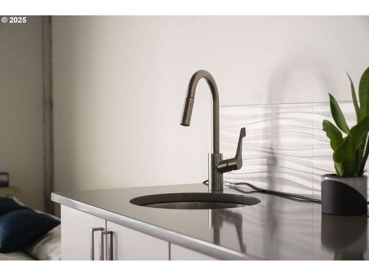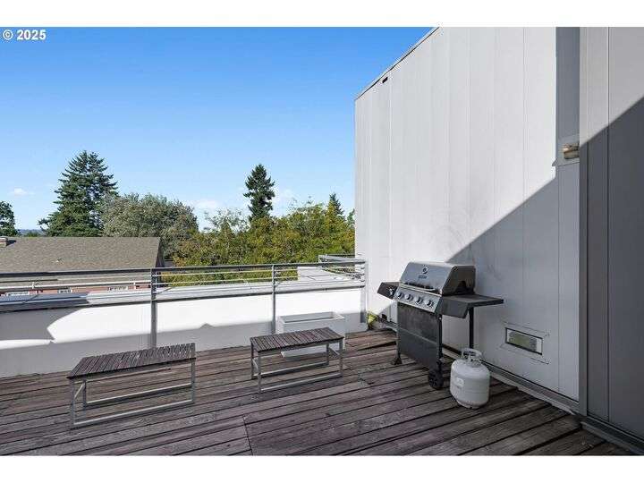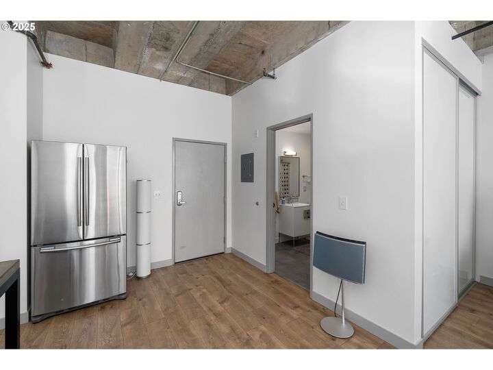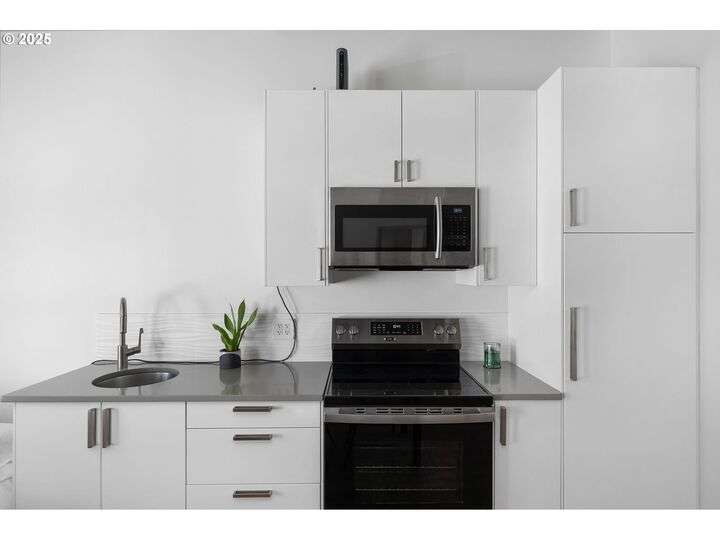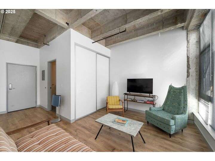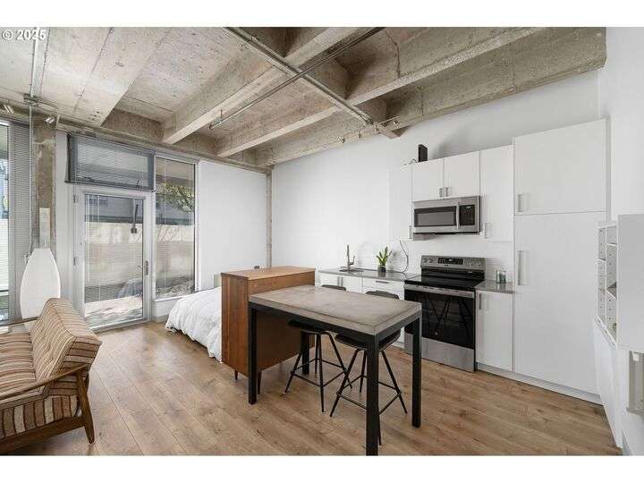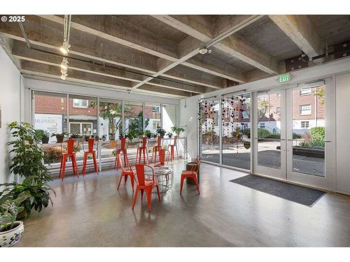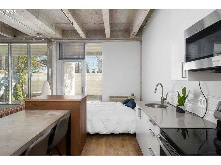 Sophisticated industrial loft in Montavilla. Facade of windows with 11ft ceilings blanket this artistic space in natural light. $30K in seller upgrades include kitchen cabinets w/ Italian hardware, quartz countertops, new GE range with air fry feature, plank flooring, new paint, lighting, energy efficient heat pump, closet with Elfa shelving and custom doors, bathroom fixtures and floor. Private 250 sq/ft patio. Secured storage. Community deck w/ Mt. Tabor views, Close to E. Glisan business district and Montavilla Park.