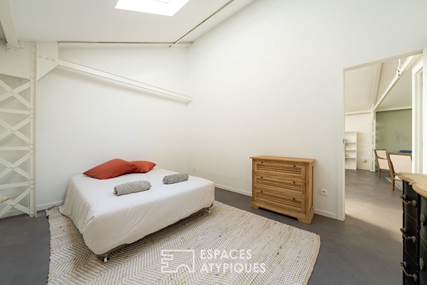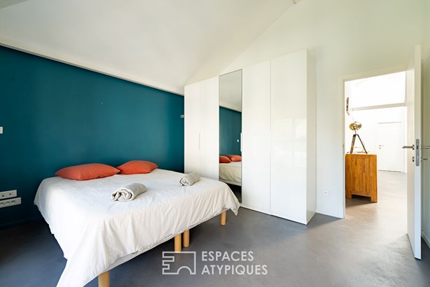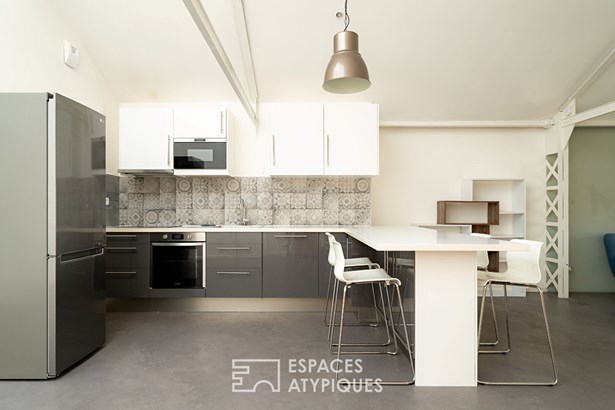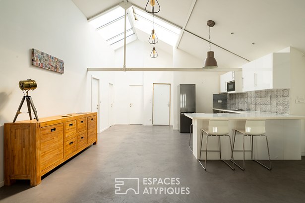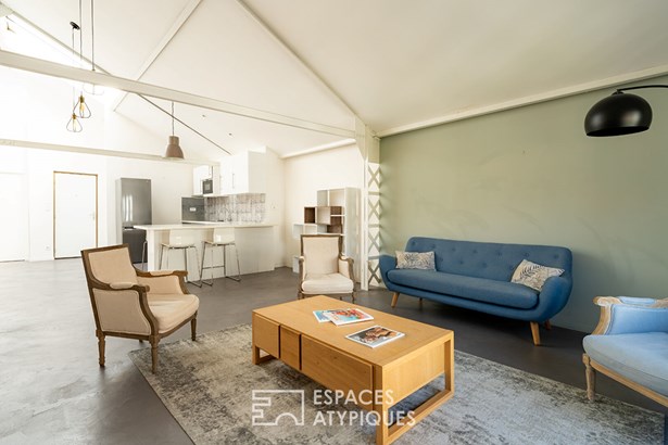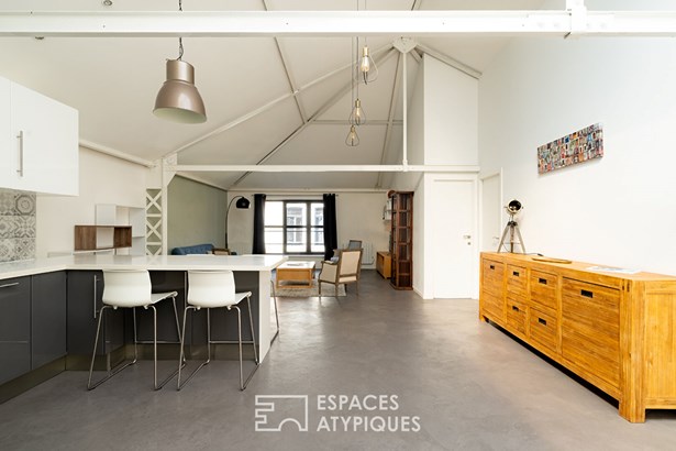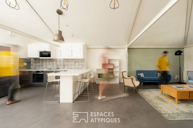 Upon entering, you discover a spacious living room of over 50m2, bathed in natural light thanks to large windows and enhanced by high ceilings. The main space is organized around a fully equipped open kitchen with a central island, comfortably combining a dining area and a living room, ideal for entertaining.