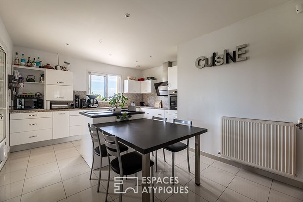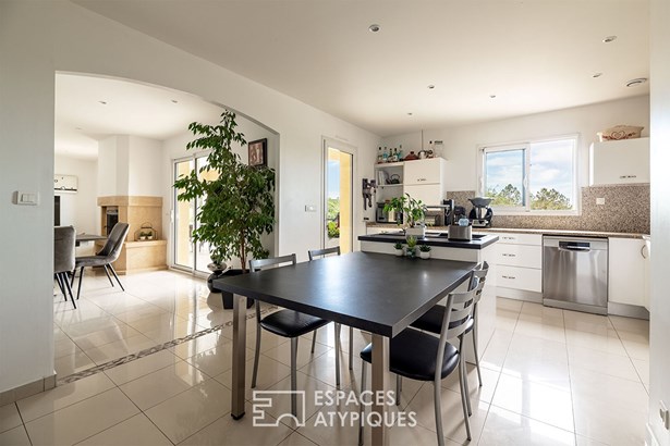 The generous living room of more than 60M2 integrates a spacious and functional kitchen ensuring the perfect concoction of all your dishes.