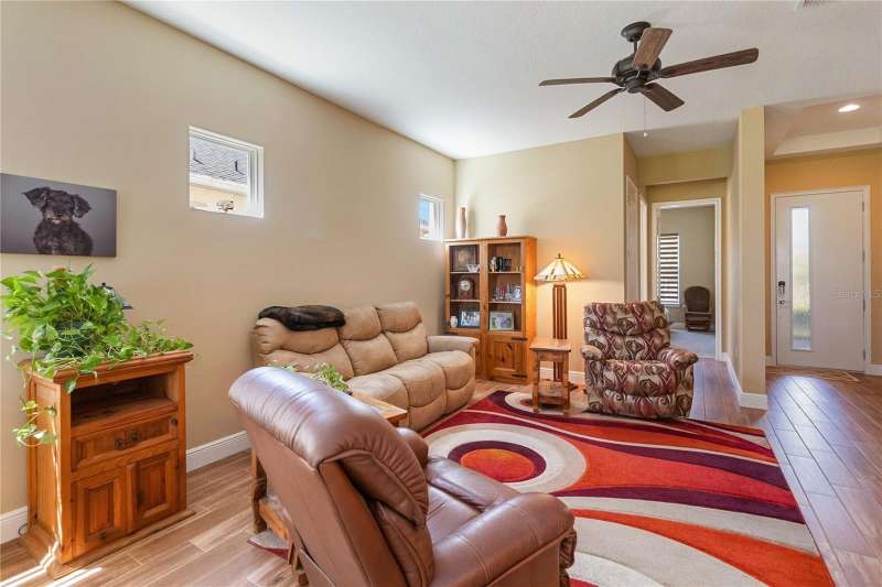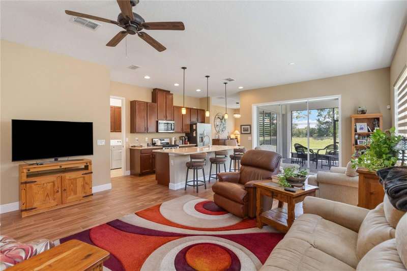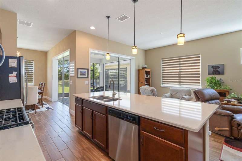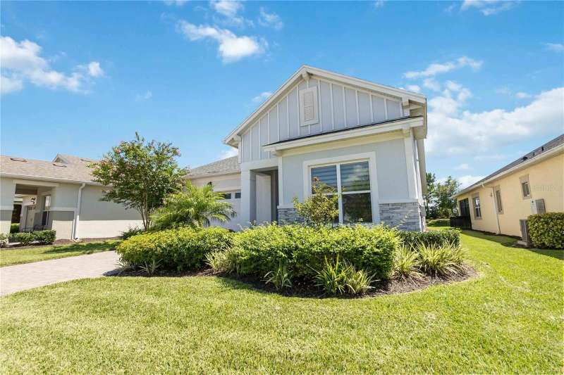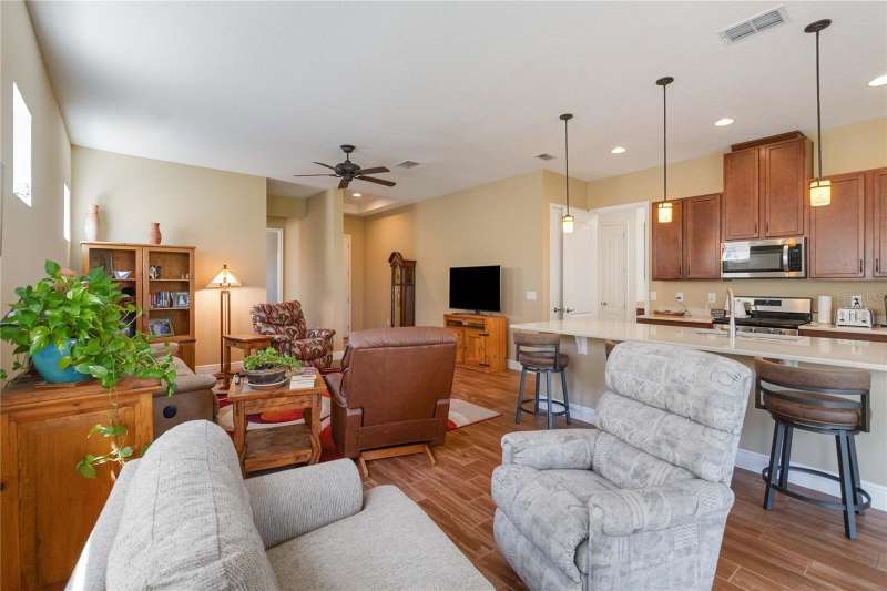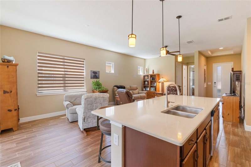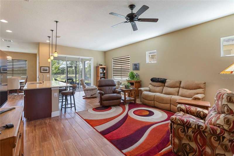 Meticulously kept Anna Maria floor plan located in the well sought after Gated 55+ Active Del Webb Twin Lakes community. Property featuring Custom painting and stunning staggered Plank tile flooring throughout. Custom 42" kitchen Cabinets, Island features custom edged Quartz countertop, pantry, custom pendant lights, and chandelier in the formal dining area/Den/Office. The living room features plank flooring and zebra custom shades. Sliding glass doors lead to screened in Lanai with custom ceiling fan & light to enjoy your morning coffee. Den/Office area features Sliding glass doors. Master bedroom with custom zebra blinds, trey ceiling, and ceiling fan. The master bedroom bathroom features custom glass doors, diamond shaped flooring in the shower, and custom tiling. Double vanity edged Quartz countertops. Large, carpeted walk-in closet. Laundry room tailored with upgraded upper cabinets as well as lower cabinets for great storage, ceramic tile flooring, and beautiful quartz countertops. Guest bedroom ceiling fan and custom zebra shades. The Garage has built-in Storage closets. Amenities include a Resort style pool, Lap Pool and 3rd pool on the carriage house side, 20,000 square foot Gorgeous Clubhouse, State of the art Fitness Center, Flex room, Tennis Courts, Putting Green, Walking Trails, Pickle Ball Court, Fishing, and Pontoon Boats and Jon boat to use on Live Oak Lake! The community has many active and socializing activities. View today!