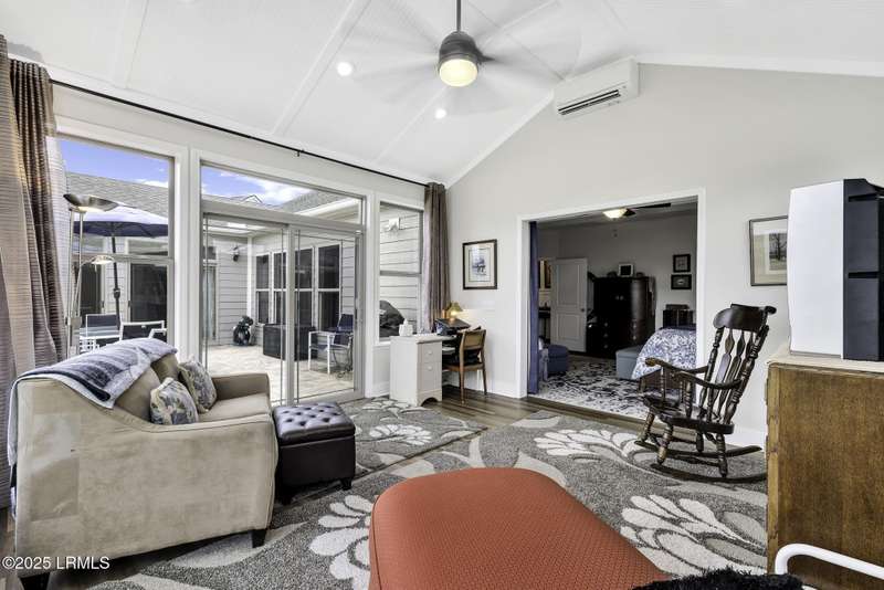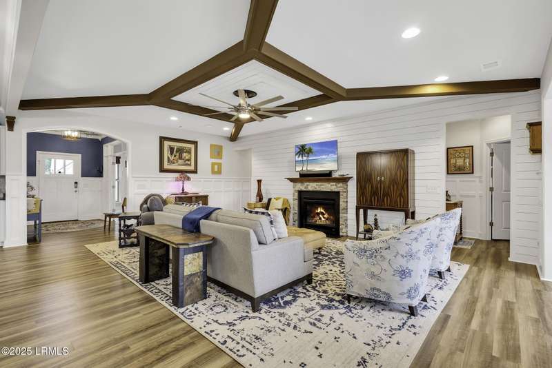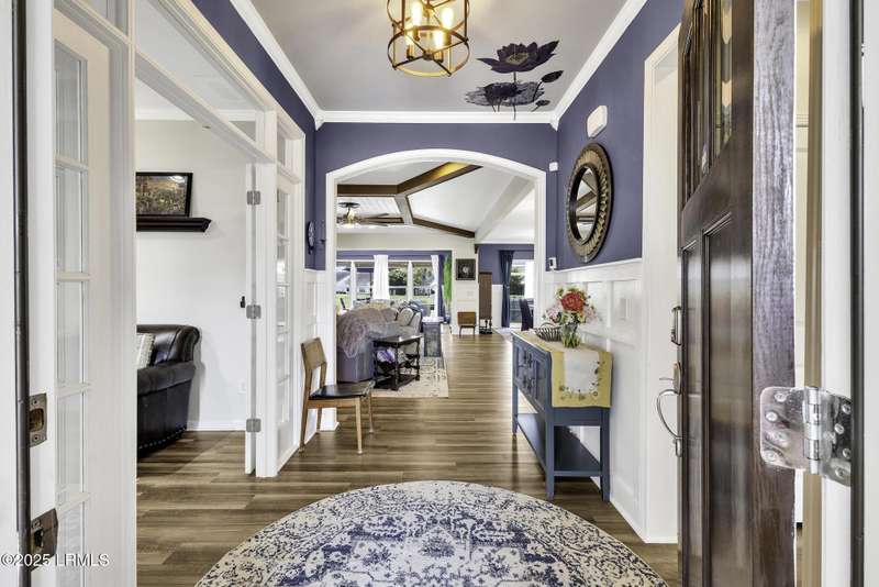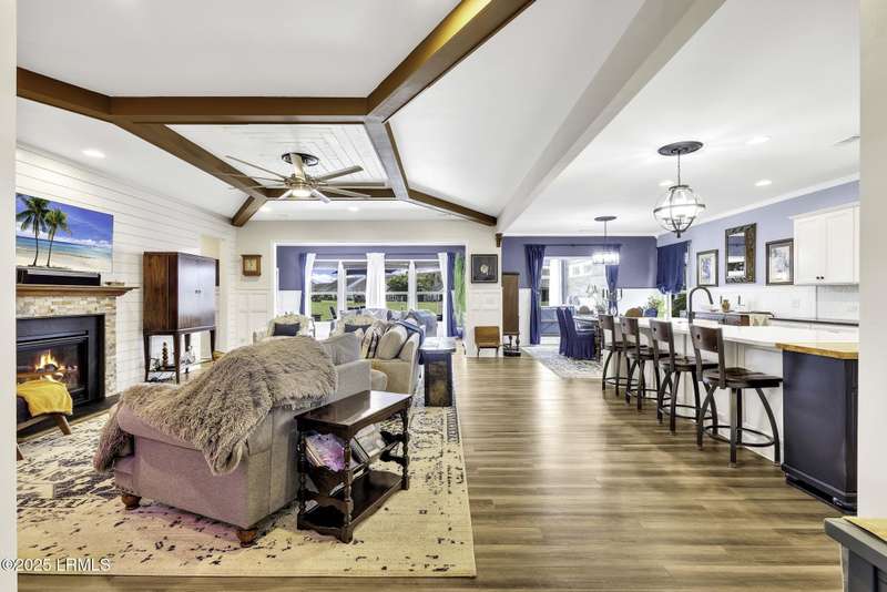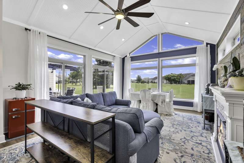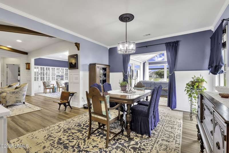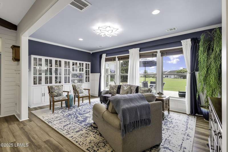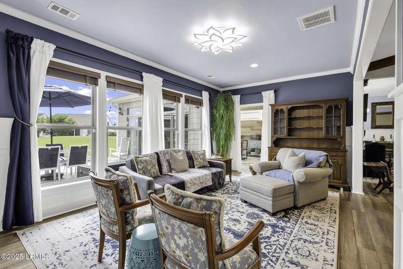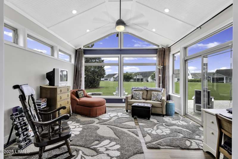 Exquisitely updated, spacious, 3 Bed 3 Bath approx. 3,286 sq ft Dunwoody Way with TWO sun filled All Season Rooms, each with their own Mini Splits, plus a Carolina Room with built in display/storage. Large L/Room boasts striking timber beam ceiling, shiplap wall, Nat Gas fireplace. Entertainers delight Eat In Kitchen with Quartz C/tops, large Island, Farmhouse sink, SS Apps, Walk In Pantry. Other features: Epoxy floored 2 Car & Golf Cart Garage, Walk Up Attic, separate Office/Den, designer lighting, tons of storage, copious crown molding, extensive paneling accents, sumptuous Master Suite, grand Golf views, solar film. Close to amenities.
