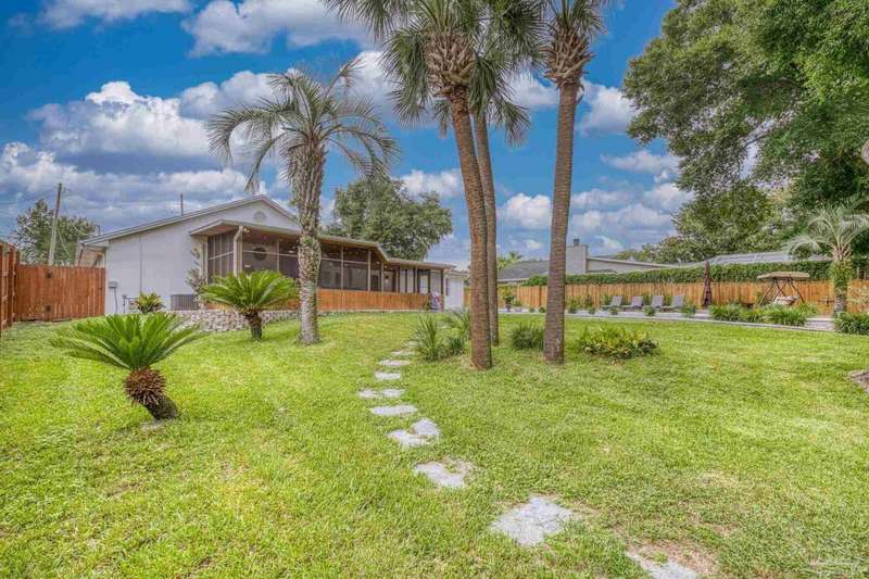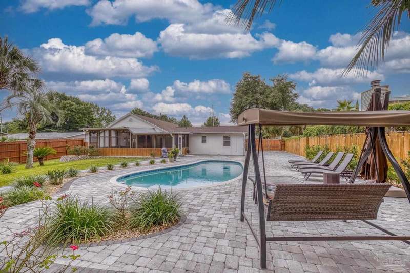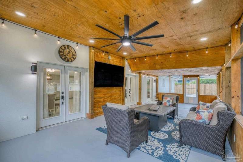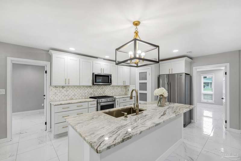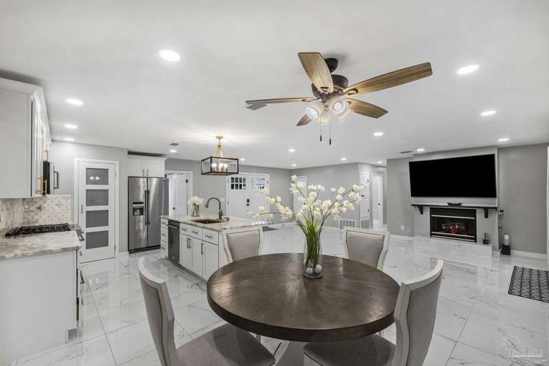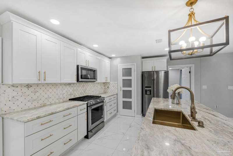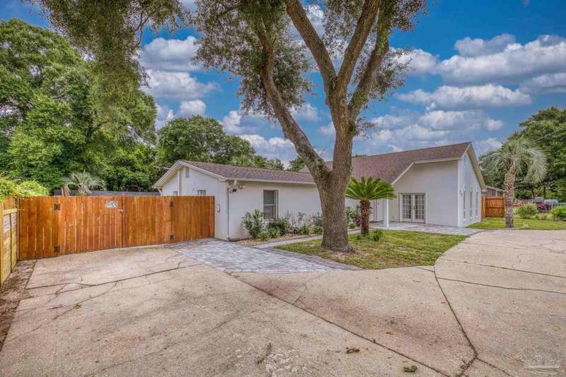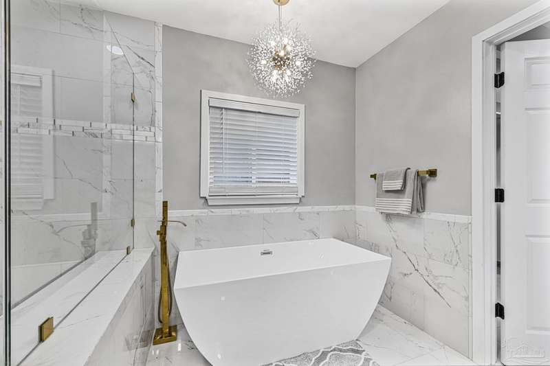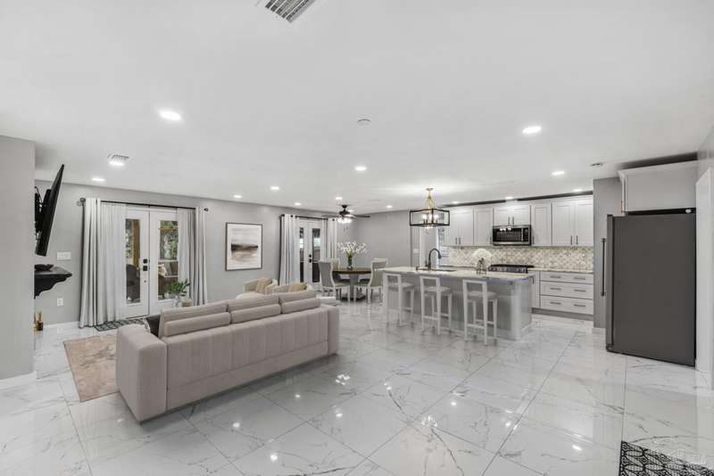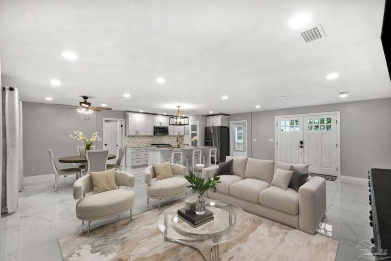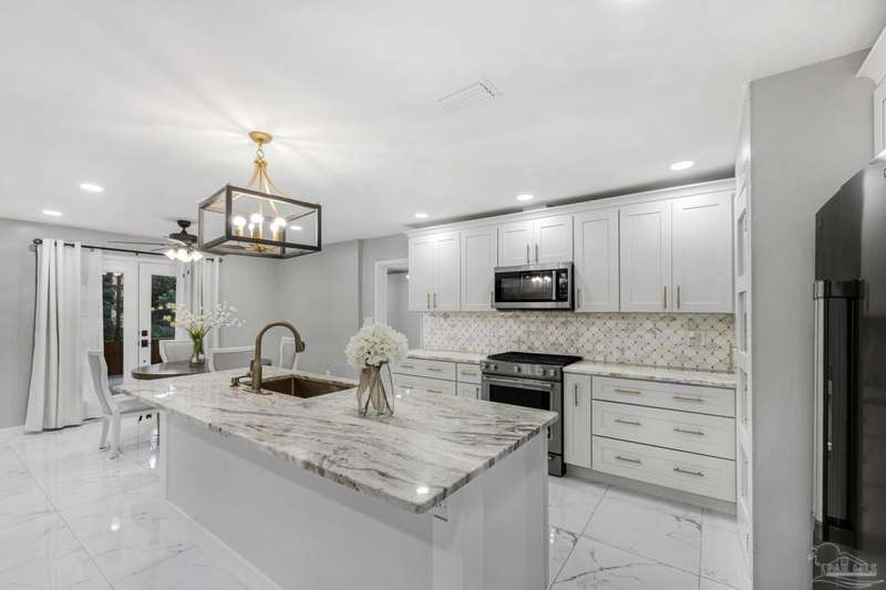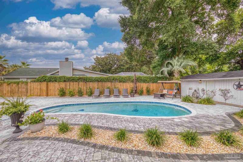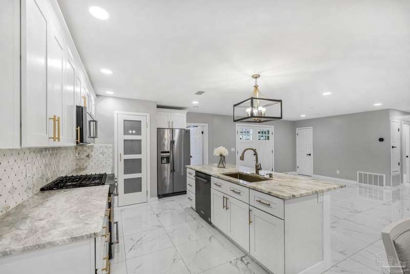 This completely renovated 5-bedroom home offers modern upgrades, timeless design, and a prime location just minutes from Crab Island, HarborWalk Village, Destin Elementary, and Joe's Bayou Boat Launch. The home was fully gutted and rebuilt with new electrical (including panels inside and out), updated lighting with 3-option dimmer controls, ceiling fans, and a Tesla Supercharger compatible with other EVs. A cohesive marble-look large tile flooring flows throughout the entire home, and the bathroom tile and finishes are thoughtfully designed to match for a seamless aesthetic. The open living space features a gas fireplace with new gas lines, flowing into a reimagined kitchen with new cabinetry, KitchenAid gas range, and dishwasher. A built-in speaker system conveys with the home, enhancing both everyday living and entertaining. The primary suite is a true retreat with a massive walk-in closet, spa-style bath featuring a soaking tub, chandelier, and built-in sound system with voice control. A split floor plan offers privacy, and the flooring was installed with full-bed mortar for long-term durability. All new ductwork and two attic fans help keep utility costs down. The roof was installed in 2021. Step outside to your private backyard oasis featuring a brand-new (2024) in-ground, kidney-shaped gunite chlorine pool with new pavers, pump, waterfall, accent lighting, and updated piping. All pool equipment will stay, with most stored neatly in the outbuilding and the vacuum kept outside. Four pool loungers and an umbrella will also convey (swing does not).The backyard also features a new privacy fence with double gate access for boat or RV parking, a climate-controlled storage building, and an enclosed side yard for extra storage. A circular driveway enhances curb appeal, and the newly landscaped yard adds to the home's fresh, modern feel. No HOA. While the City of Destin restricts short-term rentals in this area, some owners still pursue them independently.