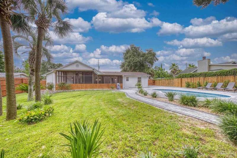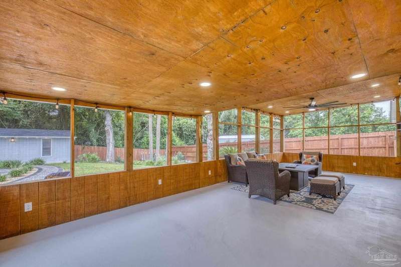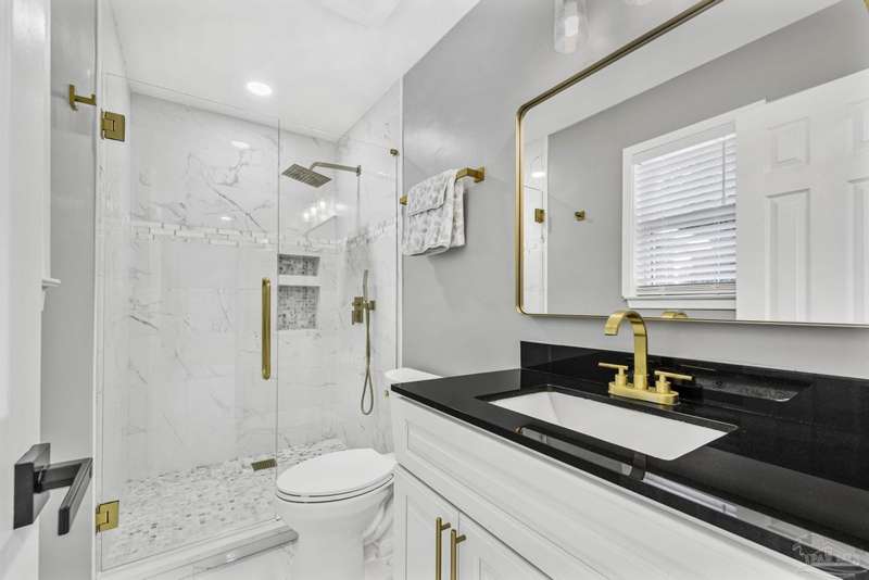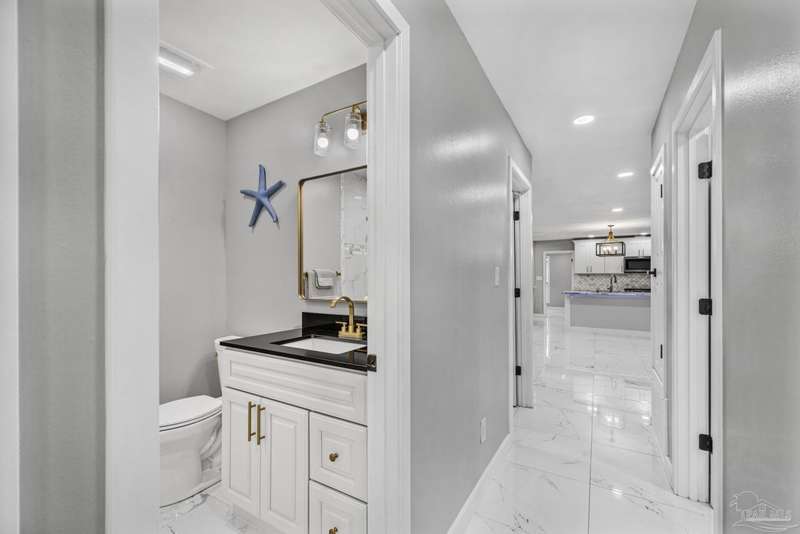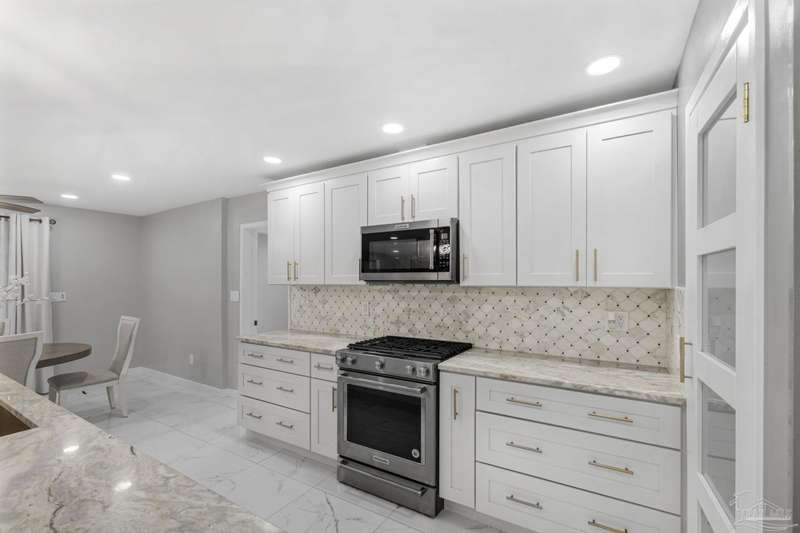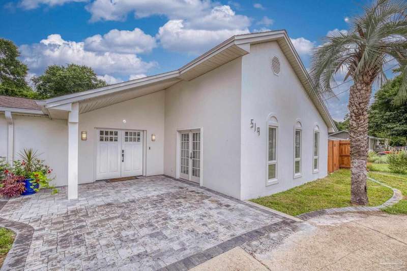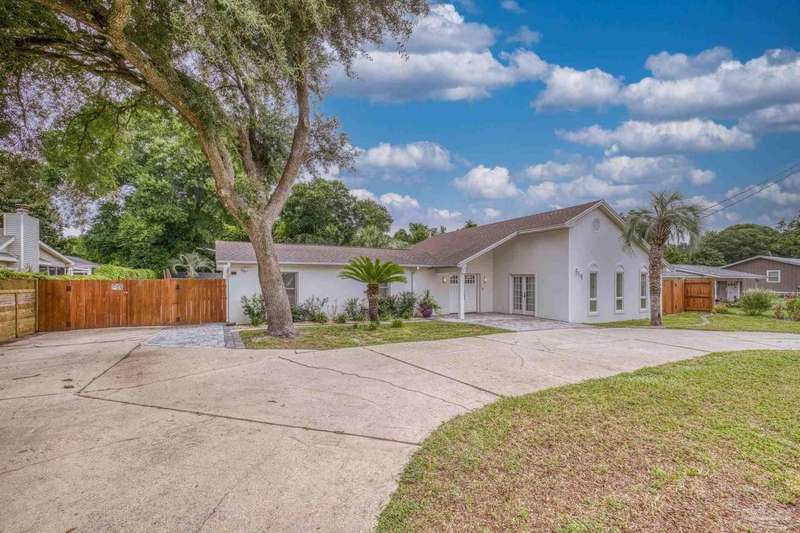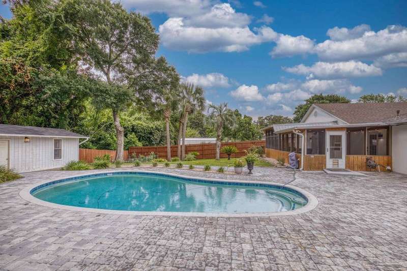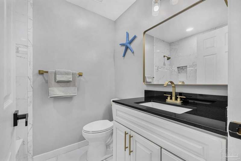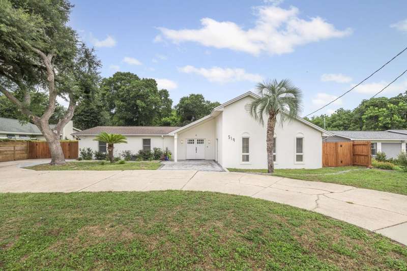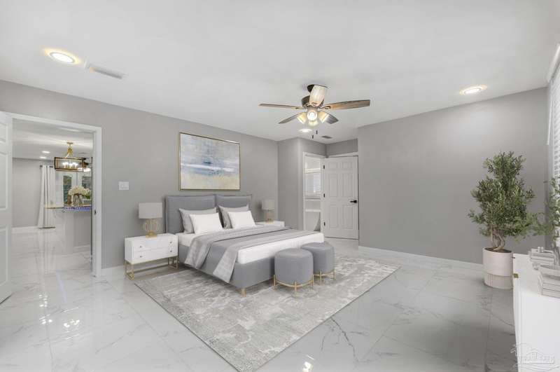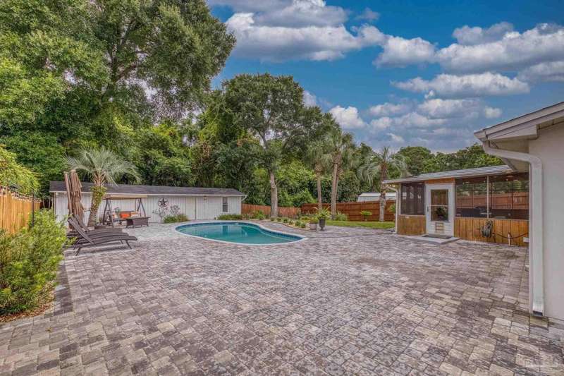This completely renovated 5-bedroom home offers modern upgrades, timeless design, and a prime location just minutes from Crab Island, HarborWalk Village, Destin Elementary, and Joe's Bayou Boat Launch. The home was fully gutted and rebuilt with new electrical (including panels inside and out), updated lighting with 3-option dimmer controls, ceiling fans, and a Tesla Supercharger compatible with other EVs. A cohesive marble-look large tile flooring flows throughout the entire home, and the bathroom tile and finishes are thoughtfully designed to match for a seamless aesthetic. The open living space features a gas fireplace with new gas lines, flowing into a reimagined kitchen with new cabinetry, KitchenAid gas range, and dishwasher. A built-in speaker system conveys with the home, enhancing both everyday living and entertaining. The primary suite is a true retreat with a massive walk-in closet, spa-style bath featuring a soaking tub, chandelier, and built-in sound system with voice control. A split floor plan offers privacy, and the flooring was installed with full-bed mortar for long-term durability. All new ductwork and two attic fans help keep utility costs down. The roof was installed in 2021. Step outside to your private backyard oasis featuring a brand-new (2024) in-ground, kidney-shaped gunite chlorine pool with new pavers, pump, waterfall, accent lighting, and updated piping. All pool equipment will stay, with most stored neatly in the outbuilding and the vacuum kept outside. Four pool loungers and an umbrella will also convey (swing does not).The backyard also features a new privacy fence with double gate access for boat or RV parking, a climate-controlled storage building, and an enclosed side yard for extra storage. A circular driveway enhances curb appeal, and the newly landscaped yard adds to the home's fresh, modern feel. No HOA. While the City of Destin restricts short-term rentals in this area, some owners still pursue them independently.