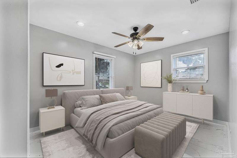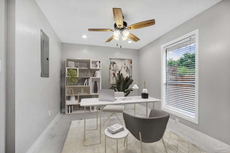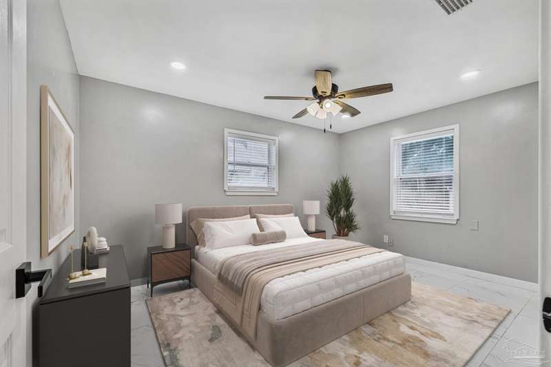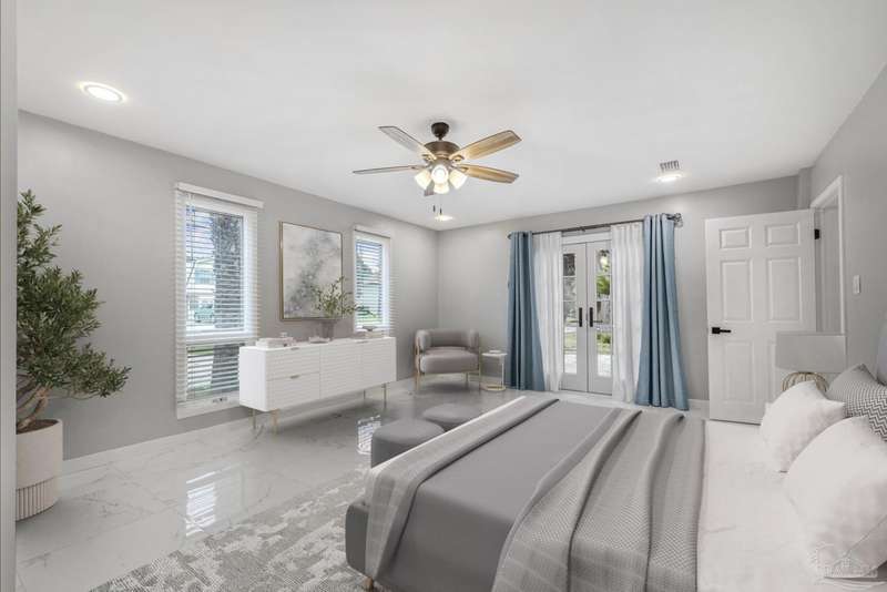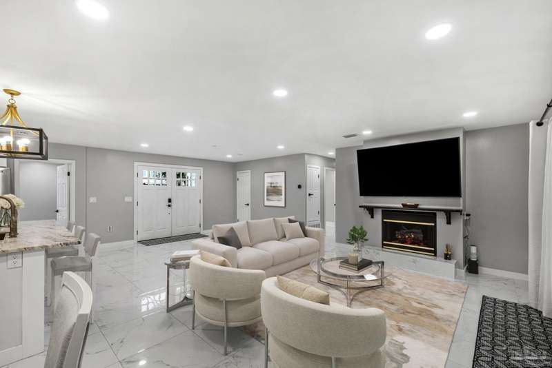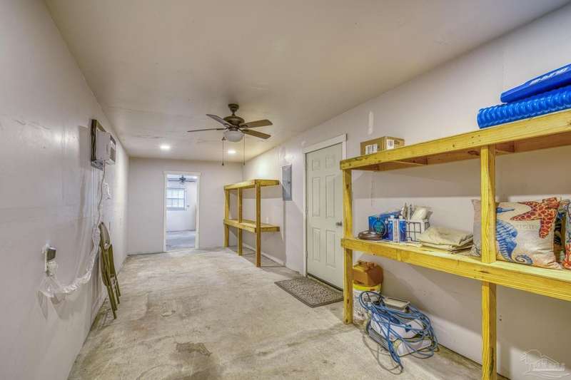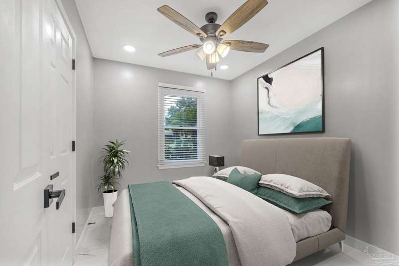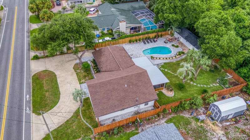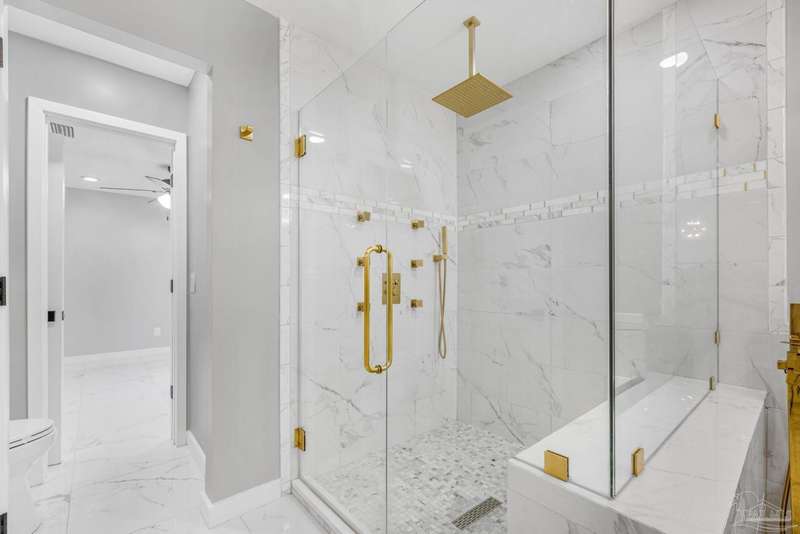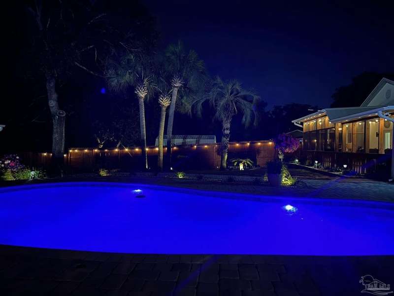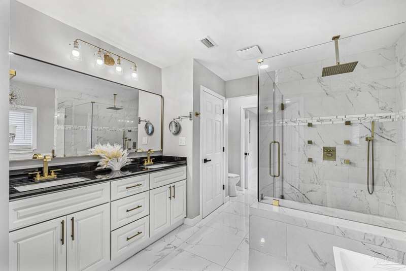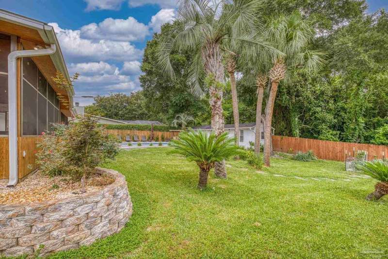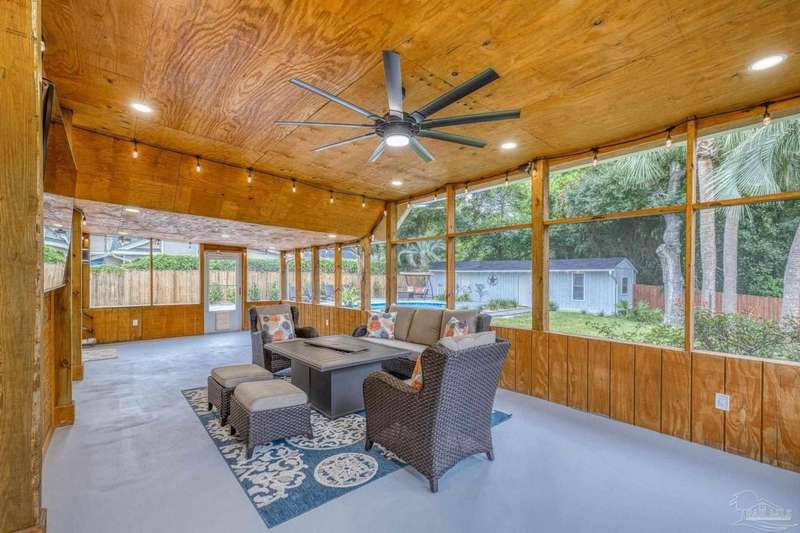 This completely renovated 5-bedroom home offers modern upgrades, timeless design, and a prime location just minutes from Crab Island, HarborWalk Village, Destin Elementary, and Joe's Bayou Boat Launch. The home was fully gutted and rebuilt with new electrical (including panels inside and out), updated lighting with 3-option dimmer controls, ceiling fans, and a Tesla Supercharger compatible with other EVs. A cohesive marble-look large tile flooring flows throughout the entire home, and the bathroom tile and finishes are thoughtfully designed to match for a seamless aesthetic. The open living space features a gas fireplace with new gas lines, flowing into a reimagined kitchen with new cabinetry, KitchenAid gas range, and dishwasher. A built-in speaker system conveys with the home, enhancing both everyday living and entertaining. The primary suite is a true retreat with a massive walk-in closet, spa-style bath featuring a soaking tub, chandelier, and built-in sound system with voice control. A split floor plan offers privacy, and the flooring was installed with full-bed mortar for long-term durability. All new ductwork and two attic fans help keep utility costs down. The roof was installed in 2021. Step outside to your private backyard oasis featuring a brand-new (2024) in-ground, kidney-shaped gunite chlorine pool with new pavers, pump, waterfall, accent lighting, and updated piping. All pool equipment will stay, with most stored neatly in the outbuilding and the vacuum kept outside. Four pool loungers and an umbrella will also convey (swing does not).The backyard also features a new privacy fence with double gate access for boat or RV parking, a climate-controlled storage building, and an enclosed side yard for extra storage. A circular driveway enhances curb appeal, and the newly landscaped yard adds to the home's fresh, modern feel. No HOA. While the City of Destin restricts short-term rentals in this area, some owners still pursue them independently.