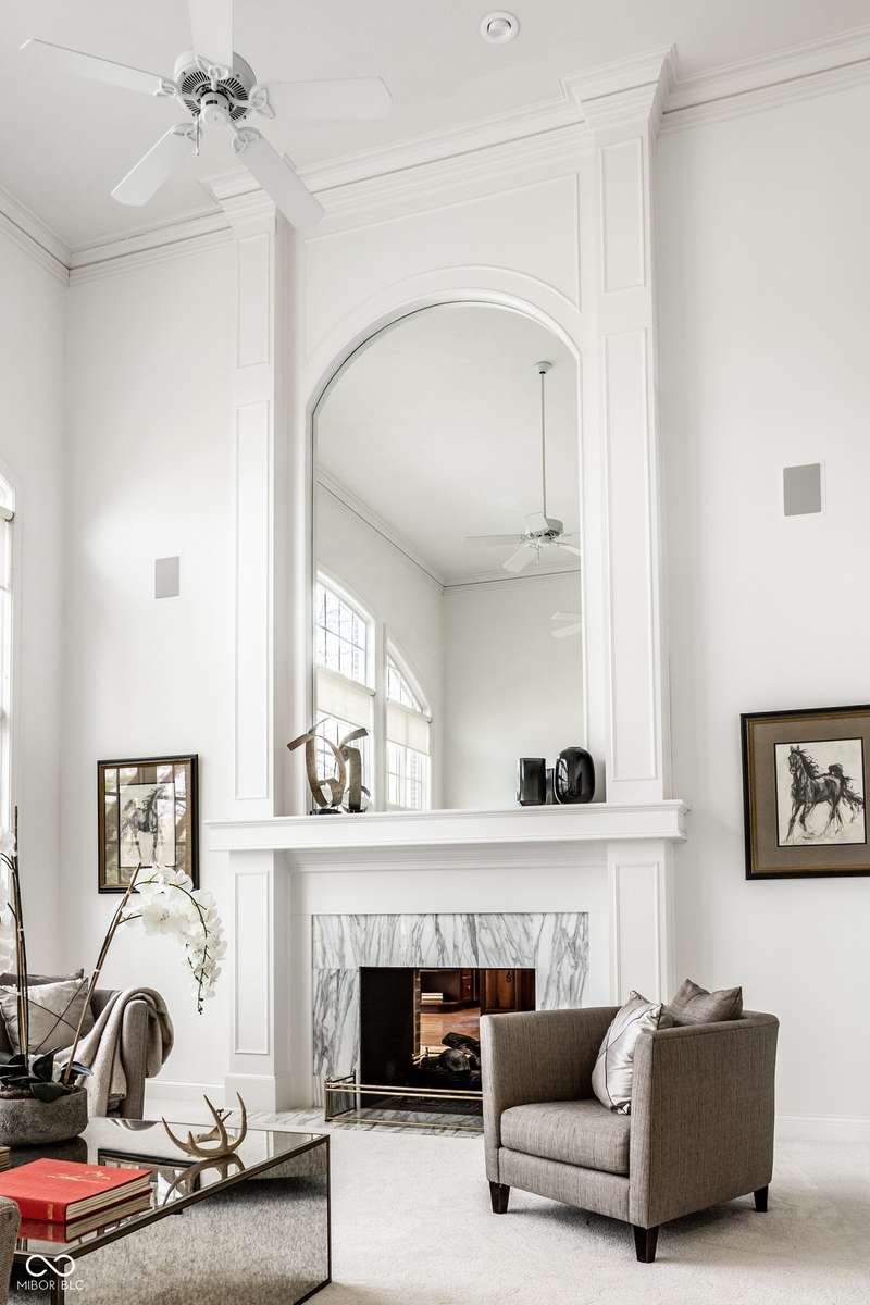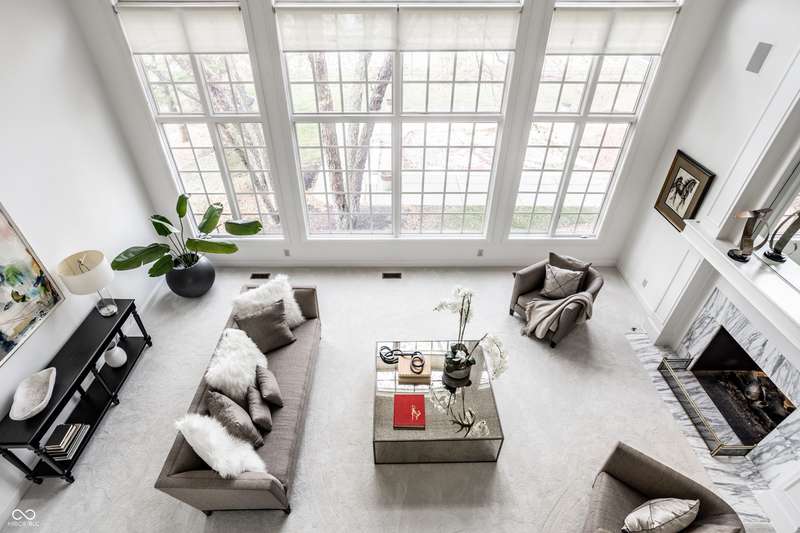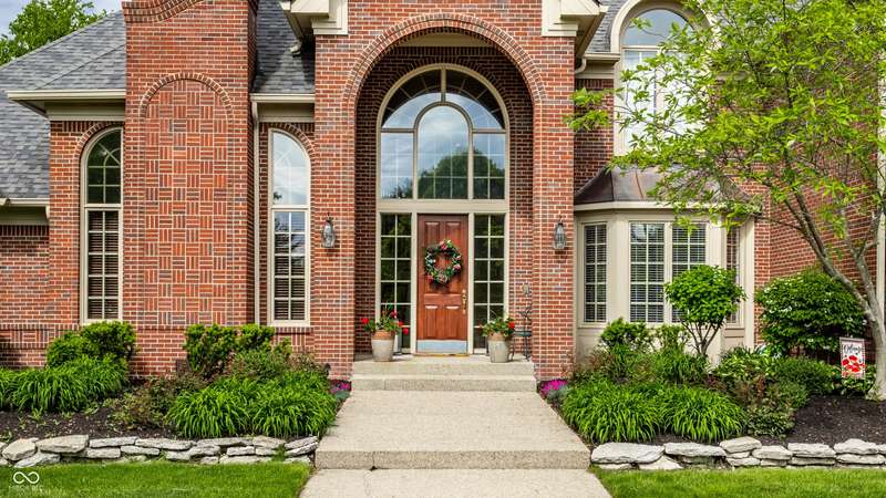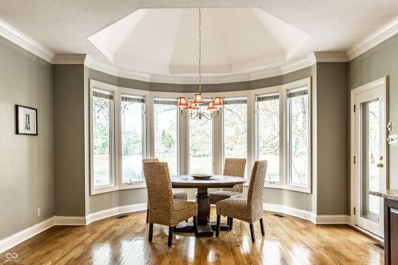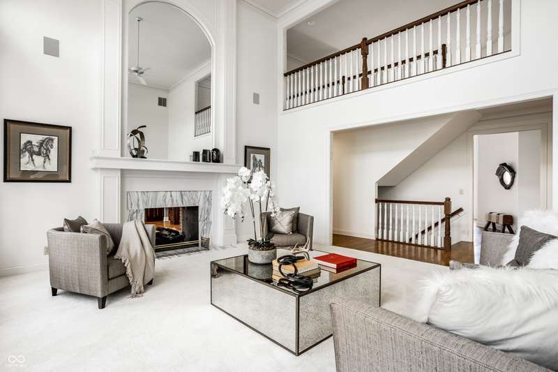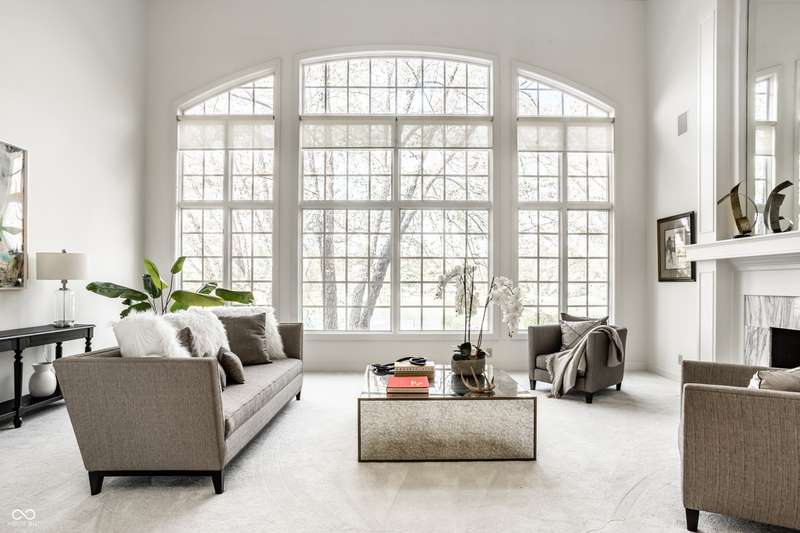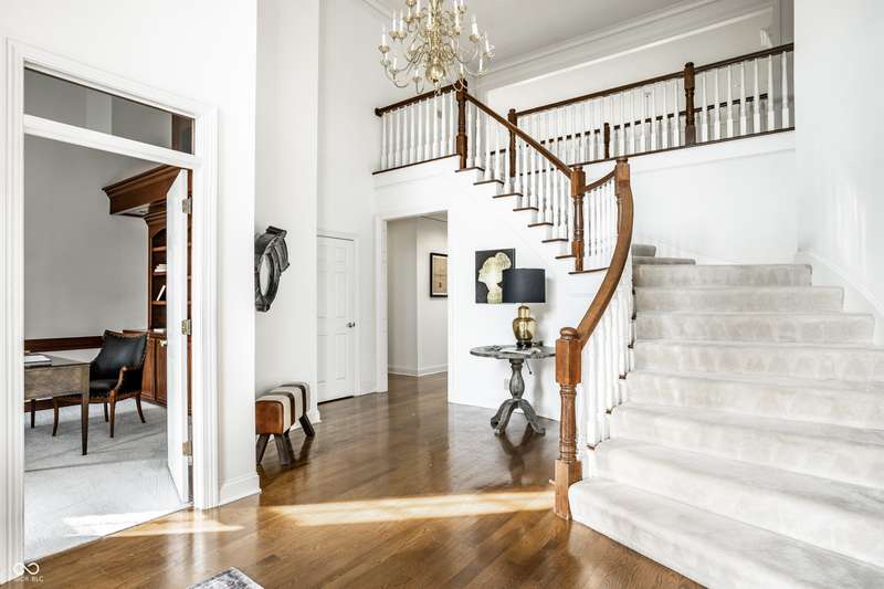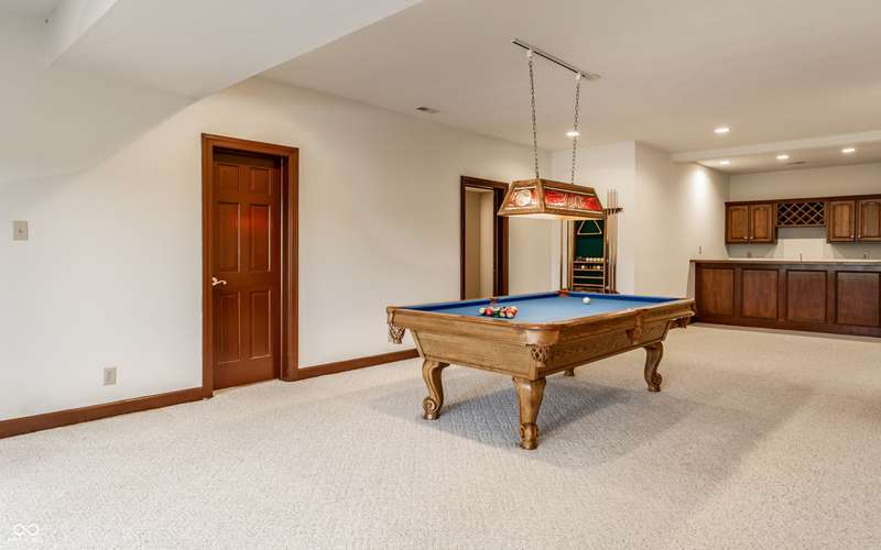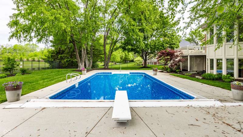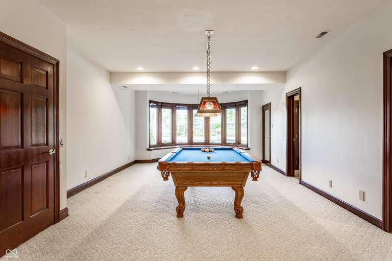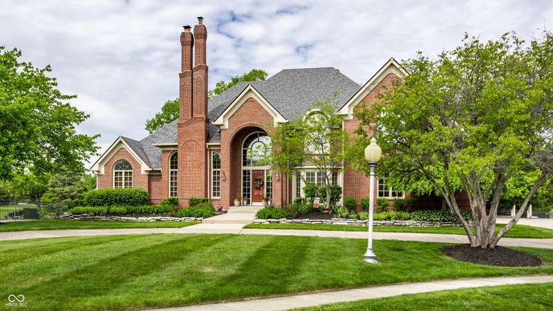 Situated on a premier water-view lot overlooking the pond and fountain inside the gated community of prestigious Windermere in Carmel, this expansive custom home offers both luxury and versatility. From the moment you enter, you'll notice the attention to detail and fine finishes, from gleaming hardwood floors to beautiful crown moldings. Recent updates include new carpeting on the main level and in two lower-level rooms, as well as fresh paint on the main level and upper hallway, giving the home a bright, refreshed feel throughout. The two-story great room is filled with natural light from a wall of windows and warmed by a two-sided gas fireplace shared with the cozy hearth room. The kitchen is well equipped for any chef, featuring a center island, ample counter and cabinet space, and a breakfast room overlooking the pond and fountain with access to the deck and screened porch. A formal dining room provides additional entertaining space. The main-floor primary suite is a serene retreat with vaulted ceilings, a relaxing ensuite bath, and a custom walk-in closet. Upstairs, three spacious bedrooms each include an ensuite bath and a walk-in closet. The walk-out lower level is designed for both fun and function, featuring a large family room with a wood-burning fireplace, an entertainment room equipped with a billiards table and a wet bar, guest quarters, an exercise room, a bonus/storage room, and an additional full bath that serves the pool. Accessibility is a highlight, with the home offering elevator access and handicap-friendly features, including ramps in the garage and pool area. Outside, the fully fenced rear yard features green space and a pool with a new liner and cover, all overlooking the tranquil pond and fountain. This one-of-a-kind home blends timeless craftsmanship with thoughtful updates, all in an exclusive gated community on one of Windermere's most desirable water-view lots.
