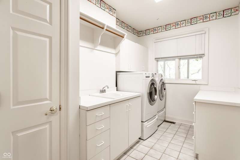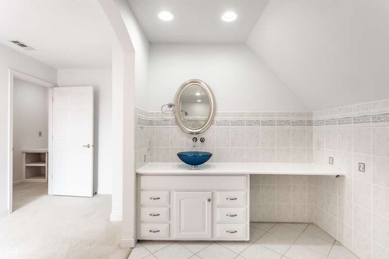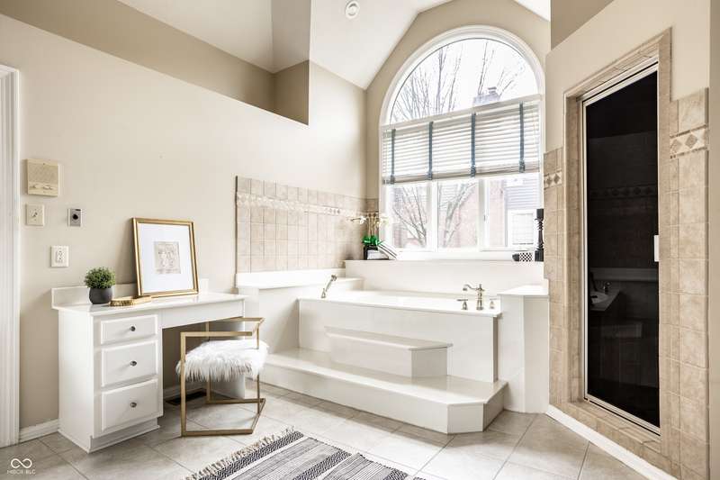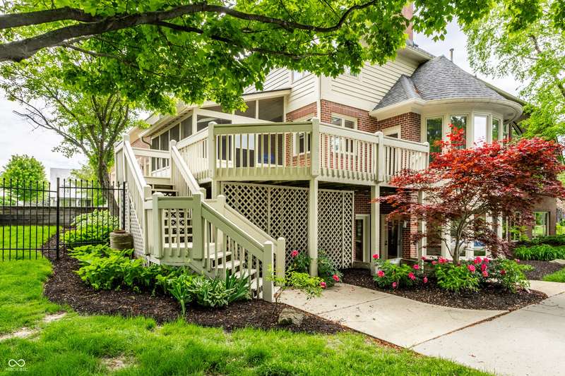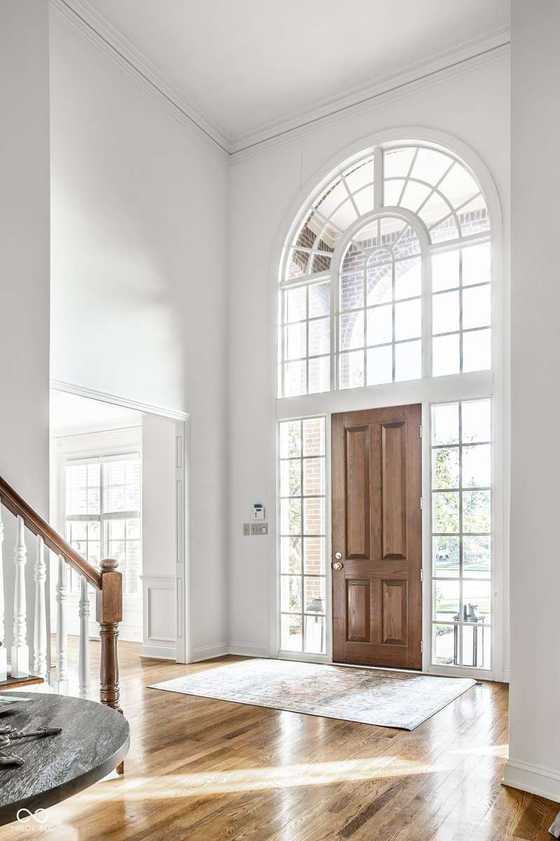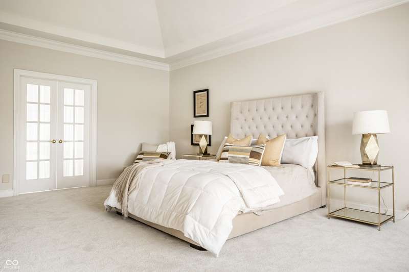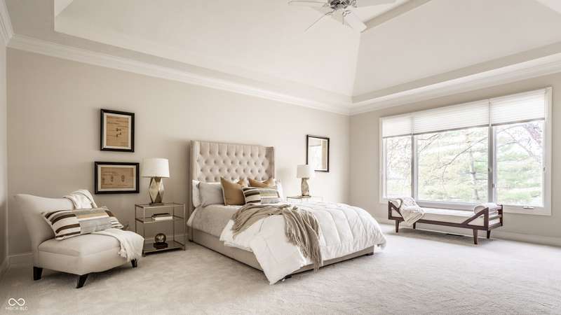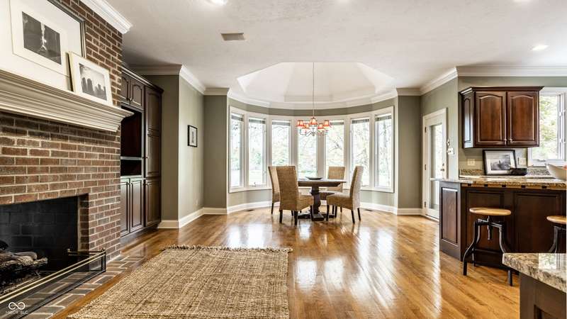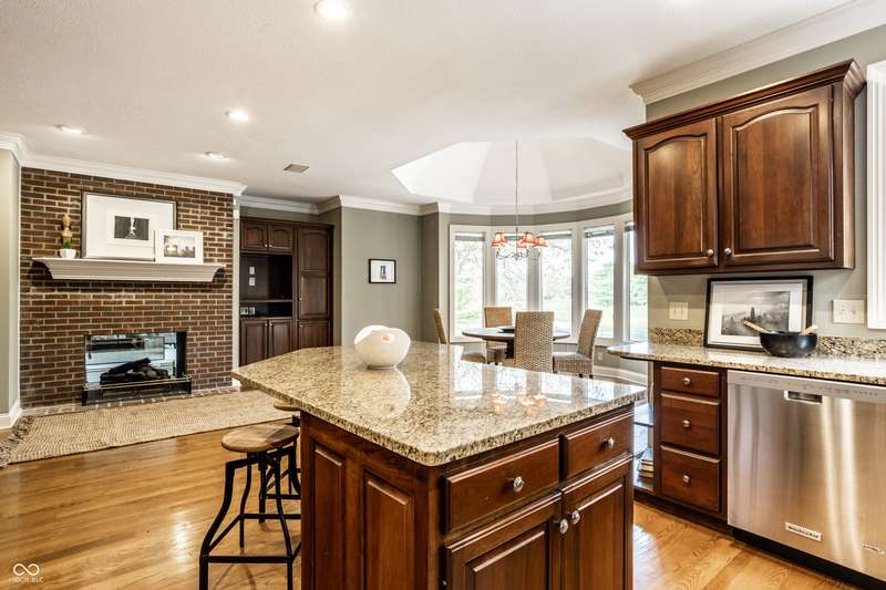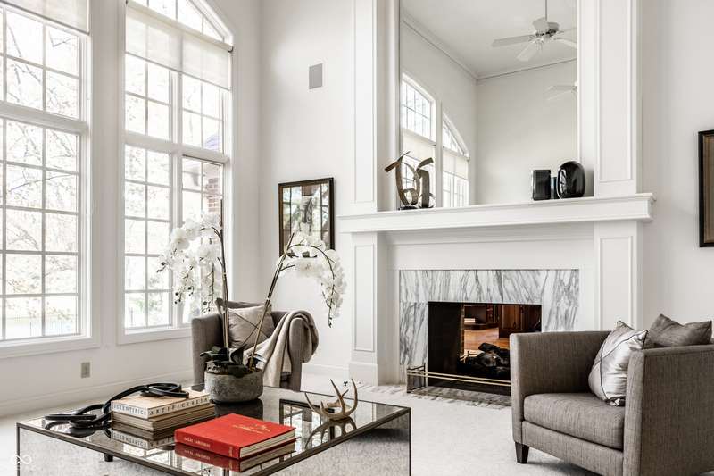 Situated on a premier water-view lot overlooking the pond and fountain inside the gated community of prestigious Windermere in Carmel, this expansive custom home offers both luxury and versatility. From the moment you enter, you'll notice the attention to detail and fine finishes, from gleaming hardwood floors to beautiful crown moldings. Recent updates include new carpeting on the main level and in two lower-level rooms, as well as fresh paint on the main level and upper hallway, giving the home a bright, refreshed feel throughout. The two-story great room is filled with natural light from a wall of windows and warmed by a two-sided gas fireplace shared with the cozy hearth room. The kitchen is well equipped for any chef, featuring a center island, ample counter and cabinet space, and a breakfast room overlooking the pond and fountain with access to the deck and screened porch. A formal dining room provides additional entertaining space. The main-floor primary suite is a serene retreat with vaulted ceilings, a relaxing ensuite bath, and a custom walk-in closet. Upstairs, three spacious bedrooms each include an ensuite bath and a walk-in closet. The walk-out lower level is designed for both fun and function, featuring a large family room with a wood-burning fireplace, an entertainment room equipped with a billiards table and a wet bar, guest quarters, an exercise room, a bonus/storage room, and an additional full bath that serves the pool. Accessibility is a highlight, with the home offering elevator access and handicap-friendly features, including ramps in the garage and pool area. Outside, the fully fenced rear yard features green space and a pool with a new liner and cover, all overlooking the tranquil pond and fountain. This one-of-a-kind home blends timeless craftsmanship with thoughtful updates, all in an exclusive gated community on one of Windermere's most desirable water-view lots.