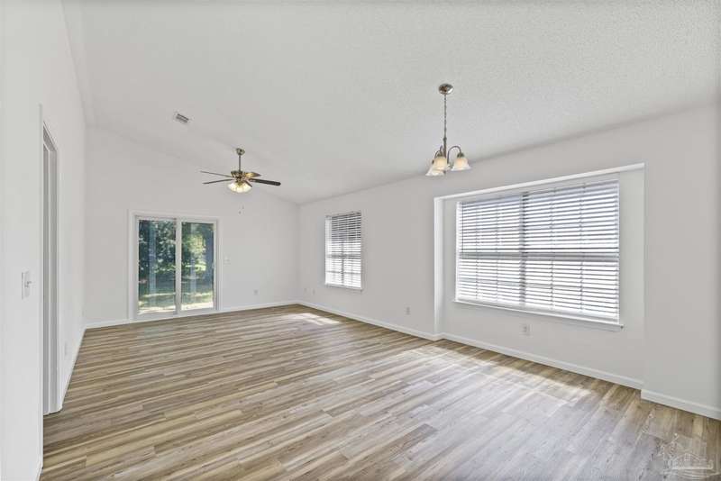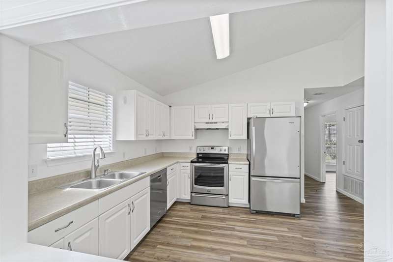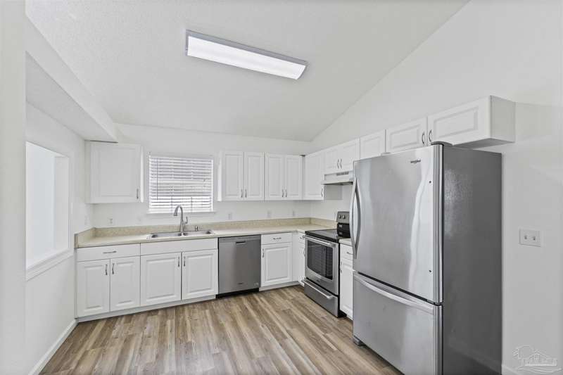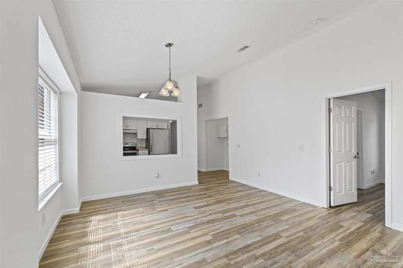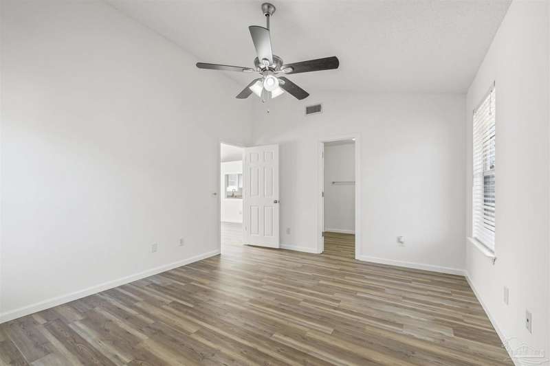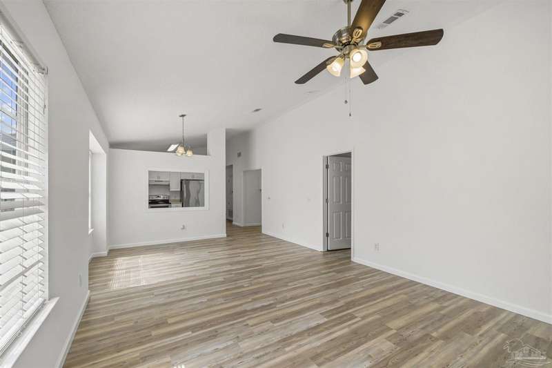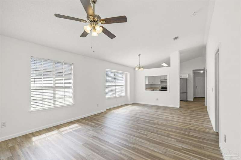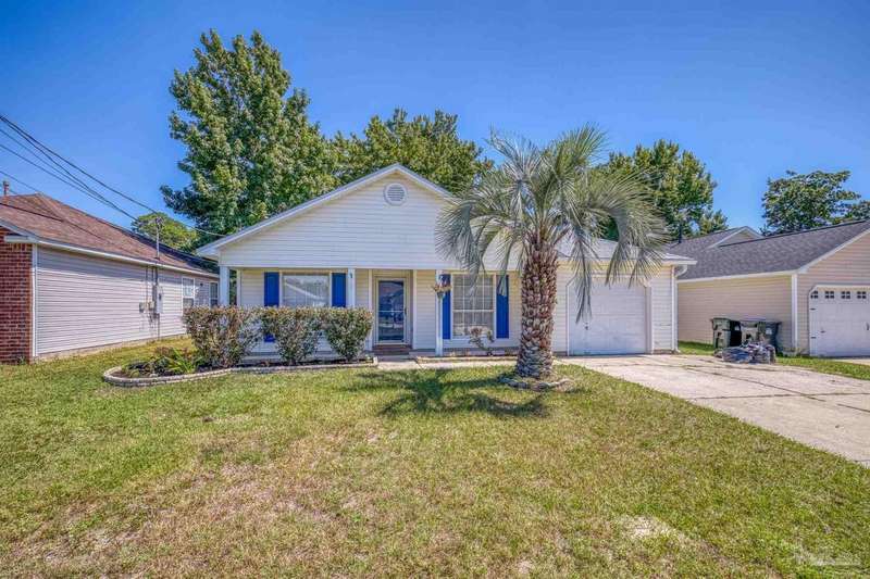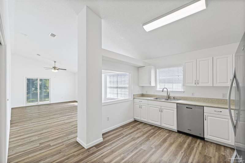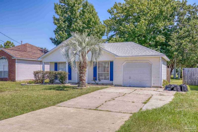 This 3 bedroom 2 bathroom home is MOVE IN READY! As you pull up to the home you're sure to notice the attached garage and spacious driveway. Of course, nothing says Florida like the palm tree in the front yard. Inside, you will find the guest rooms at the front of the home, offering separation from the primary bedroom in the back. Each guest room has generous floor space and closet space. The kitchen is the heart of this home, with stainless appliances, abundant counter and cabinet space and is open to your living and dining room. All the windows and sliding doors allow natural light to flood this open concept space. A new sliding door leads out to a patio and the backyard. Off the living room is the primary bedroom featuring an ensuite bathroom. The bathroom has a convenient linen closet and a HUGE walk-in closet. This home has BRAND NEW vinyl flooring that is continuous throughout the home. All the old tile was removed before new flooring was put down. All the walls and trim have been freshly painted as well offering a fresh clean space. Some lighting fixtures and mirrors have been replaced as well. The roof was replaced in 2020. This home can qualify for FHA, VA and conventional financing. Schedule your tour today and snag your own slice of Florida paradise.