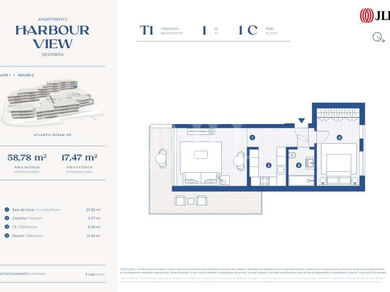 Apartamento T1 com 59 m2 de área bruta privativa, varanda, vista mar e um lugar de estacionamento, no Harbour View, em Sesimbra. O apartamento é composto por sala com varanda e vista mar, cozinha equipada, quarto e uma casa de banho. O Harbour View, distingue-se pela proximidade e valorização da natureza, proporcionando todas as comodidades e ambiente para uma maior conexão com a envolvente natural. Dispõe de um vasto leque de serviços nomeadamente receção, health club, piscina exterior, amplas áreas de lounge interiores e exteriores com vista panorâmica sobre o mar, jardim, terraços e sala de eventos. Localizado a 2 minutos driving distance da Praia do Ouro e a 5 minutos da praia de Sesimbra, a 10 minutos da Aldeia do Meco e Serra da Arrábida, a 20 minutos do Cabo Espichel, a 25 minutos do Portinho da Arrábida, 30 minutos de Setúbal, Seixal e Almada, a 35 minutos da Costa da Caparica e a 40 minutos da capital. O Harbour View está a 45 minutos do Aeroporto Internacional de Lisboa Humberto Delgado. Categoria Energética: A #ref:94362