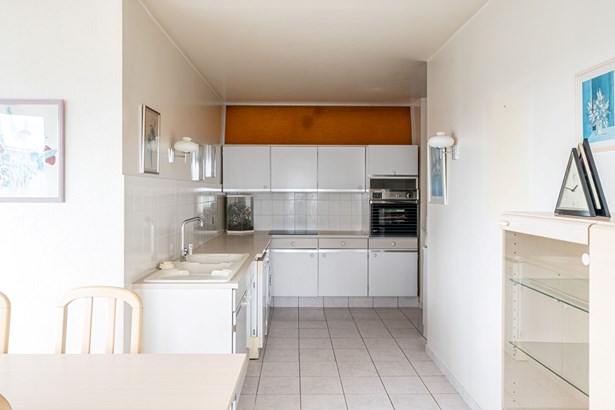 Upon entering, a spacious cloakroom and ample storage space optimize the space and enhance everyday comfort. The large kitchen, designed as a living space in its own right, impresses with its conviviality and generous proportions. The living room and two bedrooms, with their curved lines, benefit from abundant light thanks to large southeast-facing windows, which open the apartment to a clear and unobstructed panorama.