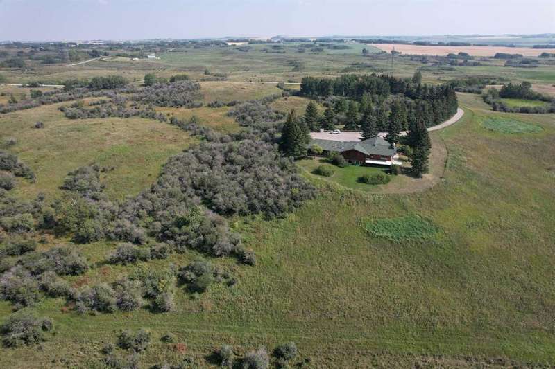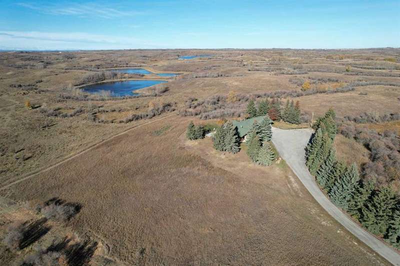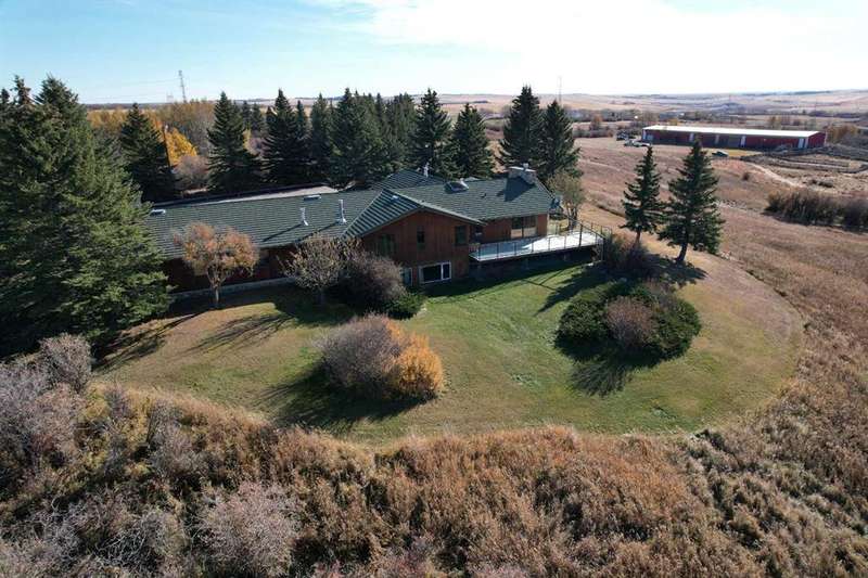 A once-in-a-lifetime opportunity on the iconic Jack Rabbit Trail! This extraordinary property offers a rare chance to own a piece of Alberta’s ranching legacy, complete with breathtaking, unobstructed valley & mountain views, a charming, period ranch house full of character, and your own private indoor riding arena. The property is the perfect blend of privacy, potential and character. The home was purposely built high on a hill to take in the amazing views and now sits on a proposed 11 +/- acre parcel (subdivision in progress). The home is wrapped in mature, thoughtfully designed landscaping planted in 1979. A security gate with ¼-mile paved driveway leads to a bungalow that captures the essence of country living. The 2,260 sq ft main floor (over 4,500 sq ft of total living space) is highlighted by beautiful stone exterior accents, vaulted ceilings, and generous proportions throughout. The home features 5 bedrooms and 3 full bathrooms, with a layout designed for both function & comfort. The kitchen is bright and spacious, featuring a large island, ample cabinetry & counter space. A large dining area & an expansive living room offers ideal space for gatherings. The center field stone fireplace adds warmth & ustic charm while the unique touches like The wagon-wheel staircase, solid woodwork, and original design elements bring a timeless, one-of-a-kind feel. Also on the main floor: an office, separate laundry room, & the primary bedroom with an updated ensuite, plus one additional bedroom. Downstairs, the fully developed lower level offers three more generous bedrooms, a large recreation room with a snooker table (included), another wood burning fireplace, and plenty of storage. The outdoor living is equally impressive, with both a southwest-facing deck & a welcoming east-facing front porch complete with pergola— ideal for relaxing mornings or evening entertaining. For the hobbyist or car enthusiast, the heated and drywalled 4-car garage is fully equipped with built-in shelving and workbenches. The newly full fenced 11 ac. home site is mostly native grass pasture. The remainder of the land is also native pasture with excellent grass, trees, water & super perimeter fences. These beautiful rolling hills are home to a variety of wildlife & make for incredible riding & recreation - as does the steel-frame riding arena & barn complex built in 1985. Strong built structure offers a total of approx. 20,000 square feet of interior space, including a lean-to and 2,400 sq. ft. mezzanine/loft area. The main arena measures roughly 80' x 200', providing ample space for training, events, or year-round equestrian activities. The barn features in-floor heating. Whether you're looking to restore the home’s original beauty, modernize it with a fresh vision, or create a custom estate that bridges past and present, this property offers unmatched potential, privacy, and views - all just minutes from Airdrie amenities, 45 minutes to downtown Calgary yet worlds away in peace and charm.